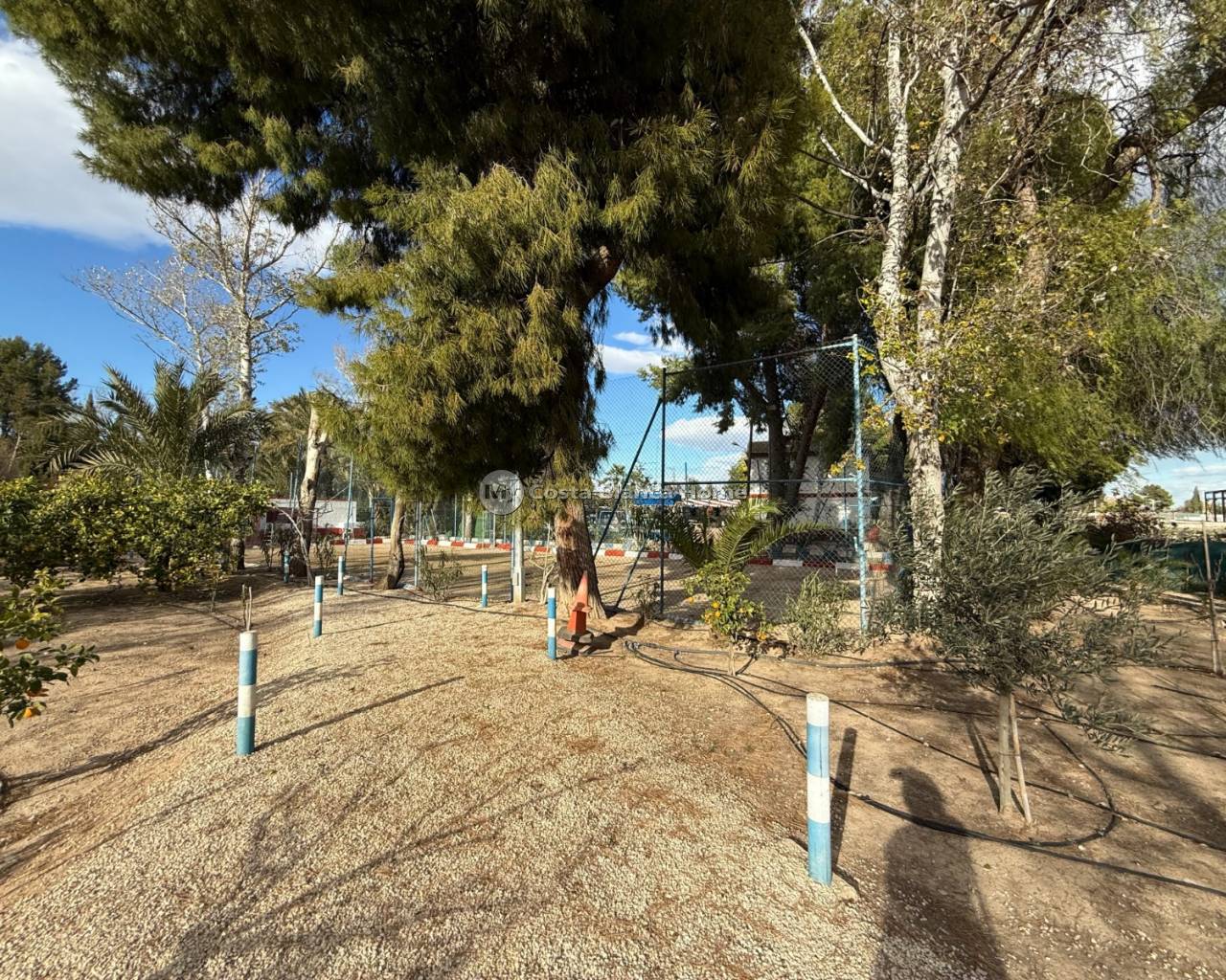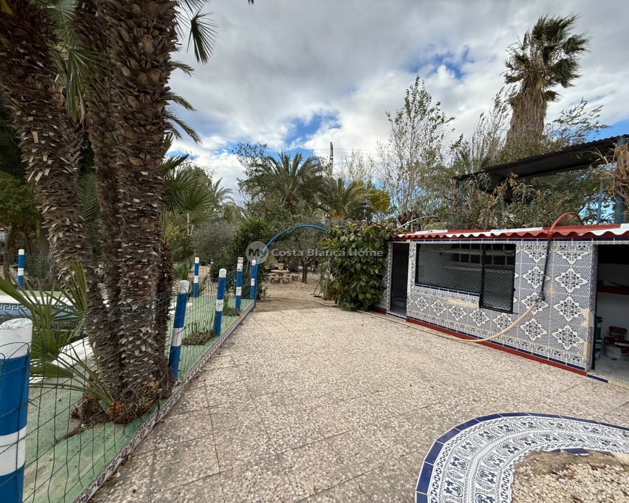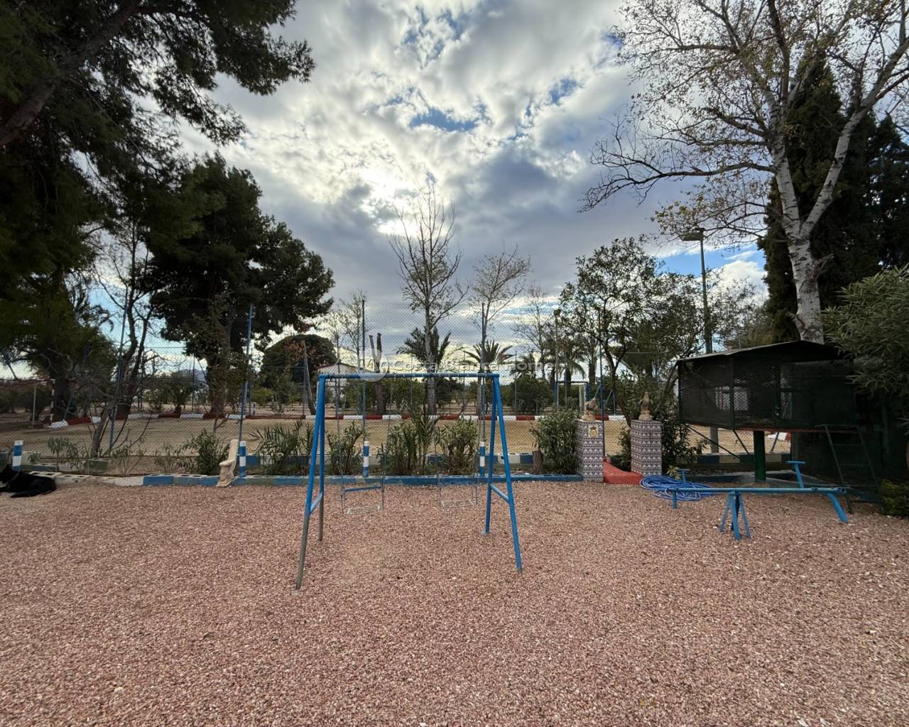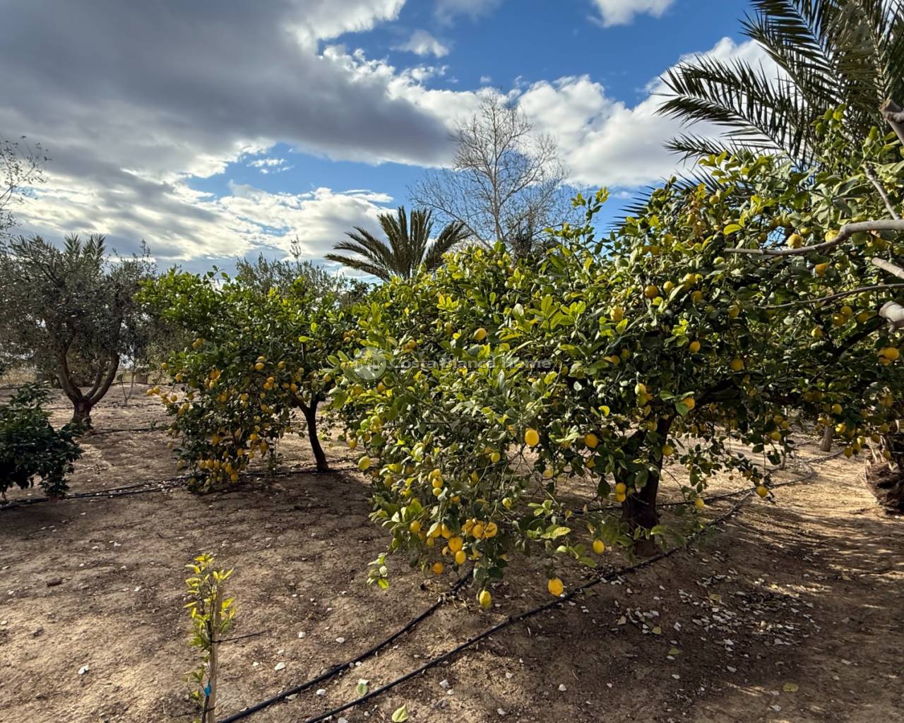 Villa for sale in Crevillente (Alicante), 220 m2 house, distributed in; Upper floor: living room, kitchen, three bedrooms, a bathroom, living room with fireplace, Ground floor: garage-warehouse with cold storage, 9,000 m2 plot, pond, well, drip irrigation system, swimming pool, kitchen-barbecue with toilet, multipurpose court, small warehouse-garage