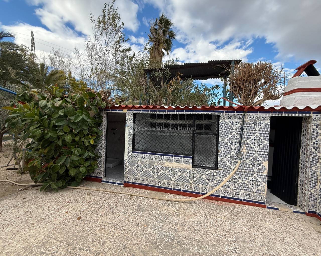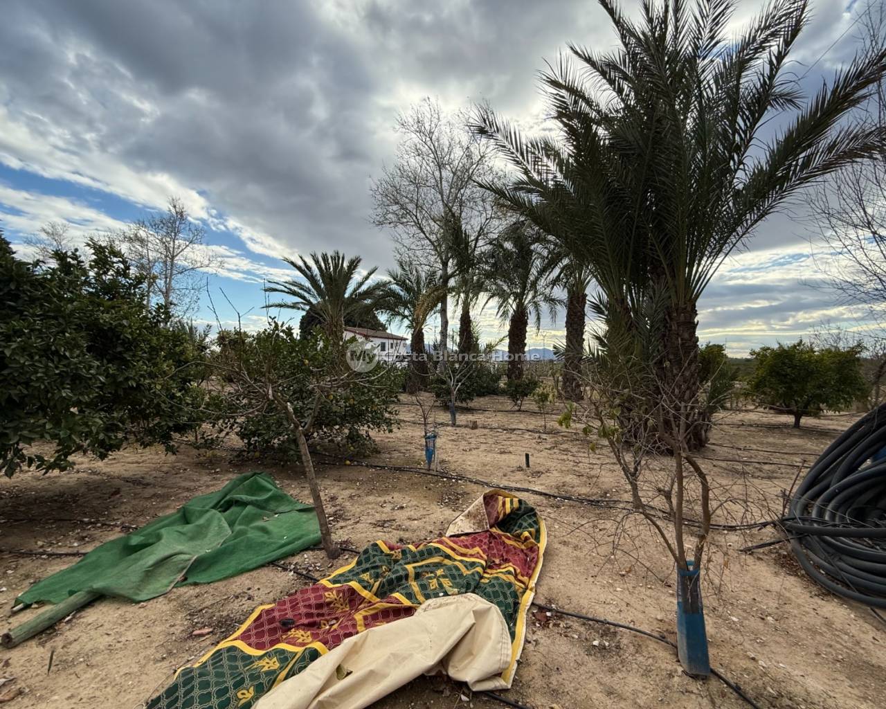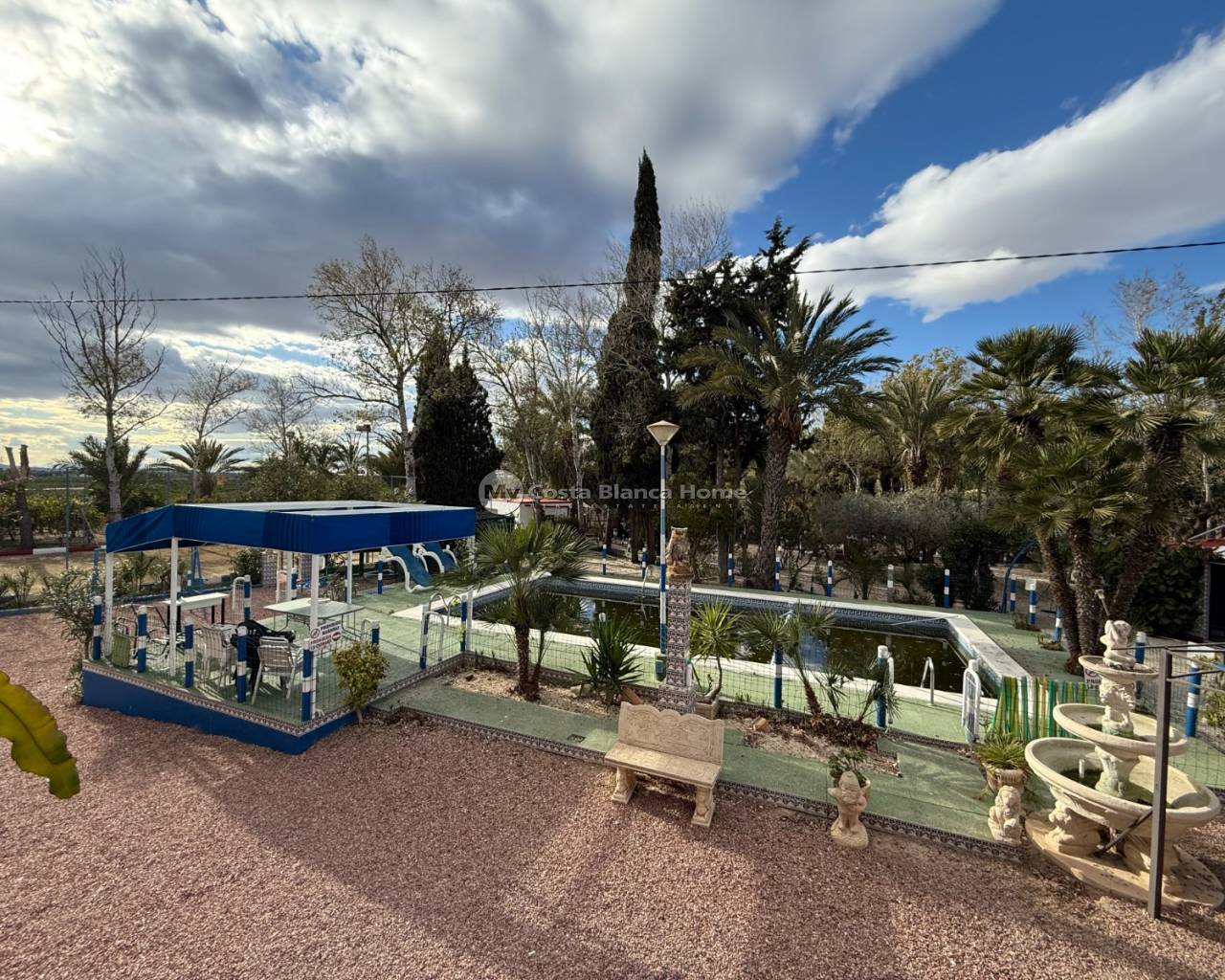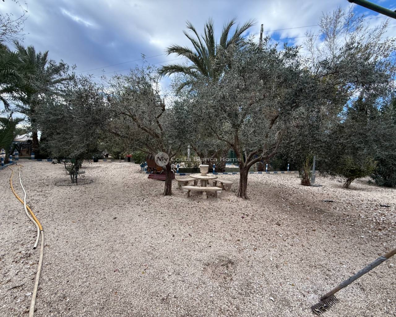 Villa for sale in Crevillente (Alicante), 220 m2 house, distributed in; Upper floor: living room, kitchen, three bedrooms, a bathroom, living room with fireplace, Ground floor: garage-warehouse with cold storage, 9,000 m2 plot, pond, well, drip irrigation system, swimming pool, kitchen-barbecue with toilet, multipurpose court, small warehouse-garage