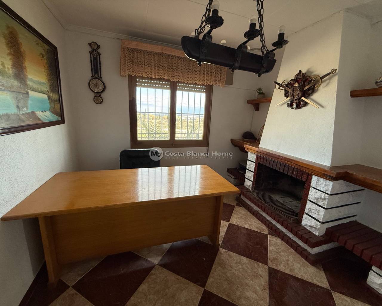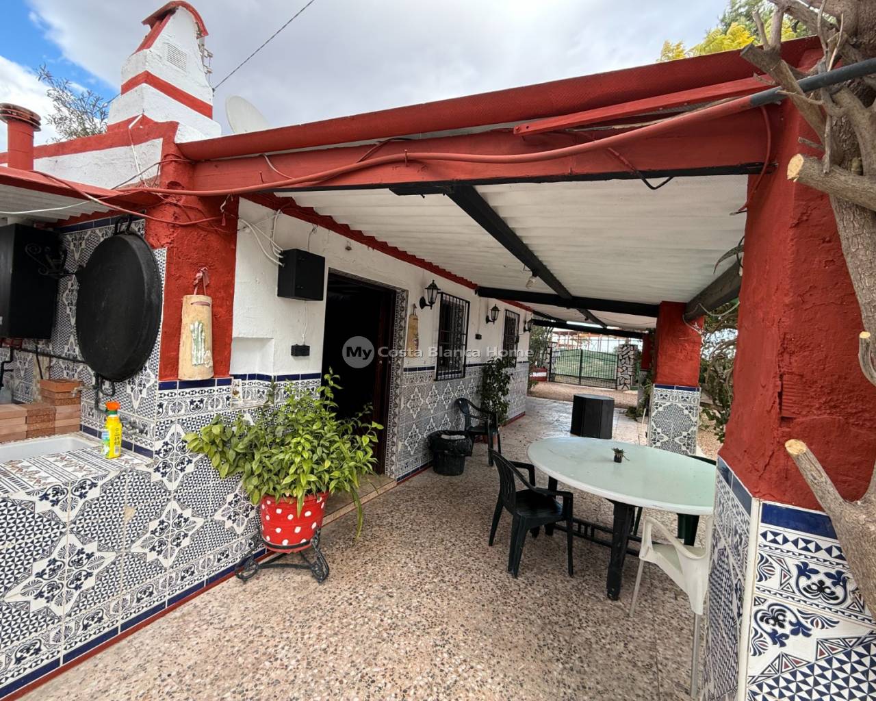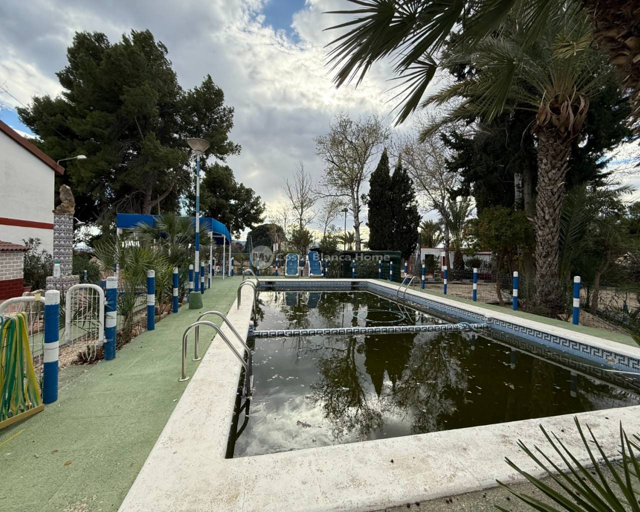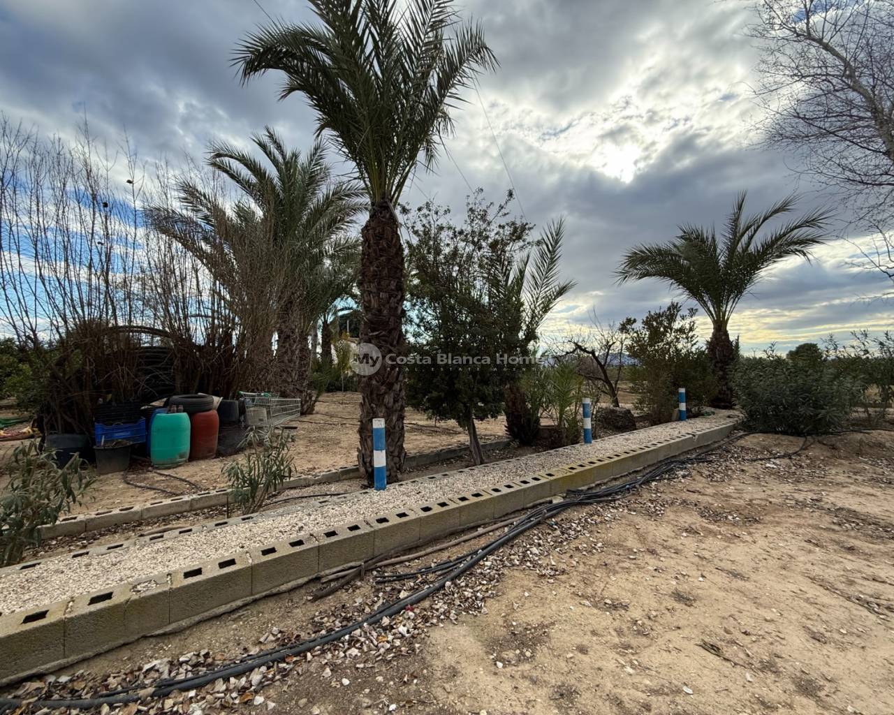 Villa for sale in Crevillente (Alicante), 220 m2 house, distributed in; Upper floor: living room, kitchen, three bedrooms, a bathroom, living room with fireplace, Ground floor: garage-warehouse with cold storage, 9,000 m2 plot, pond, well, drip irrigation system, swimming pool, kitchen-barbecue with toilet, multipurpose court, small warehouse-garage