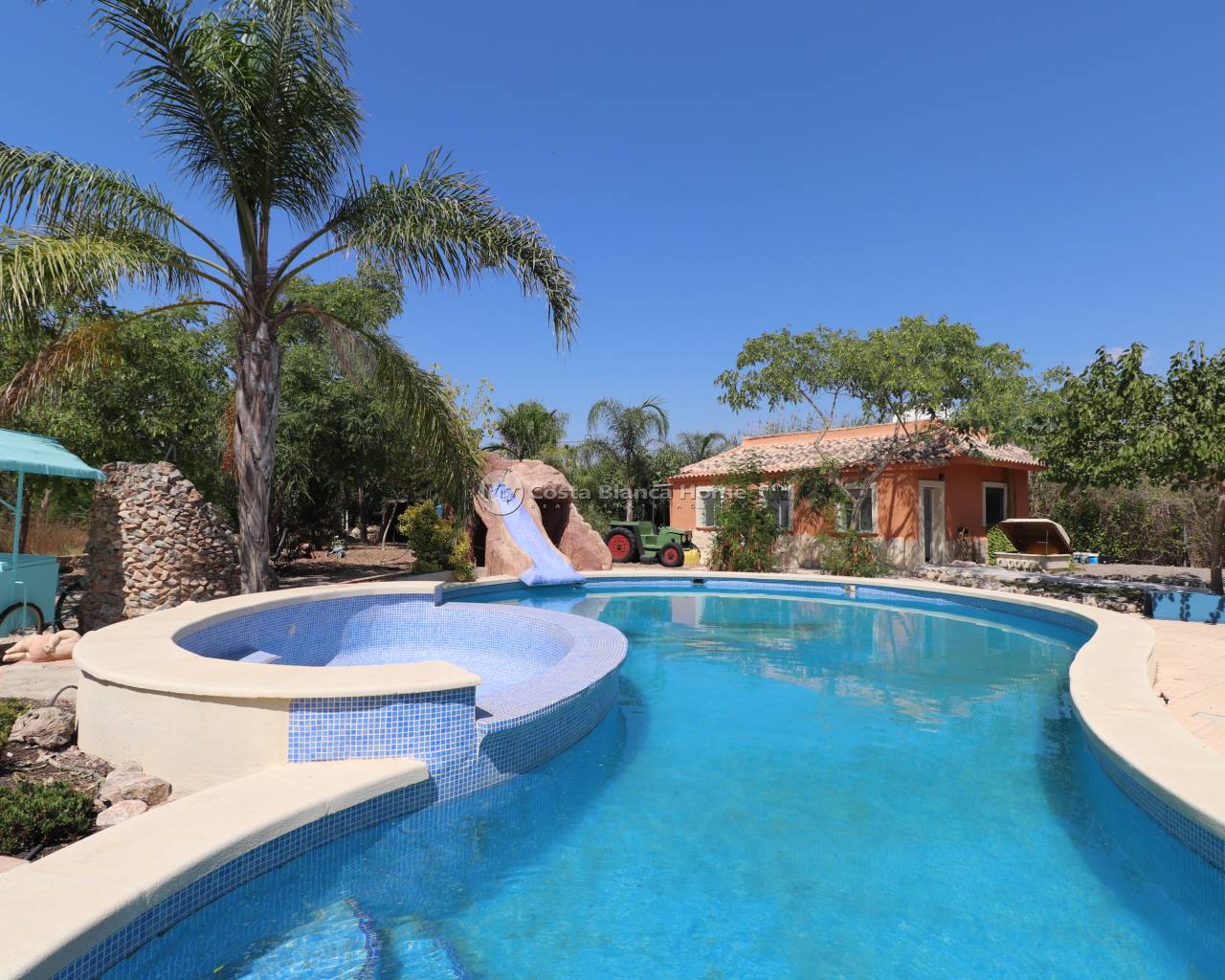 Cette superbe propriété de campagne de sept chambres de conception architecturale à Catral est située dans la paisible communauté agricole de Vega Baja, près de Dolores. En 10 minutes à pied, vous pourrez rejoindre la ville voisine de Dolores, où vous trouverez toutes les commodités et installations locales, tandis que les plages sont à environ 15-20 minutes en voiture ! Cette propriété fascinante, originale et tout à fait unique est pleine de caractère et présentée avec goût, approchée par une longue allée, flanquée de beaux arbres Jacaranda. Une propriété spacieuse avec une cour/entrée de style français souhaitable, des poutres apparentes et des plafonds voûtés, avec des fenêtres à double aspect partout, offrant une brise croisée rafraîchissante pendant les mois les plus chauds. Comprenant dans la Villa Principale d'une belle entrée ; couloir; cuisine ouverte entièrement équipée de taille familiale, avec péninsule caractéristique et placards de qualité + électroménagers ; salle à manger, parfaite pour organiser des fêtes, bénéficiant de plusieurs doubles portes donnant sur la véranda et une grande terrasse/véranda ouverte ; salon désirable, grand mais confortable; actuellement trois chambres, la master avec salle de bain en suite; un bureau (ou quatrième chambre); chambre annexe séparée au premier étage, accessible par un escalier en colimaçon depuis la 2ème cour; une salle de douche familiale; et un vestiaire. De la véranda, vous avez de superbes vues sur la piscine privée, les jardins, au-delà sur les montagnes et la campagne ! L'annexe se compose d'une villa de 2 chambres, avec leurs propres salles de douche, une cependant également avec kitchenette ; plus un solarium sur le toit! Il y a un garage, qui a été converti actuellement en atelier d'art, avec kitchenette, salle de douche et mezzanine. Le jardin bénéficie d'une maison d'été avec coin repas, cuisine extérieure, barbecue, four à pizza, piscine privée de 90 m2 + piscine pour enfants, avec toboggan artificiel, étang, abri de voiture, 2 paddocks, écuries possibles, jardins plantés, abri de travail, terrain de pétanque piste et plus... Les extras doivent inclure les auvents, l'espace de rangement, la climatisation, le chauffage central, la chaufferie, la grange à foin, les grils, le vitrage feuilleté, la fosse septique, l'eau courante et l'électricité, la véranda et bien plus encore... Simplement Wow ! Demandes sérieuses seulement!