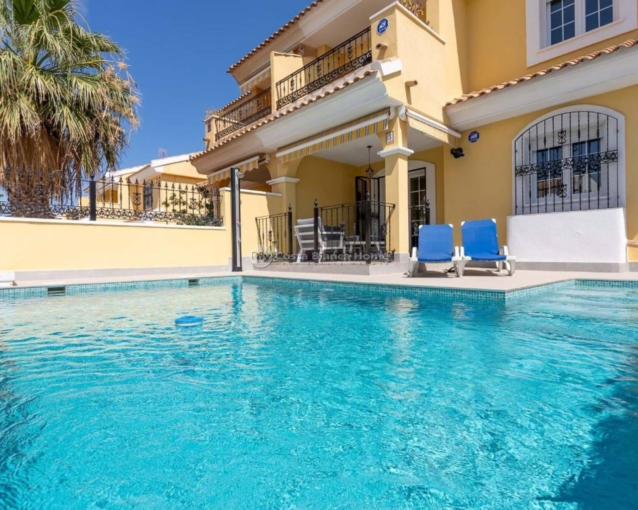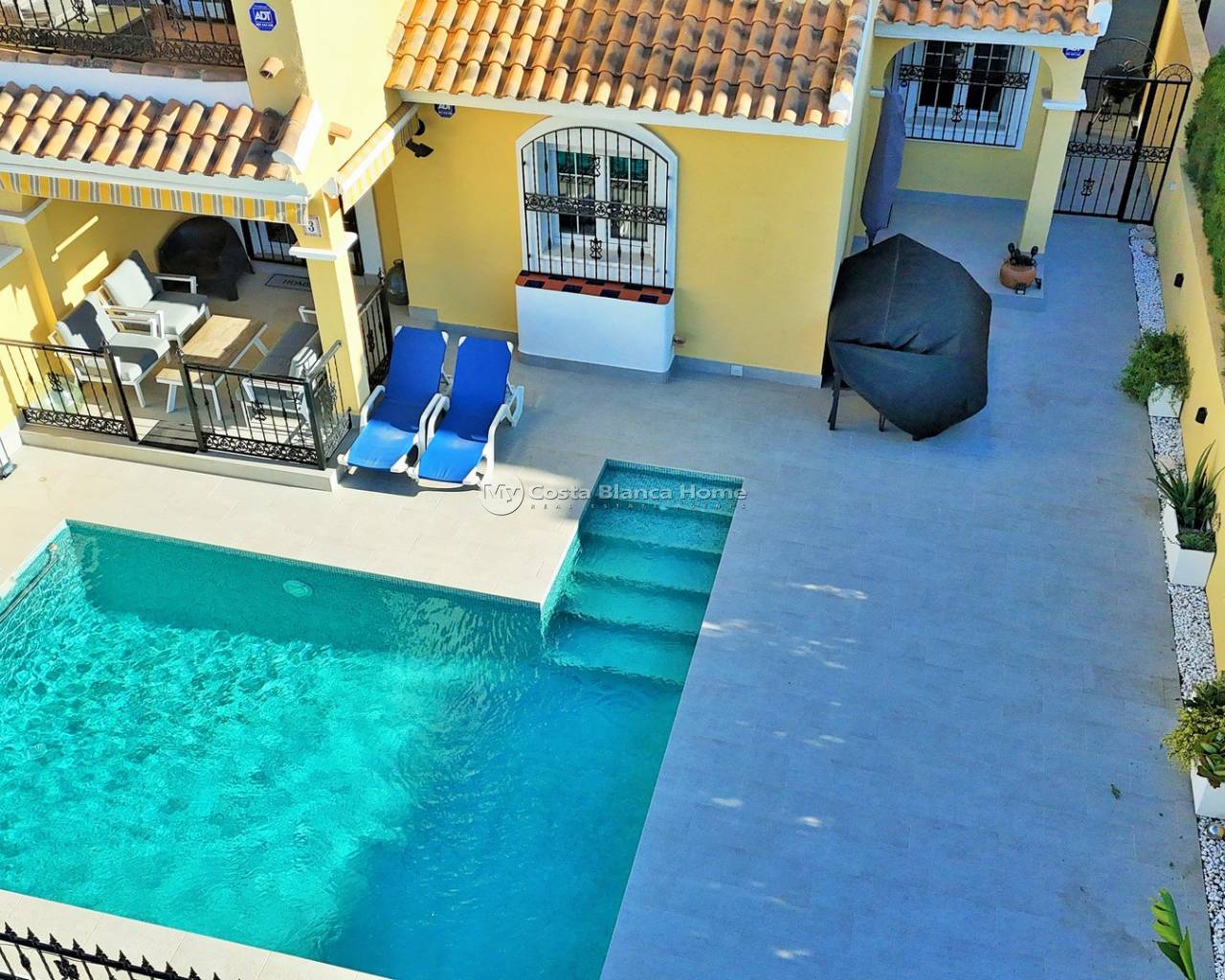 Située dans la communauté résidentielle prisée de Costa Flamenca Golf à Los Dolses, cette villa jumelée de 3 chambres et 2 salles de bains offre un excellent équilibre entre confort, style et vie en plein air. À distance de marche du centre commercial La Zenia Boulevard et des restaurants, et à quelques minutes des plages primées de l’Orihuela Costa, elle convient aussi bien comme résidence permanente que maison de vacances. La villa a été rénovée avec soin, avec de nouvelles fenêtres, portes extérieures et une magnifique salle de bain principale, ainsi qu’une piscine privée. L’intérieur est lumineux, accueillant et prêt à être emménagé. Le rez-de-chaussée comprend une chambre double, une salle de douche moderne et un salon ouvert spacieux. Un poêle à pellets assure une chaleur agréable en hiver, tandis que la cuisine moderne donne sur une terrasse arrière servant de buanderie. L’étage dispose de deux grandes chambres doubles, dont la suite principale avec terrasse privée donnant sur la piscine. La salle de bain familiale rénovée comprend une douche à l’italienne élégante. Prestations supplémentaires : climatisation complète, espaces extérieurs soignés et parking privé. Une maison à apprécier dès le premier jour.
