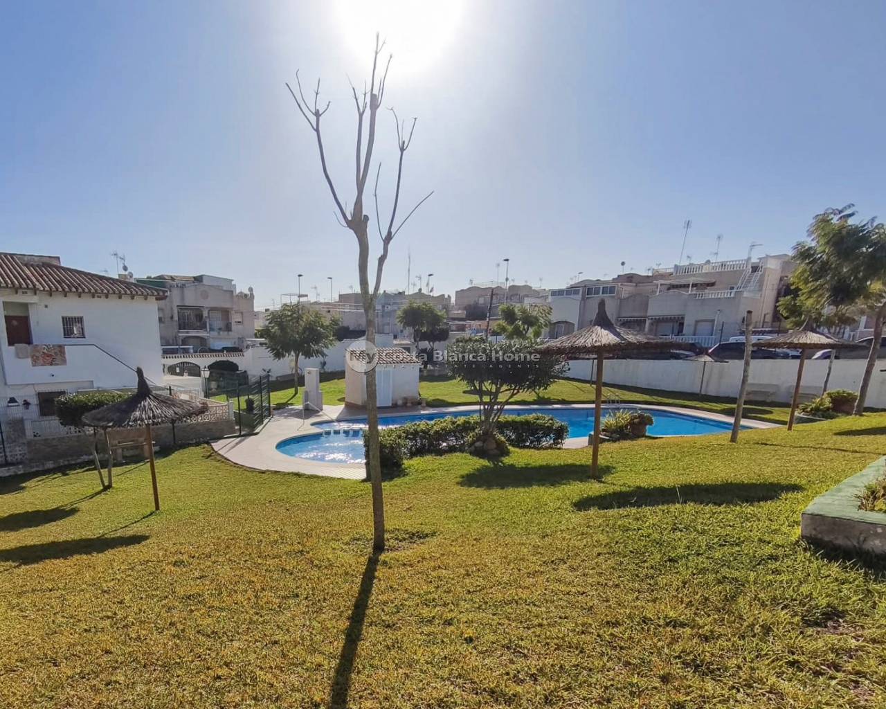 Ce charmant bungalow-duplex mitoyen est situé à Torrevieja, dans le quartier résidentiel bien établi de Los Balcones, au sein du complexe Lago Jardín II. L’environnement est calme et soigné, à seulement 4 km des plages de Torrevieja et à proximité de nombreux services tels que supermarchés, restaurants, bars et zones de loisirs, idéal pour y vivre toute l’année ou pour des séjours de vacances. La propriété est répartie sur deux niveaux et dispose d’un jardin privatif à l’avant d’environ 30 m². L’accès au bungalow se fait par une rue piétonne, garantissant tranquillité et intimité. L’accès en véhicule jusqu’à la maison n’est pas possible ; le stationnement se fait dans les zones prévues à proximité, avec un accès recommandé par la rue Laguna Verde. Le rez-de-chaussée comprend un salon-salle à manger lumineux, une cuisine ouverte avec bar et mobilier neuf, incluant meubles hauts et bas, plan de travail en marbre noir, hotte aspirante en acier inoxydable et chauffe-eau électrique, ainsi qu’une chambre et une salle de bain complète. À l’étage supérieur, accessible par un escalier intérieur, se trouvent deux chambres communicantes donnant accès à une grande terrasse-balcon avec vues agréables, idéale pour profiter du climat. Le jardin avant combine une zone carrelée et une zone en gravier blanc et dispose actuellement d’un gazebo en bois. La résidence offre également une piscine commune et des espaces verts partagés. La superficie construite est de 55 m², avec une parcelle de jardin de 30 m² à l’avant.