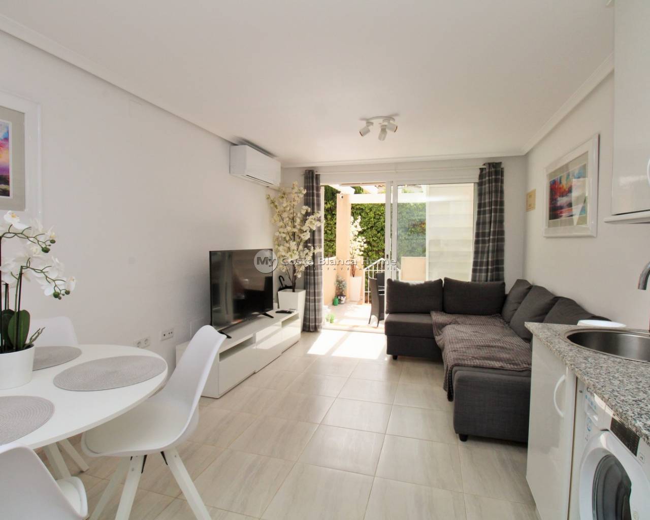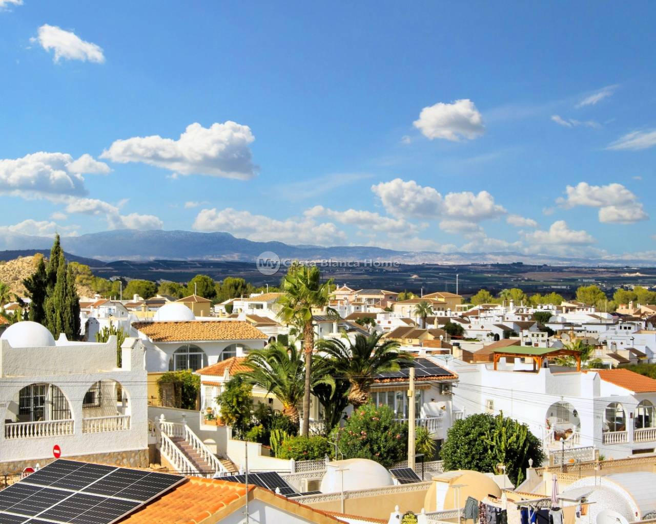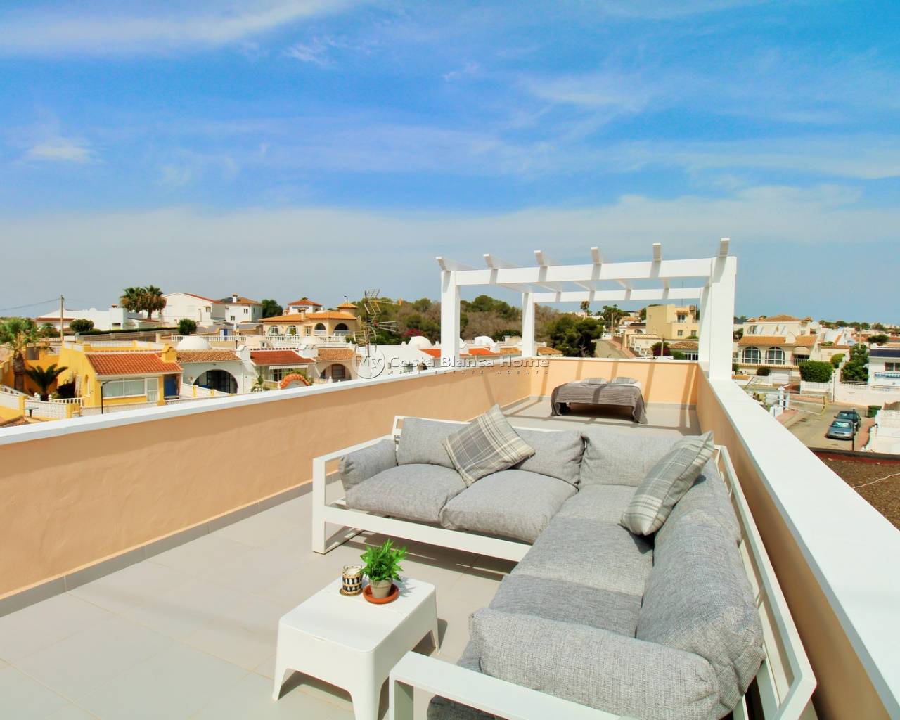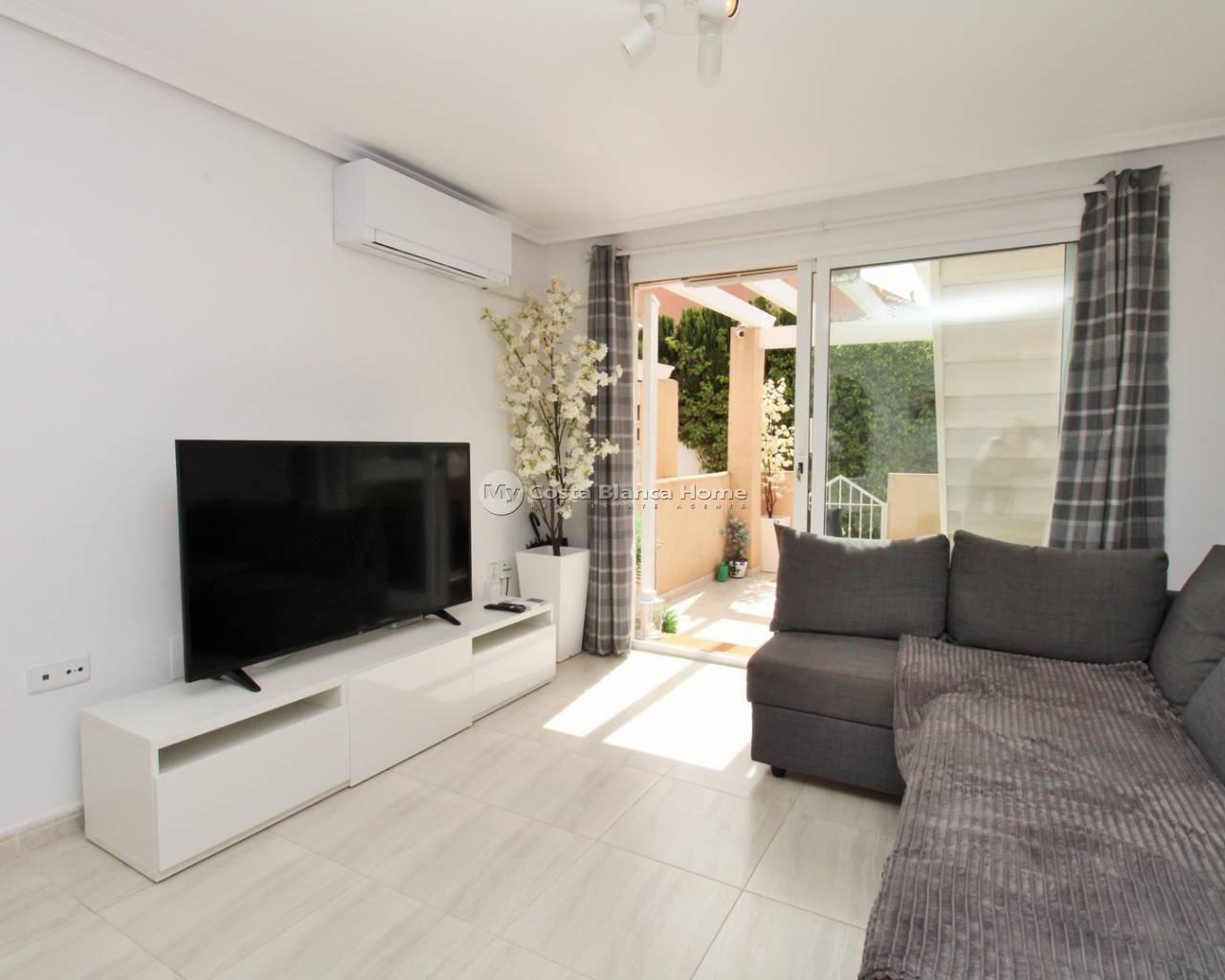 Ce charmant bungalow de plain-pied est situé dans un quartier calme et très recherché de Villamartin, à quelques minutes à pied des bars, restaurants, commerces et transports publics. Lumineuse et parfaitement entretenue, la propriété est vendue partiellement meublée avec électroménagers, prête à être habitée immédiatement. La maison offre un spacieux salon-salle à manger ouvert avec cuisine moderne équipée, créant un espace de vie confortable et fonctionnel. Elle comprend une chambre double avec placards intégrés et une salle de bain élégante entièrement équipée. Les grandes fenêtres apportent beaucoup de lumière naturelle, donnant à la maison une atmosphère lumineuse et agréable. À l’avant, une terrasse privée carrelée constitue un endroit idéal pour profiter du climat méditerranéen. Un escalier extérieur mène à un grand solarium privé sur le toit, offrant des vues dégagées sur la mer et la campagne environnante, parfait pour se détendre ou recevoir. La propriété est située dans une rue privée très calme sans circulation, offrant tranquillité tout en restant proche des commodités. Elle bénéficie également de la fibre internet très haut débit (FTTH) et, sans piscine communautaire, les charges annuelles restent faibles. À quelques minutes à pied se trouvent le nouveau Marimba Blue pool bar avec grande piscine ainsi qu’un nouveau mini-golf, parfait pour les sorties décontractées. Les plages de Orihuela Costa, le centre commercial Zenia Boulevard et plusieurs terrains de golf sont accessibles en moins de 10 minutes en voiture, ce qui en fait une résidence de vacances idéale, un investissement locatif ou une résidence principale.