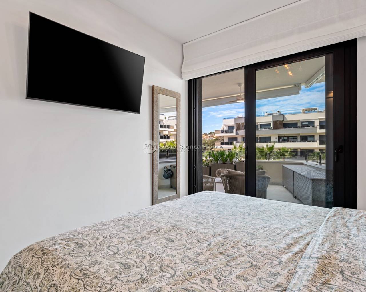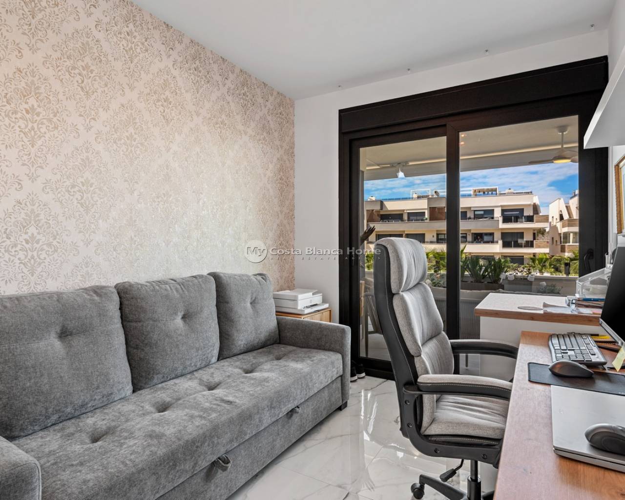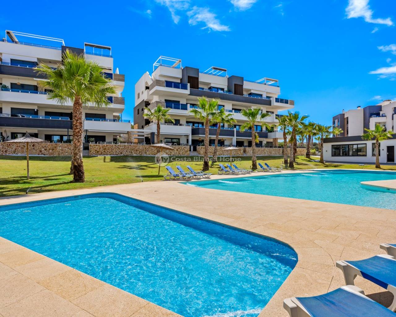 Appartement de luxe dans le Resort Amanecer X, situé dans le quartier prisé de Los Altos à Orihuela Costa. Cet appartement moderne et élégant, livré en 2024, représente une excellente opportunité comme résidence secondaire, habitation principale ou investissement avec un fort potentiel locatif. L’appartement dispose d’un lumineux séjour ouvert avec cuisine et espace salle à manger, conçu pour optimiser l’espace et la lumière naturelle. De grandes baies vitrées créent une atmosphère aérée et donnent un accès direct à une spacieuse terrasse privée, permettant une parfaite continuité entre intérieur et extérieur. La cuisine est entièrement équipée avec des appareils modernes et présente une finition contemporaine et épurée. Il comprend deux grandes chambres avec placards intégrés, situées côté terrasse, ainsi que deux salles de bains modernes avec des finitions de haute qualité. L’appartement est vendu entièrement meublé et offre une surface totale de 65 m² avec une disposition fonctionnelle et équilibrée. L’un des atouts majeurs est la grande terrasse privée de plus de 25 m², offrant une vue sur les jardins paysagers et la piscine commune. Grâce à son orientation sud-ouest, elle bénéficie d’un excellent ensoleillement, idéale pour se détendre ou prendre ses repas en extérieur. Situé au premier étage du bâtiment numéro 8 avec ascenseur, l’appartement comprend également une place de parking souterrain et un espace de rangement privé. Il est équipé de la climatisation, d’un système Airzone, du chauffage au sol dans les salles de bains et de volets électriques, garantissant un confort toute l’année. Il est en parfait état, entièrement meublé et prêt à emménager. Les résidents d’Amanecer X profitent d’un cadre de type resort avec une grande piscine commune, une piscine pour enfants, une salle de sport entièrement équipée, ainsi qu’un jacuzzi et un sauna, le tout entouré de magnifiques jardins tropicaux adaptés aux personnes à mobilité réduite. L’emplacement est très pratique : restaurants, cafés et supermarchés sont accessibles à pied, et le centre commercial La Zenia Boulevard se trouve à quelques minutes en voiture. Les amateurs de golf trouveront plusieurs parcours à proximité, dont Villamartín Golf à 5 minutes, Real Club de Golf Campoamor et Las Ramblas Golf à environ 10 minutes, et le prestigieux Las Colinas Golf & Country Club à environ 15 minutes. Les plages de sable d’Orihuela Costa sont accessibles en moins de 10 minutes. Les aéroports d’Alicante (45 min) et de Murcie (35–40 min) sont facilement accessibles.