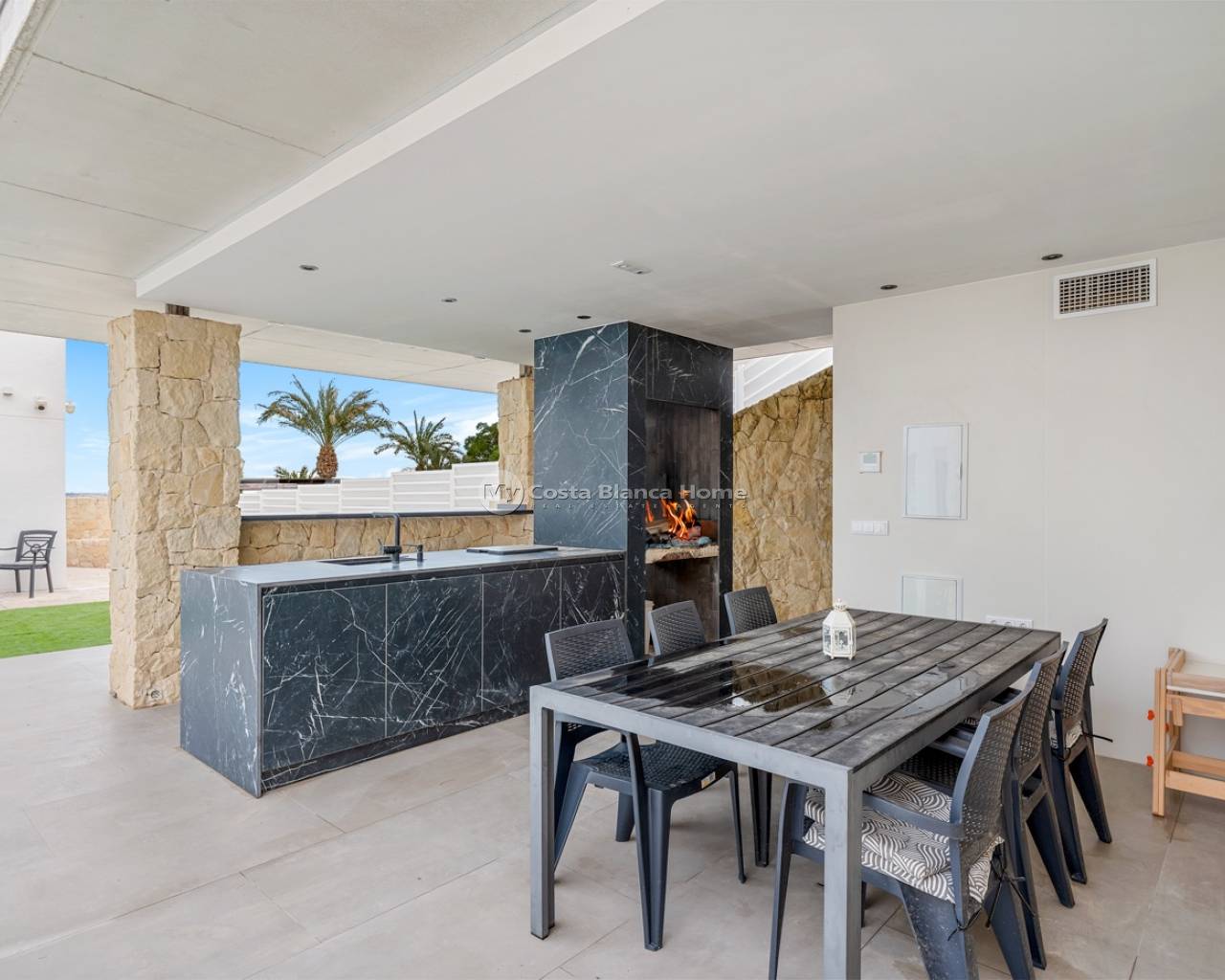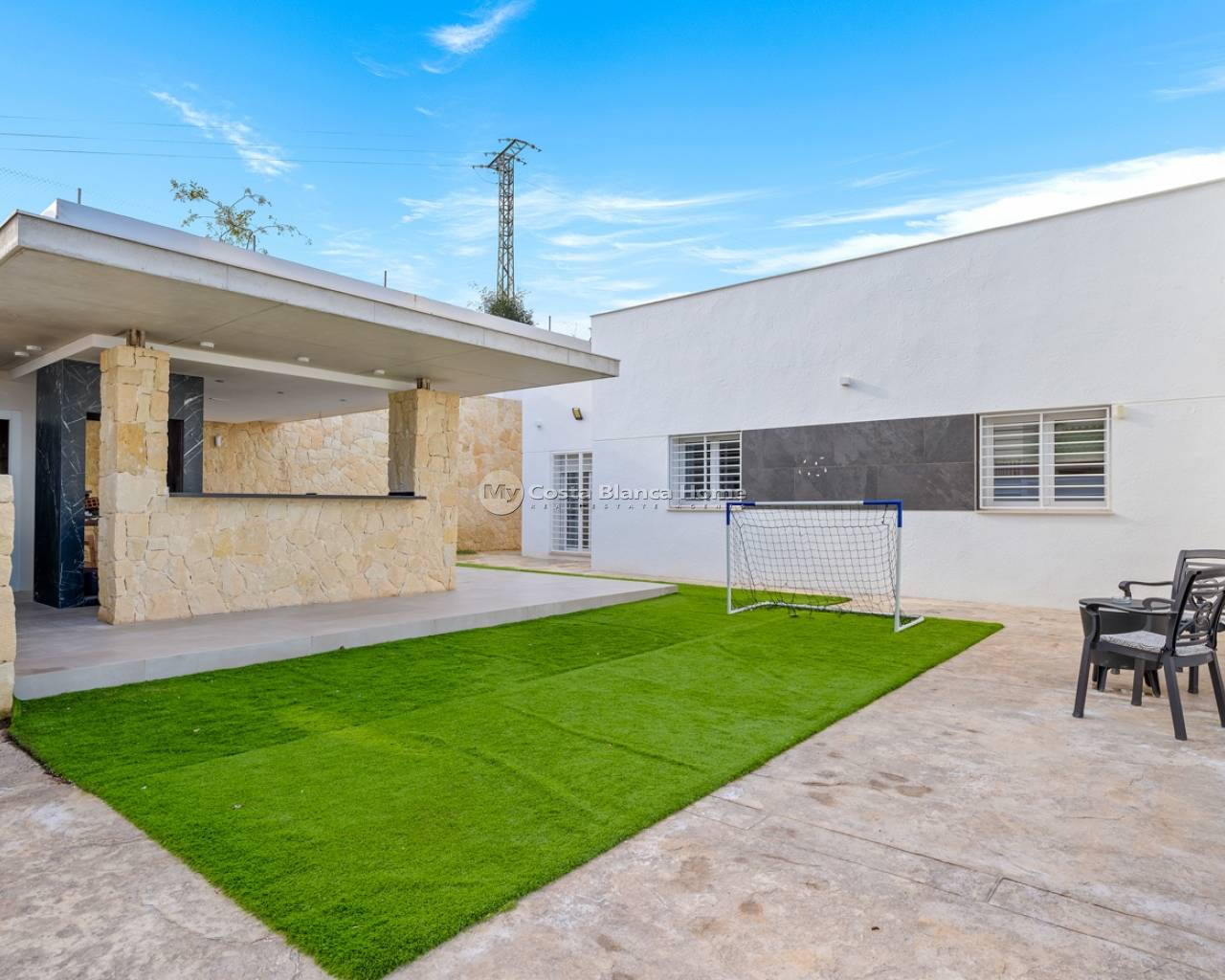RUIME MODERNE VILLA MET PRIVÉZWEMBAD IN ALGORFA, ALICANTE Bij binnenkomst via de voordeur wordt u verwelkomd door een ruime oprit met voldoende parkeerruimte voor meerdere voertuigen en volop plaats voor tuinmeubilair of decoratieve objecten. De buitenkant wordt verfraaid door elegante sfeerverlichting, wat bijdraagt aan de moderne en uitnodigende uitstraling van de woning. Een garage en een grote berging onder het huis bieden extra veilige opberg- of parkeermogelijkheden. Naast de woning vindt u een stijlvolle buitenkeuken met een spoelbak, kookgedeelte en een handige buitenbadkamer, perfect om gasten te ontvangen. Deze ruimte sluit naadloos aan op het zwembadterras, waar u kunt genieten van een spectaculair uitzicht. Het zwembadgedeelte biedt voldoende ruimte voor ligstoelen of tuinmeubilair, ideaal om te ontspannen met uitzicht op de lager gelegen delen van het pand. Bij de hoofdingang vormt een robuuste draaideur een opvallend architectonisch statement. Eenmaal binnen word je verwelkomd in een lichte en open woonkamer met hoge plafonds, moderne verlichting en twee glazen schuifdeuren: één naar het terras bij het zwembad en de andere naar de buitenkeuken, waardoor er veel natuurlijk licht binnenvalt en een naadloze overgang tussen binnen en buiten ontstaat. Grenzend aan de woonkamer bevindt zich een luxe keuken, volledig uitgerust met hoogwaardige Bosch-apparatuur, waaronder een geïntegreerde oven, magnetron en vaatwasser. Het moderne kookeiland is voorzien van een waterfiltersysteem, een ijsmachine, een inductiekookplaat met geïntegreerde afzuigkap, uitklapbare oplaadpunten en een wijnkoeler. Het doordachte ontwerp combineert functionaliteit met stijl en maximaliseert de natuurlijke lichtinval dankzij twee extra schuifdeuren die direct toegang bieden tot het zwembad. Naast de keuken bevindt zich een berging met een geavanceerd camerasysteem en een wasruimte met directe toegang tot de achterzijde van het pand voor extra gemak. Een gastenbadkamer bevindt zich direct naast de woonkamer. Als u verder de gang inloopt, leiden bewegingssensoren in de spotjes u naar twee goed geproportioneerde slaapkamers, waaronder een master suite met een kleedkamer en een moderne en-suite badkamer. Belangrijkste kenmerken • Ruime entree met voldoende parkeergelegenheid voor meerdere voertuigen. • Buitenkeuken • Zwembad met spectaculair open uitzicht • Ondergrondse opslagruimte en garage voor extra beveiligde parkeergelegenheid. • Lichte en open woonkamer met hoge plafonds en moderne spotverlichting. • Dubbelglasramen • Hoogwaardige Bosch keukenapparatuur, waaronder een oven, magnetron en vaatwasser. • Keukeneiland met waterfiltersysteem, ijskoeler, inductiekookplaat met geïntegreerde afzuigkap, uitschuifbare oplaadpunten. • Opslagruimte uitgerust met een geavanceerd camerabewakingssysteem. • Wasruimte met directe toegang tot de achterzijde van het pand. • Hoofdslaapkamer met kleedkamer en moderne en-suite badkamer. • Sensorgestuurde schijnwerpers in de gehele gang. Locatie Deze villa is gelegen in Algorfa, Alicante, en geniet van een privé en rustige omgeving in een beveiligde woonwijk. Het ligt op korte rijafstand van zandstranden en diverse lokale bars, restaurants en winkels, waardoor het de perfecte balans biedt tussen privacy en gemak voor een mediterrane levensstijl. Video van de woning beschikbaar: stuur ons een bericht en we sturen hem u direct toe. Neem vandaag nog contact met ons op om een privébezichtiging in te plannen, zowel fysiek als virtueel. Objecten van dit kaliber en met deze exclusiviteit zijn zelden lang beschikbaar; we raden u ten zeerste aan om tijdig te informeren.