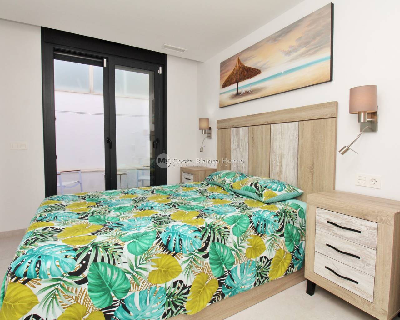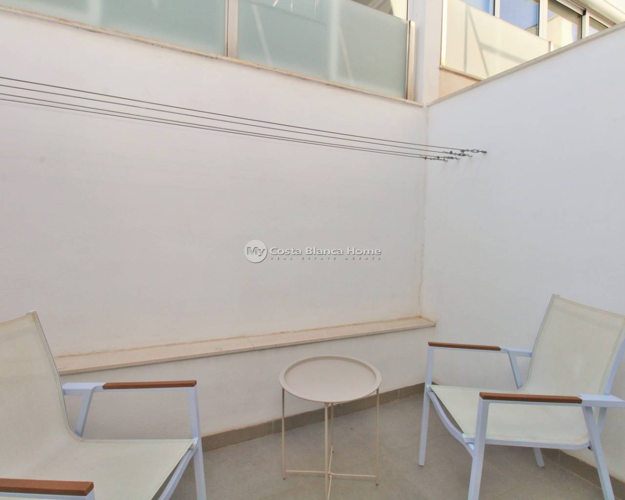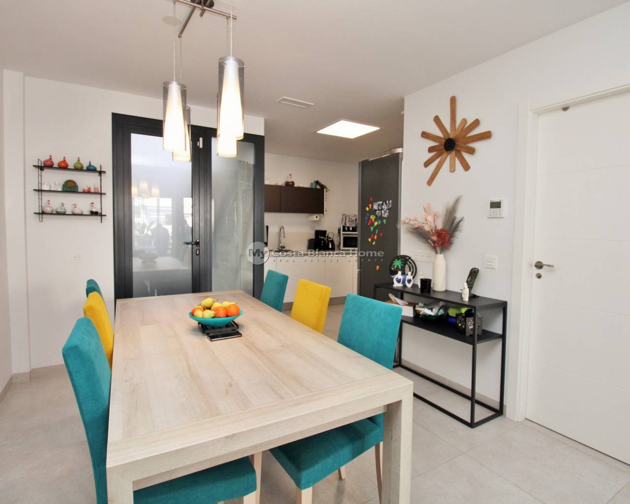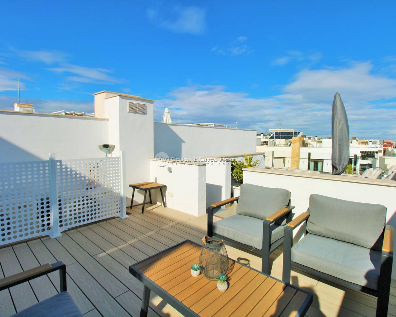 Deze moderne tussenwoning met 2 slaapkamers en 3 badkamers is gelegen in de populaire wijk Pau 26 in Villamartin. Gebouwd in 2019 en in uitstekende staat. De woning beschikt over een privé voorterras met zwembad, ideaal voor buitenleven. Op de begane grond bevindt zich een ruime open woon- en eetkamer met een volledig uitgeruste keuken aan de achterzijde en een aparte bijkeuken. Daarnaast is er een badkamer met inloopdouche. Op de eerste verdieping zijn twee tweepersoonsslaapkamers, beide met inbouwkasten en en-suite badkamers. Eén slaapkamer heeft een privéterras. Via een buitentrap bereikt u het privé dakterras, met voldoende ruimte voor zitgelegenheid en ligbedden. De woning maakt deel uit van een goed onderhouden complex met toegang tot een gemeenschappelijk zwembad. Gelegen nabij Villamartin Plaza, golfbanen, winkels en restaurants, en op korte rijafstand van Zenia Boulevard en de stranden van Orihuela Costa.