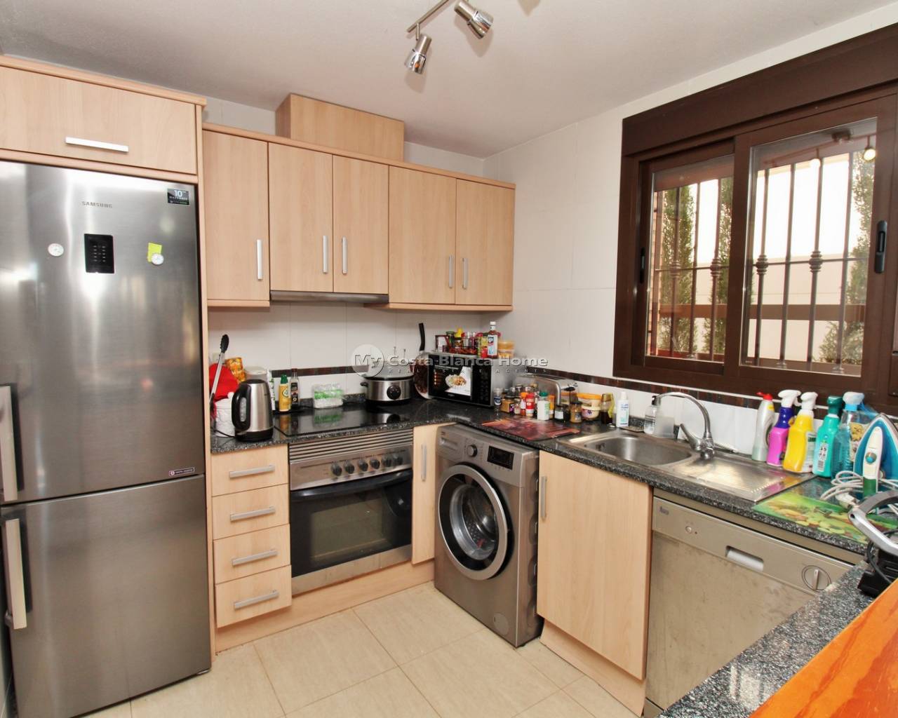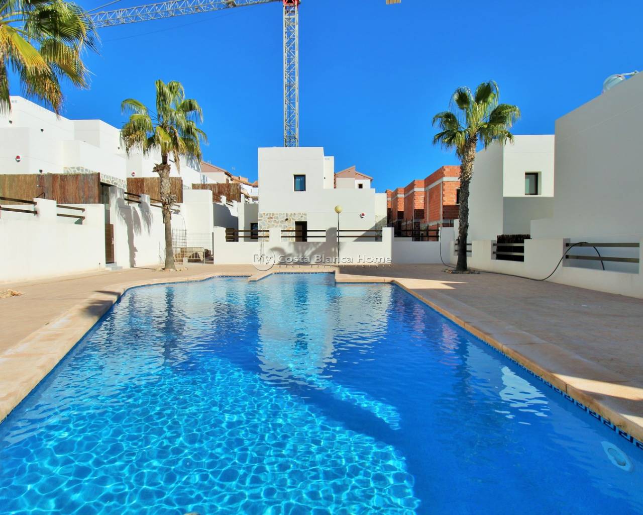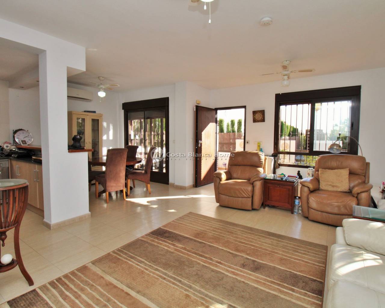 Wonderfully presented 2 bedroom detached villa for sale in Res. El Palmeral/Illios, Pau 8, Villamartin. The villa is in very good condition, and is sold fully equipped with furniture, air-conditioning and white goods. Part of a community with the use of a lovely communal pool right near the villa. The living accommodation comprises of spacious lounge-dining area with separate kitchen to the side, a double bedroom with fitted wardrobes and a bathroom with walk-in shower. Upstairs you will find the master bedroom with fitted wardrobes and an en-suite bathroom bathroom. From the master bedroom you have access to a large sunny private balcony, where you can see the communal pool area. The property has a front and rear terraces, plus a double private parking space just behind the property. Located within easy reach of the famous Villamartin Plaza and golf course, which hosts a great variety of bars, restaurants, shops and a supermarket. The sandy blue flag beaches of the Orihuela Costa, and the Zenia Boulevard shopping mall, the biggest in the Alicante province, is just a 10 minutes drive away by car.