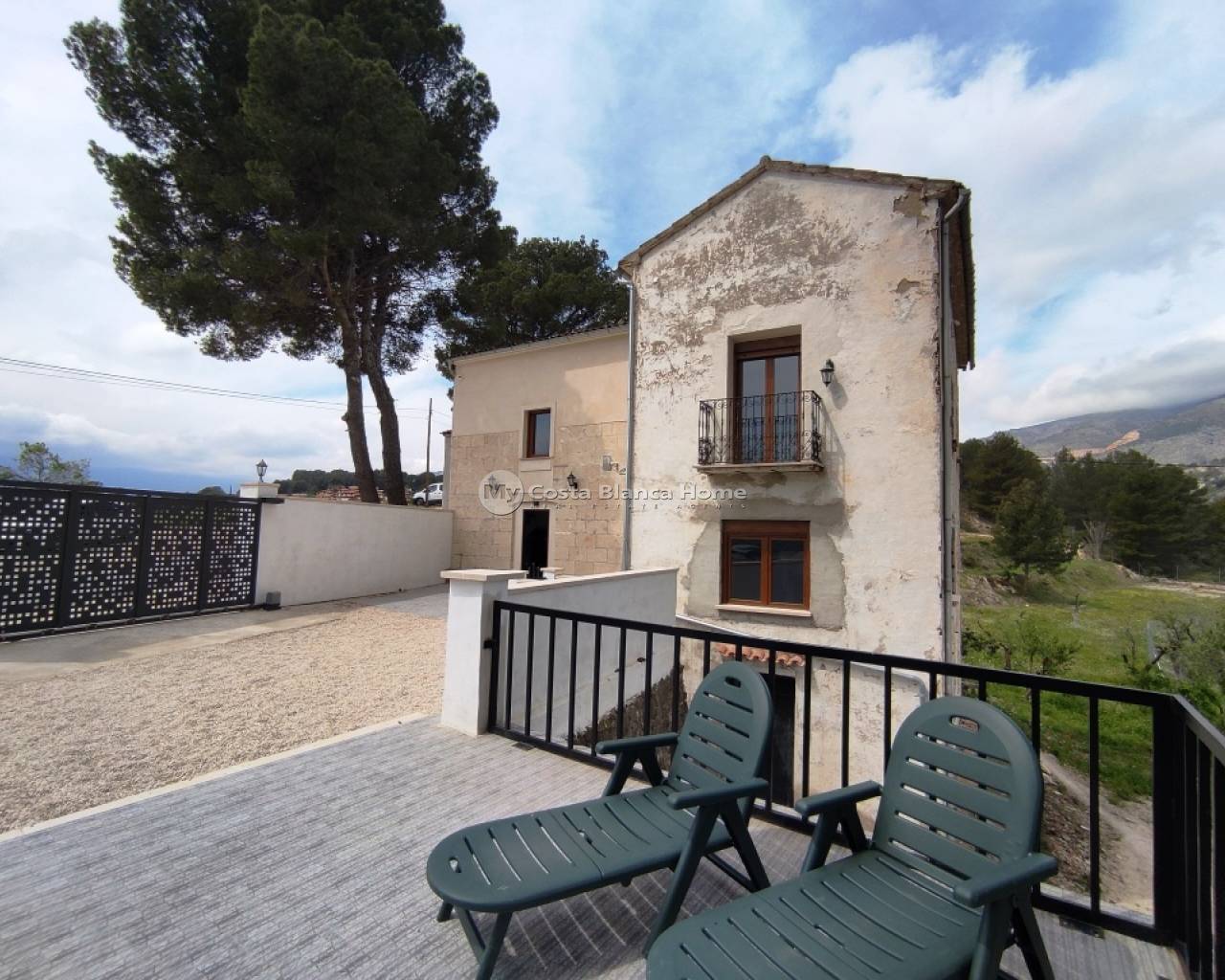 This traditional finca for sale in Cocentaina offers a rare combination of historic charm and modern comfort, located just 2 km from both Cocentaina and Alcoy, with quick access to the A7 motorway.The 335 m² home has been fully renovated inside, featuring two separate entrances and staircases, perfect for dividing the home into two independent units for investment or multi-family use.On the ground floor, you'll find a cozy lounge with fireplace, a spacious kitchen with access to a rear terrace, a bathroom, and a bright dining room with stunning valley views. Upstairs offers four bedrooms and two bathrooms, central heating, and top-quality finishes. Additional features include a loft storage area and a cellar/storage room below the main living space.The fully fenced 29,933 m² plot features automated gate access, olive and almond trees, and an attached building in need of full renovation, offering further development potential.The property is equipped with mains water, electricity, internet, video surveillance, alarm system, and double-glazed aluminium windows, ensuring comfort and security.Cocentaina lies in the heart of Alicante's interior, near the Mariola Natural Park, famous for hiking trails, spring water sources, and breathtaking scenery. The nearby city of Alcoy adds cultural richness, historical charm, and vibrant festivities.