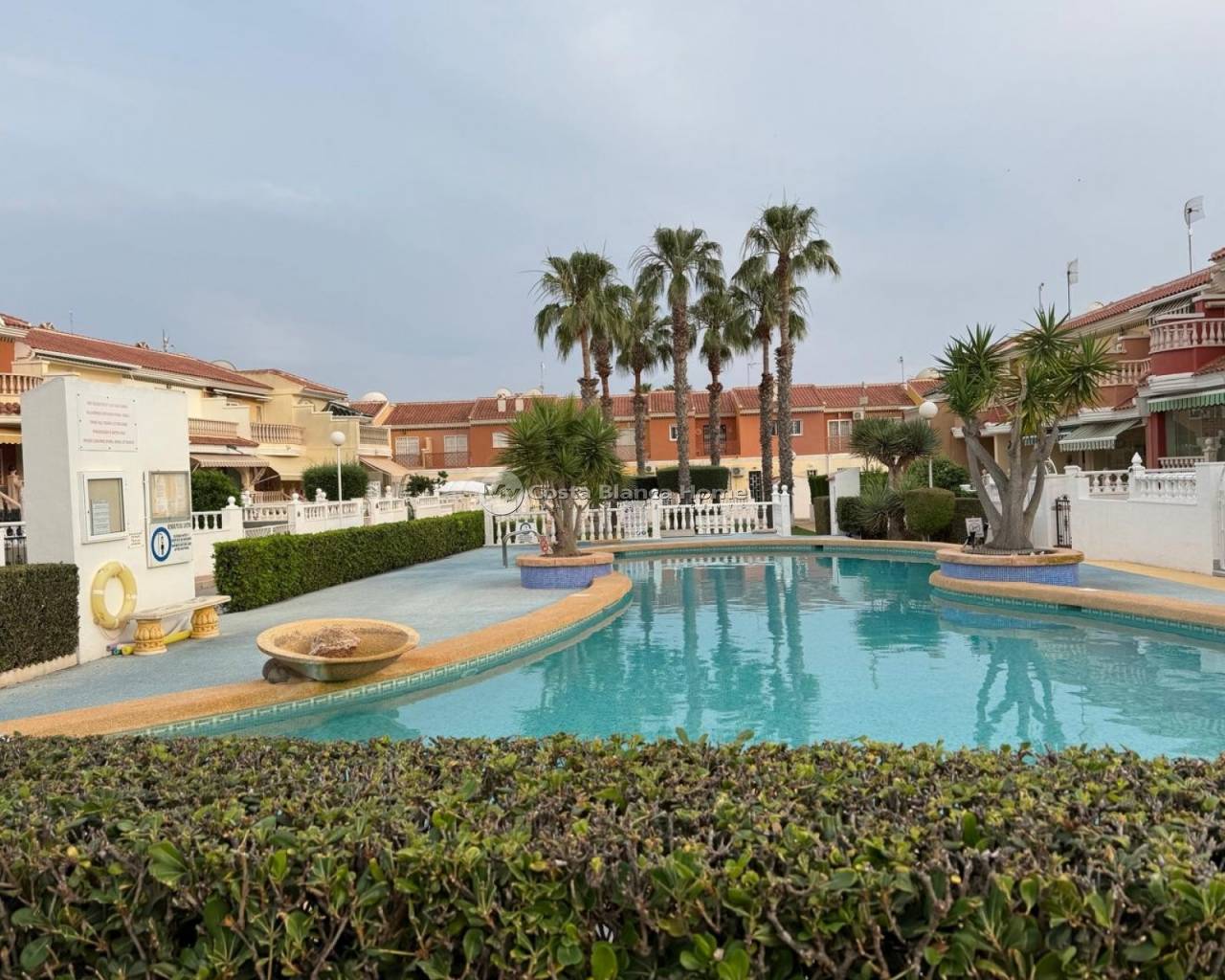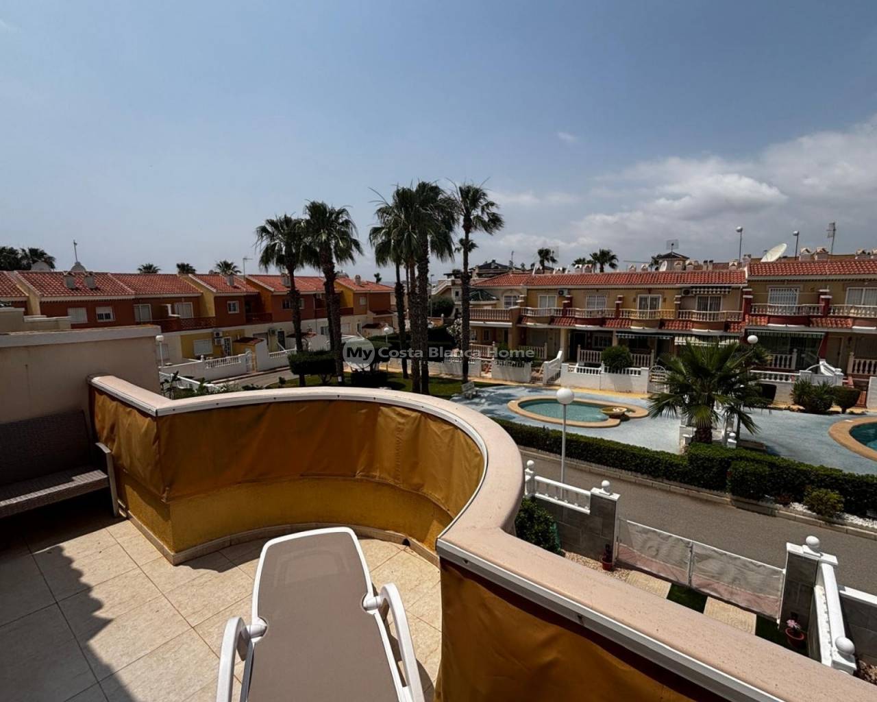 We have a beautiful 3 bedroom 2 bathroom west facing Lola style house for sale in the very popular area of Dona Pepa, part of Ciudad Quesada on the Costa Blanca. It is located close to many amenities including bars, restaurants, supermarkets and the long sandy beaches at Guardamar del Segura are just a 7 minute drive. The property is found inside a well established gated community and overlooks the beautiful swimming pool. The current owner has kept the home maintained to a high standard.The front of the property has a covered terrace with plenty of garden space and drive for car.