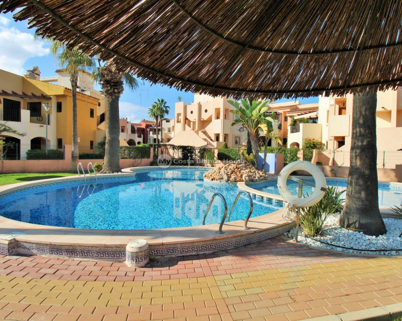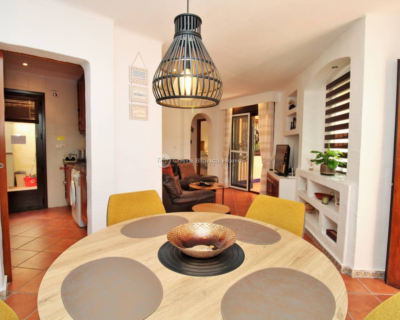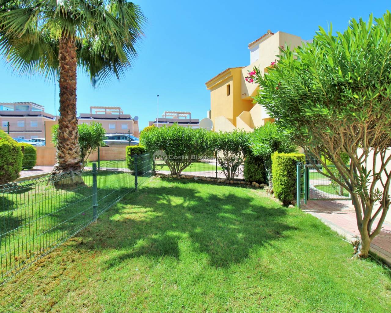 A bright and inviting ground floor apartment with two bedrooms, two bathrooms, and a generous 36m2 private garden, located within the sought-after gated community of Punta Marina in Punta Prima. Full of charm and character, this well-presented apartment features a traditional Spanish-rustic style and sits within a beautifully maintained complex offering residents access to a communal swimming pool—conveniently situated just next to the property—as well as off-road communal parking. Ideally positioned just 400 metres from the Punta Marina commercial centre, where you’ll find a Consum supermarket, shops, bars, and restaurants, and only 900 metres from the seafront, the location offers excellent convenience. The apartment comprises a spacious lounge and dining area, a separate fully fitted kitchen with adjoining utility room, two double bedrooms with built-in wardrobes, and a renovated family bathroom with a walk-in shower. The master bedroom benefits from its own en-suite. French doors open from the living area onto a covered terrace, leading down to a beautifully maintained private garden with lawn and mature planting—garden maintenance is included in the community fees. Offered fully furnished, including white goods and air conditioning. Residential Punta Marina is a well-located and established community, offering a peaceful setting within easy walking distance of all amenities. Homes with gardens of this size, in such a prime location, rarely become available. Early viewing is highly recommended.