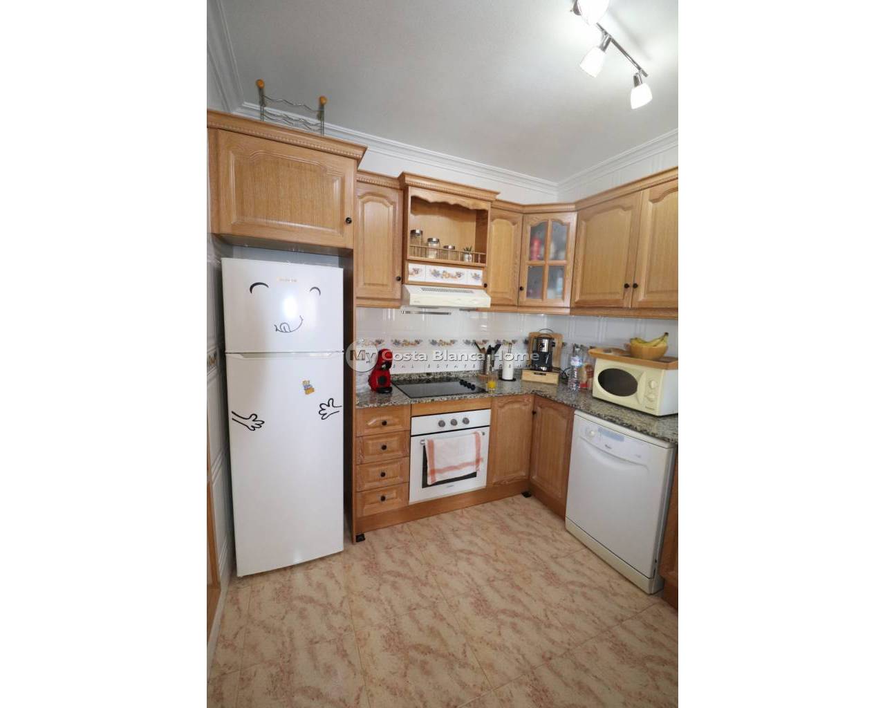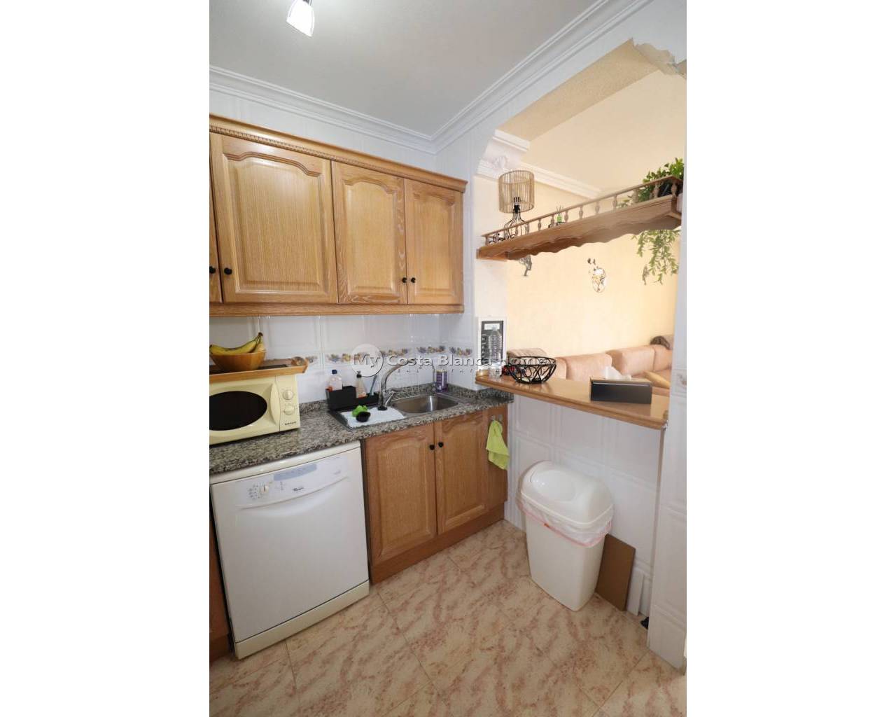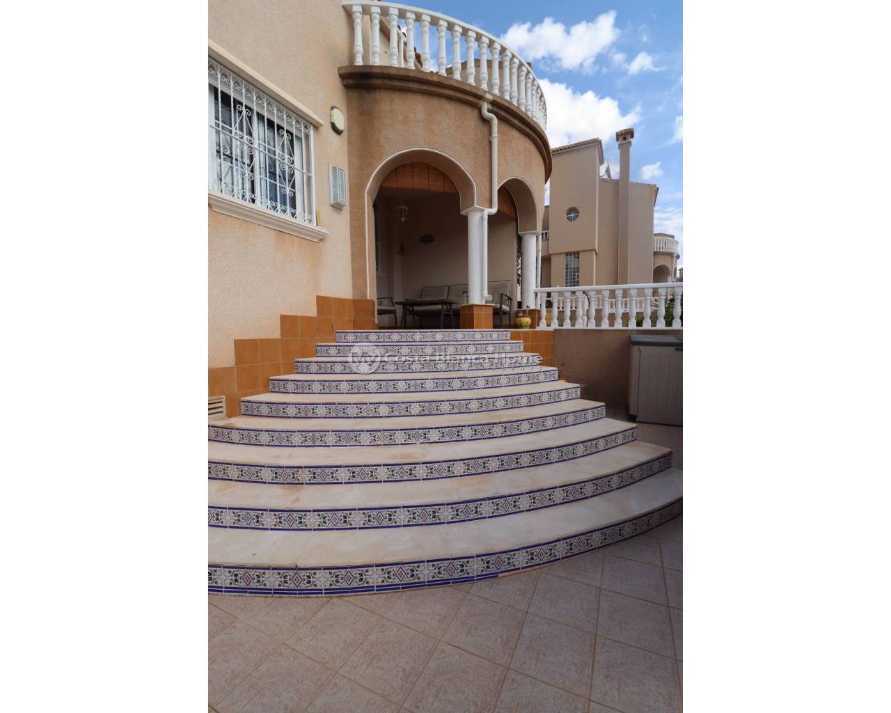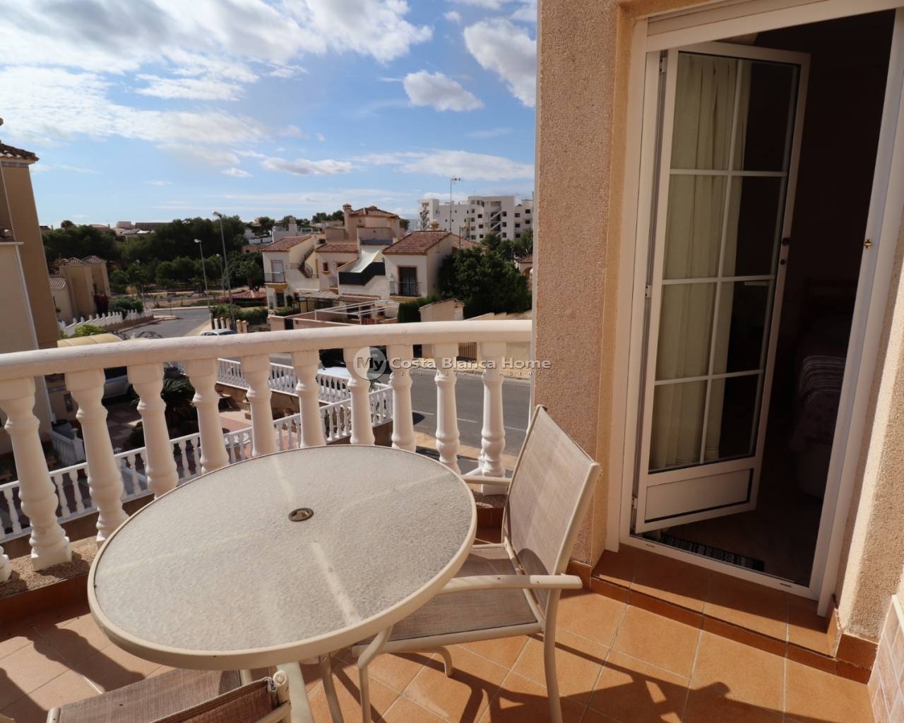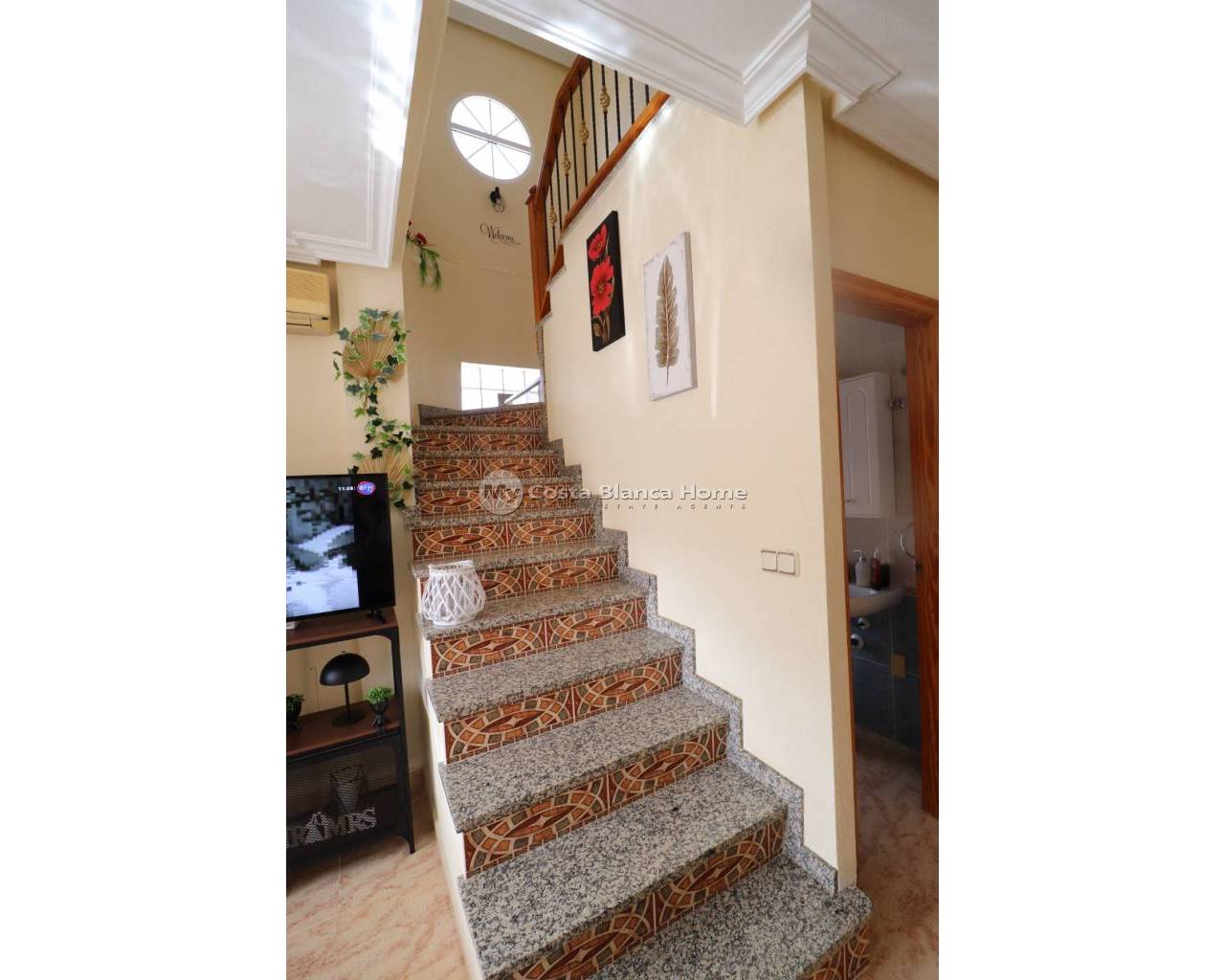 Beautiful house located in a quiet area of Las Filipinas (Orihuela Costa). The house is built on two levels. On the ground floor, there is a kitchen that opens onto the living room, a bedroom and a bathroom. Upstairs, there is a bathroom and two bedrooms, one of which has a balcony. There is also a terrace leading to the solarium, where there is a storage room. The outdoor area is pleasant with several terraces, one of which is covered, a jacuzzi, a parking space and a storage room. The house has air conditioning in the living room and in all bedrooms. Each bedroom has a built-in wardrobe. It is sold fully furnished and has a tourist licence. The complex offers a beautiful communal swimming pool. It is within walking distance of amenities, close to several golf courses, 6 km from the beautiful beaches of the Costa Blanca and 55 km from Alicante airport.
