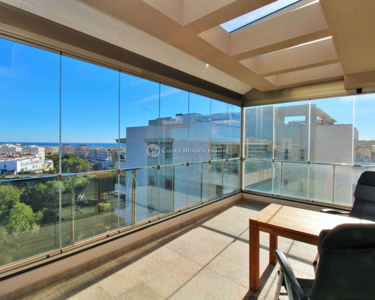 This stunning East-facing penthouse apartment is located in the highly sought-after Altos del Mediterráneo complex in Los Dolses, offering exceptional views of the Mediterranean Sea and the Mar Menor. Situated in Block 3 with convenient lift access, the property stands out for its modern design, fantastic outdoor spaces, and unbeatable proximity to local amenities. The interior comprises a bright and spacious lounge-dining area with an open-plan modern kitchen, two double bedrooms with fitted wardrobes, and two contemporary bathrooms, including an en-suite for the master bedroom. Both the lounge and master bedroom offer direct access to a sunny East-facing balcony fitted with glass curtains, perfect for enjoying the views all year round. From the balcony, an external staircase leads to the impressive private roof solarium, boasting panoramic views towards the sea, Mar Menor, La Manga, and the surrounding coastline. The solarium also features a storage room, ideal for outdoor furniture, beach gear, or personal belongings. The property includes a dedicated parking space inside the gated community, along with beautifully maintained communal areas and access to premium facilities — outdoor swimming pool, indoor heated pool, gym, sauna, and green areas. Located just a stone’s throw from a supermarket, shops, bars, restaurants, and a bus stop, the property is also within walking distance of Zenia Boulevard, Villamartin Plaza, and Villamartin Golf. An outstanding option for permanent living, holidays, or rental investment in one of the Orihuela Costa’s most desirable modern developments.