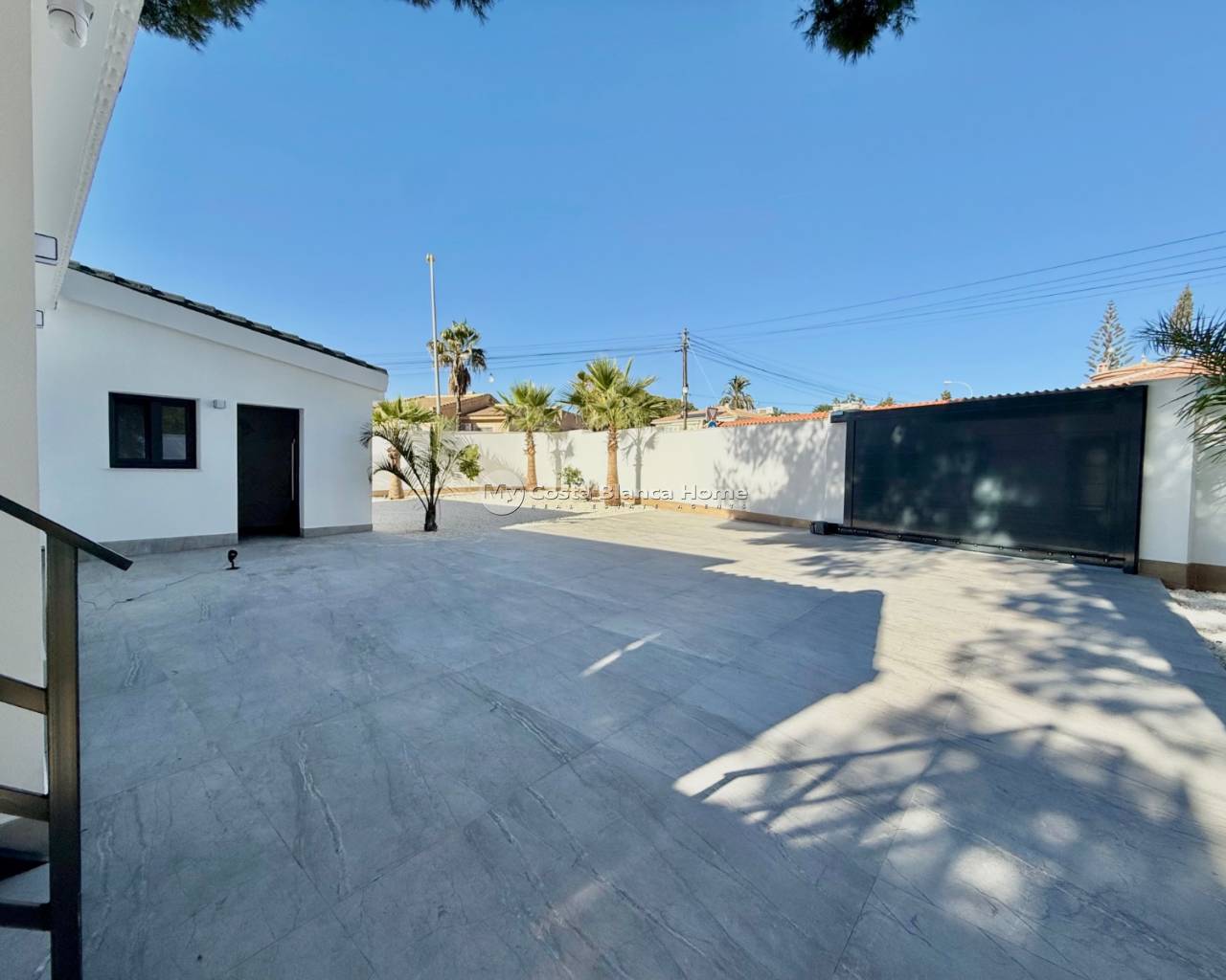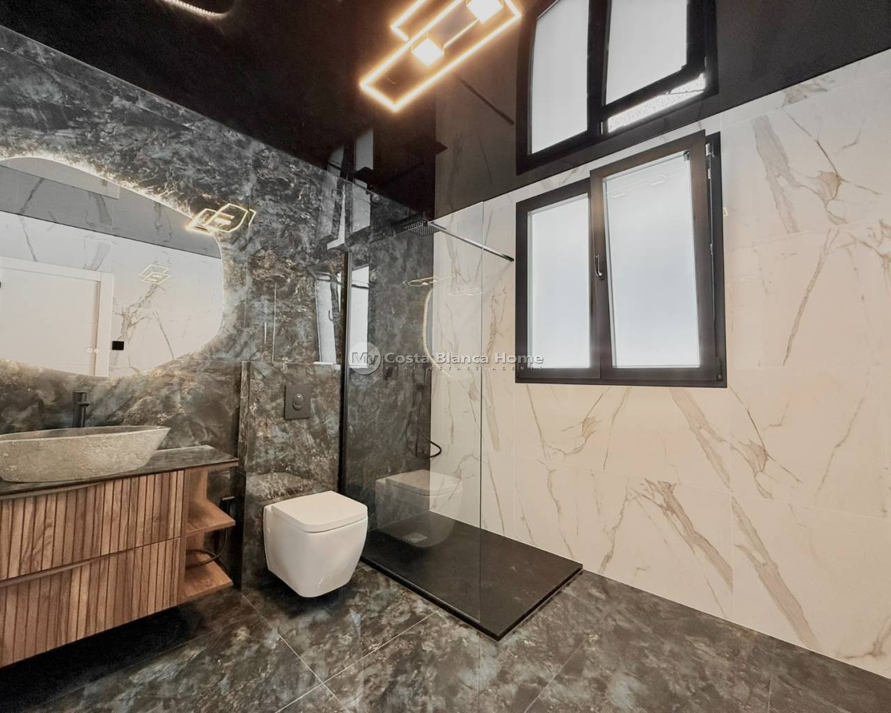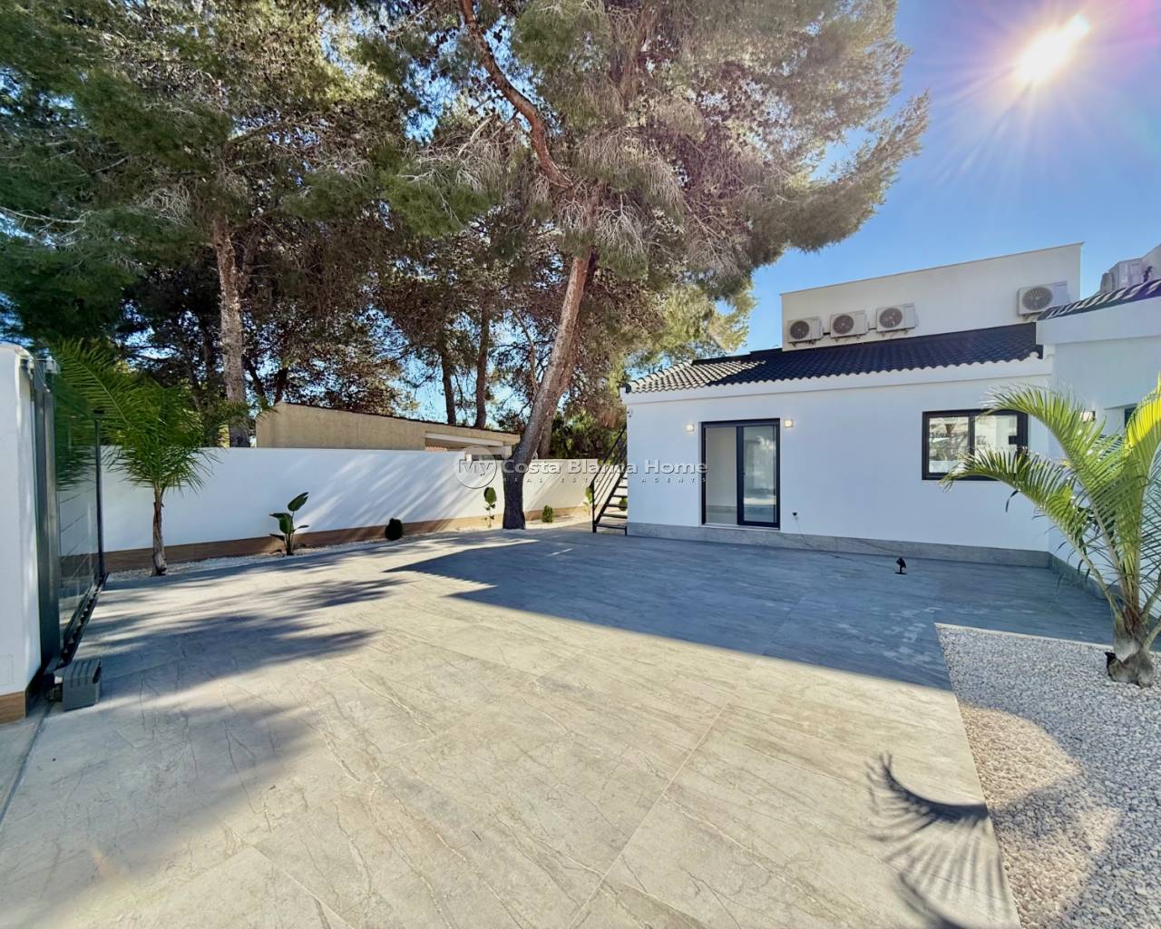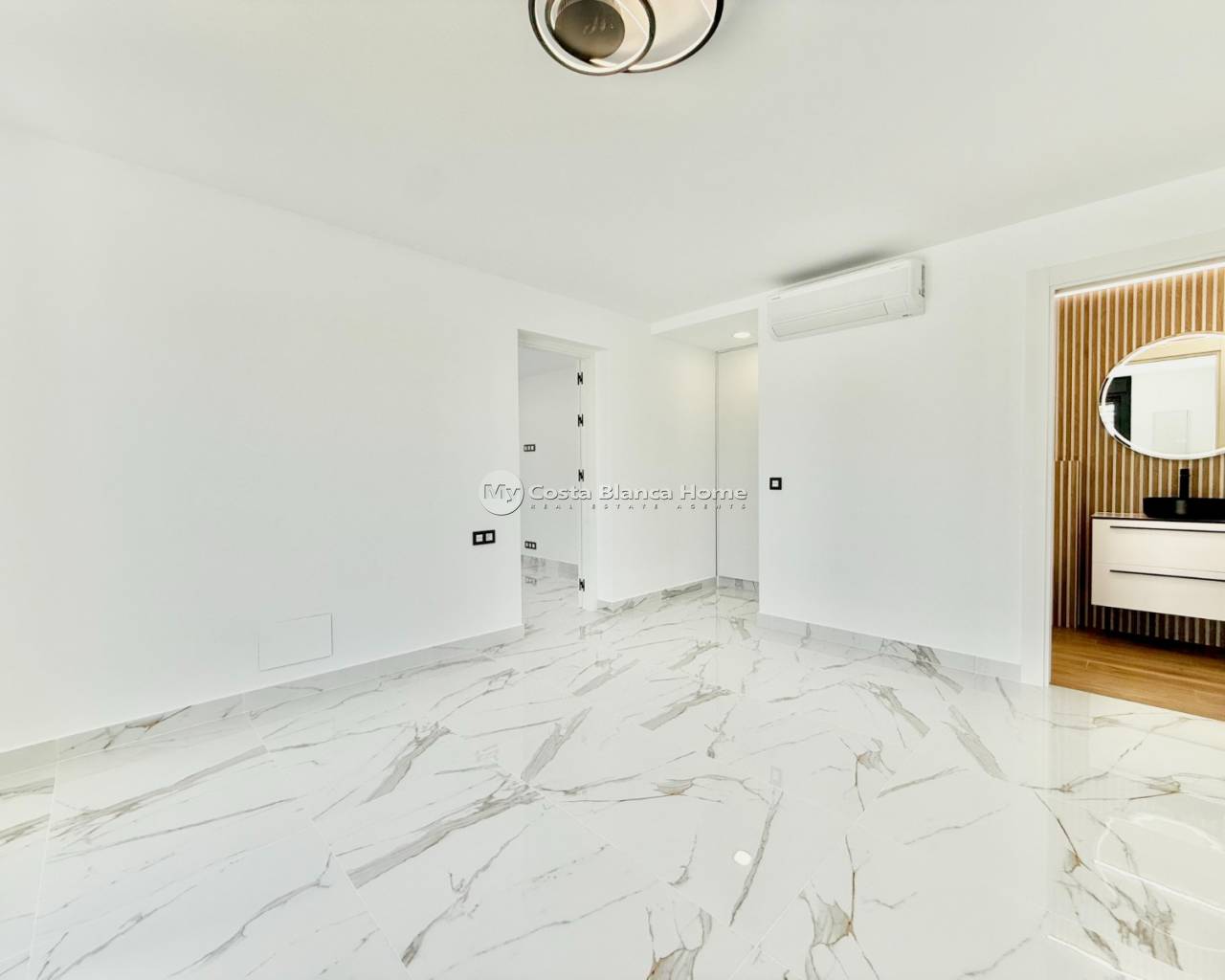 Positioned on one of Ciudad Quesada’s most desirable streets and occupying a privileged corner plot, this fully refurbished detached villa offers a refined blend of Mediterranean charm and sleek contemporary living. Just a short walk from the bustling town centre, the home provides a rare combination of privacy, space and high-end comfort in a sought-after coastal setting. Interior Features Designed with an emphasis on elegance, functionality and modern living, the interior stands out for its quality and attention to detail: 4-5 generous bedrooms, each featuring bespoke fitted wardrobes and high-spec finishes. 4 bathrooms, including three en suite, styled with premium materials and a modern, minimalist aesthetic. A spacious open-plan living and dining area, seamlessly connected to a luxury kitchen equipped with the latest BOSCH appliances. Individually controlled air-conditioning zones, all manageable from a mobile app for effortless climate control. Underfloor heating throughout, ensuring year-round comfort. Integrated smart-home system with electric blinds and intelligent lighting for a streamlined, modern lifestyle. Designer fixtures, carpentry and tiling, creating a cohesive and elegant interior atmosphere. Outdoor Living The exterior of the property is designed to make the most of the Costa Blanca’s exceptional climate: A spectacular 5×10 m private swimming pool with built-in jacuzzi, ideal for relaxing, entertaining or enjoying warm summer days. Low-maintenance Mediterranean garden with ample space for outdoor dining, lounging and social gatherings. A large rooftop solarium, offering open views and a serene setting for sunbathing or hosting guests. Separate, fully equipped laundry room with washer, dryer and storage. Additional Highlights Fully renovated using first-class materials and craftsmanship. Bright, harmonious interior layout with abundant natural light. Prime Location Located just minutes from all amenities—including restaurants, supermarkets and leisure facilities—this villa strikes the perfect balance between convenience and tranquillity. It offers the ideal base for those seeking a sophisticated Mediterranean lifestyle in one of Ciudad Quesada’s most prestigious areas.