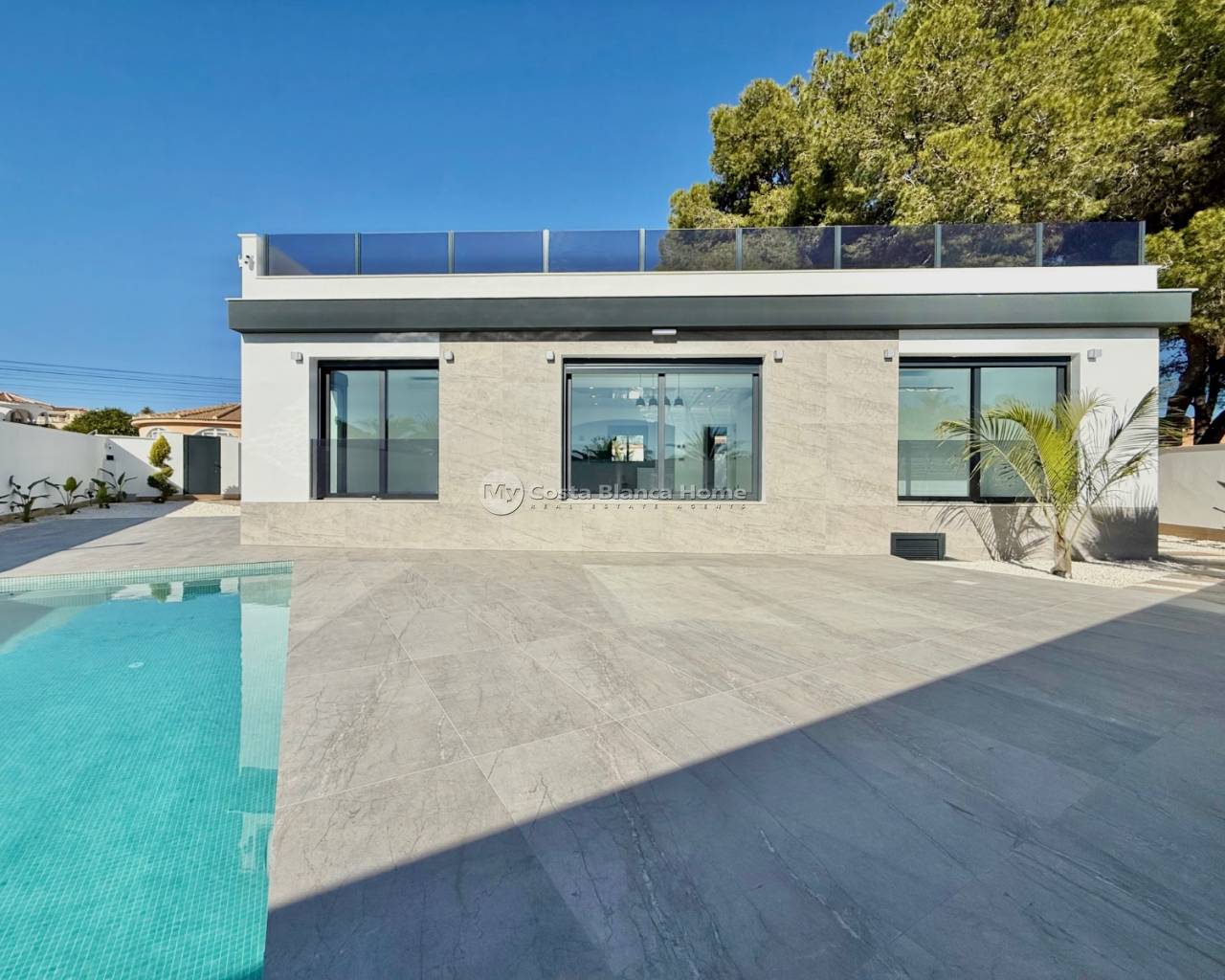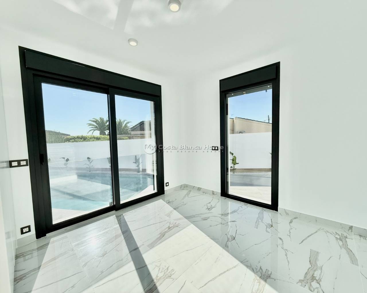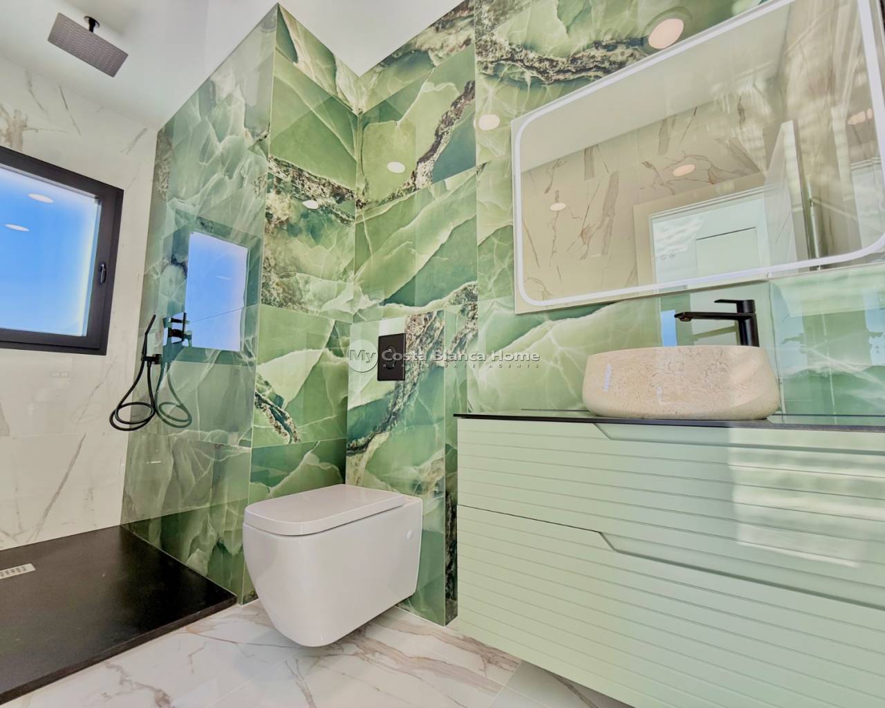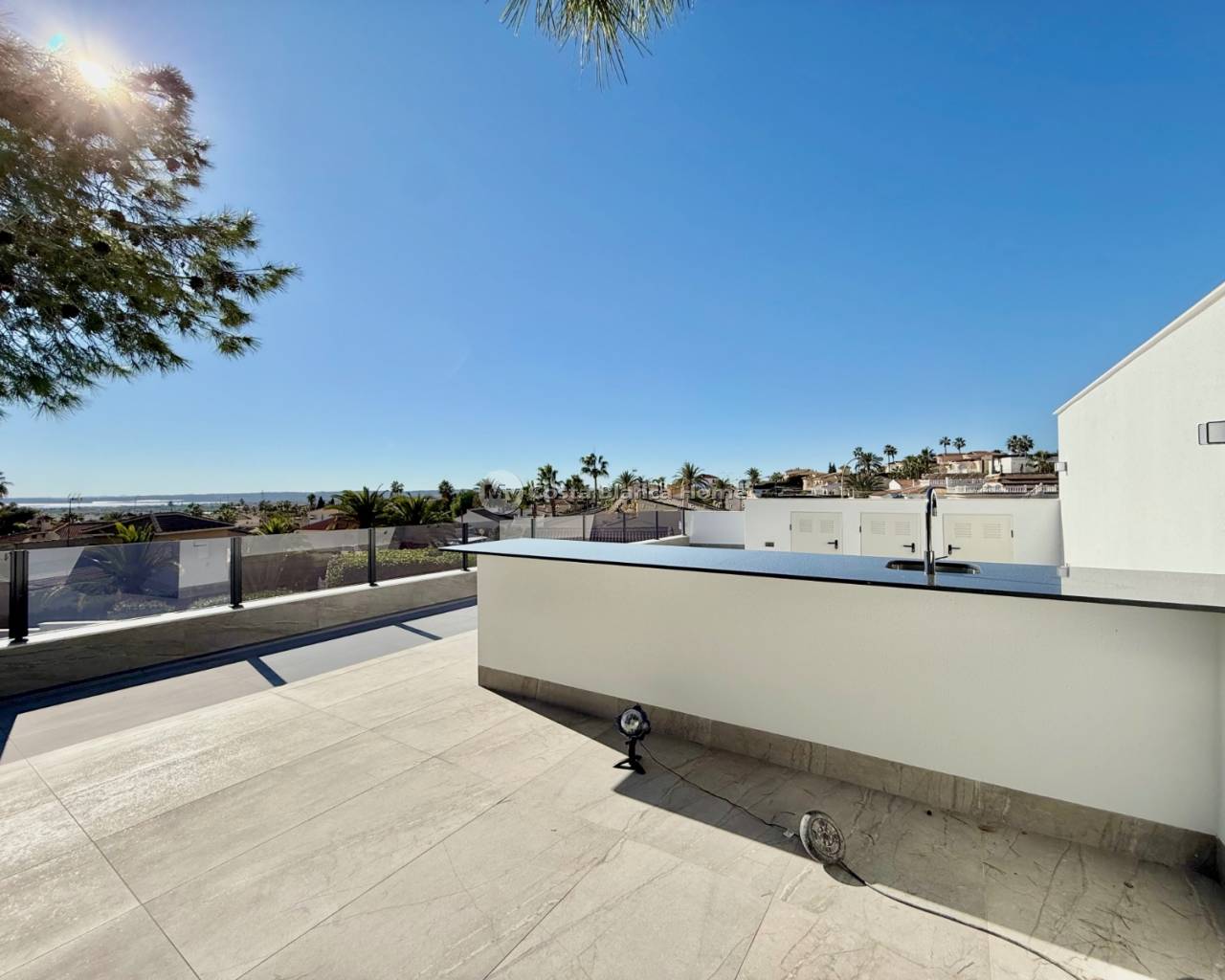 Positioned on one of Ciudad Quesada’s most desirable streets and occupying a privileged corner plot, this fully refurbished detached villa offers a refined blend of Mediterranean charm and sleek contemporary living. Just a short walk from the bustling town centre, the home provides a rare combination of privacy, space and high-end comfort in a sought-after coastal setting. Interior Features Designed with an emphasis on elegance, functionality and modern living, the interior stands out for its quality and attention to detail: 4-5 generous bedrooms, each featuring bespoke fitted wardrobes and high-spec finishes. 4 bathrooms, including three en suite, styled with premium materials and a modern, minimalist aesthetic. A spacious open-plan living and dining area, seamlessly connected to a luxury kitchen equipped with the latest BOSCH appliances. Individually controlled air-conditioning zones, all manageable from a mobile app for effortless climate control. Underfloor heating throughout, ensuring year-round comfort. Integrated smart-home system with electric blinds and intelligent lighting for a streamlined, modern lifestyle. Designer fixtures, carpentry and tiling, creating a cohesive and elegant interior atmosphere. Outdoor Living The exterior of the property is designed to make the most of the Costa Blanca’s exceptional climate: A spectacular 5×10 m private swimming pool with built-in jacuzzi, ideal for relaxing, entertaining or enjoying warm summer days. Low-maintenance Mediterranean garden with ample space for outdoor dining, lounging and social gatherings. A large rooftop solarium, offering open views and a serene setting for sunbathing or hosting guests. Separate, fully equipped laundry room with washer, dryer and storage. Additional Highlights Fully renovated using first-class materials and craftsmanship. Bright, harmonious interior layout with abundant natural light. Prime Location Located just minutes from all amenities—including restaurants, supermarkets and leisure facilities—this villa strikes the perfect balance between convenience and tranquillity. It offers the ideal base for those seeking a sophisticated Mediterranean lifestyle in one of Ciudad Quesada’s most prestigious areas.