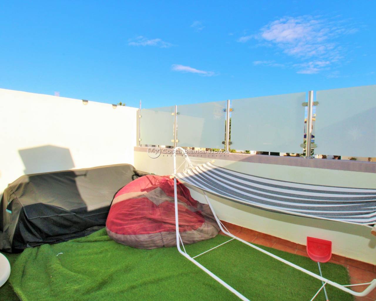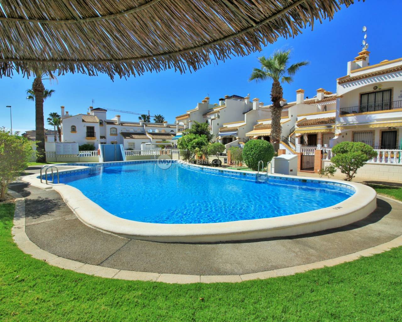 This attractive Sofía-style townhouse is located within the well-established R19 development in Los Dolses, enjoying a prime position just a few steps from the communal swimming pool. The property features a front tiled terrace with open views over the communal pool, offering a pleasant space to relax and enjoy the surroundings. Inside, the ground floor comprises a bright lounge-dining area, a fitted kitchen to the rear with access to a private patio, and a ground-floor WC. On the first floor, there are two double bedrooms with fitted wardrobes, along with a family bathroom. The main bedroom benefits from a private balcony, which also enjoys views towards the communal pool and gardens. From the first-floor landing, internal stairs lead to a private roof solarium, providing additional outdoor space ideal for sunbathing or entertaining. The townhouse is sold furnished, including white goods, and the community benefits from off-road communal parking for residents. Ideally located close to shops, bars, restaurants, and other amenities, and within easy reach of golf courses and the beaches of Orihuela Costa, this is a well-positioned property in one of Los Dolses’ most popular residential areas.