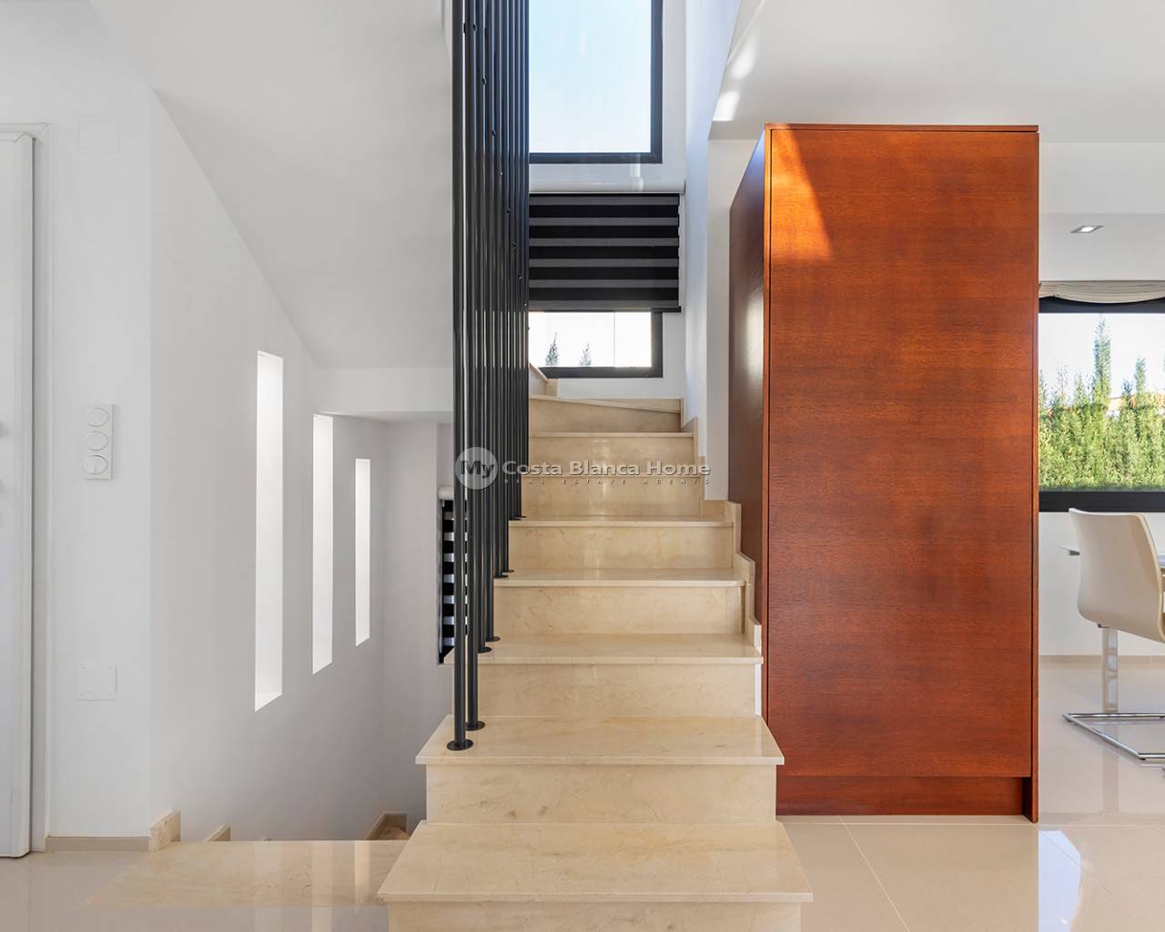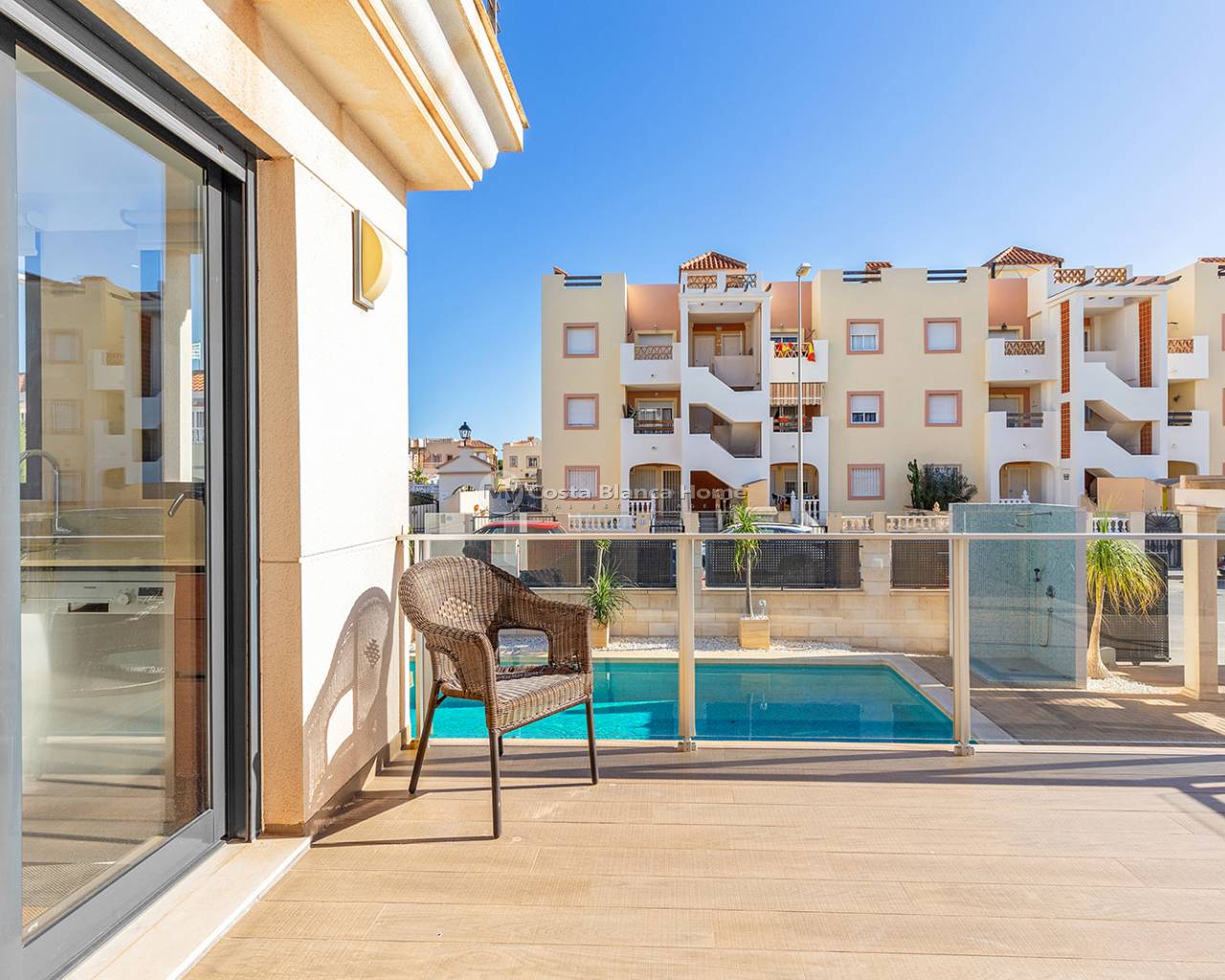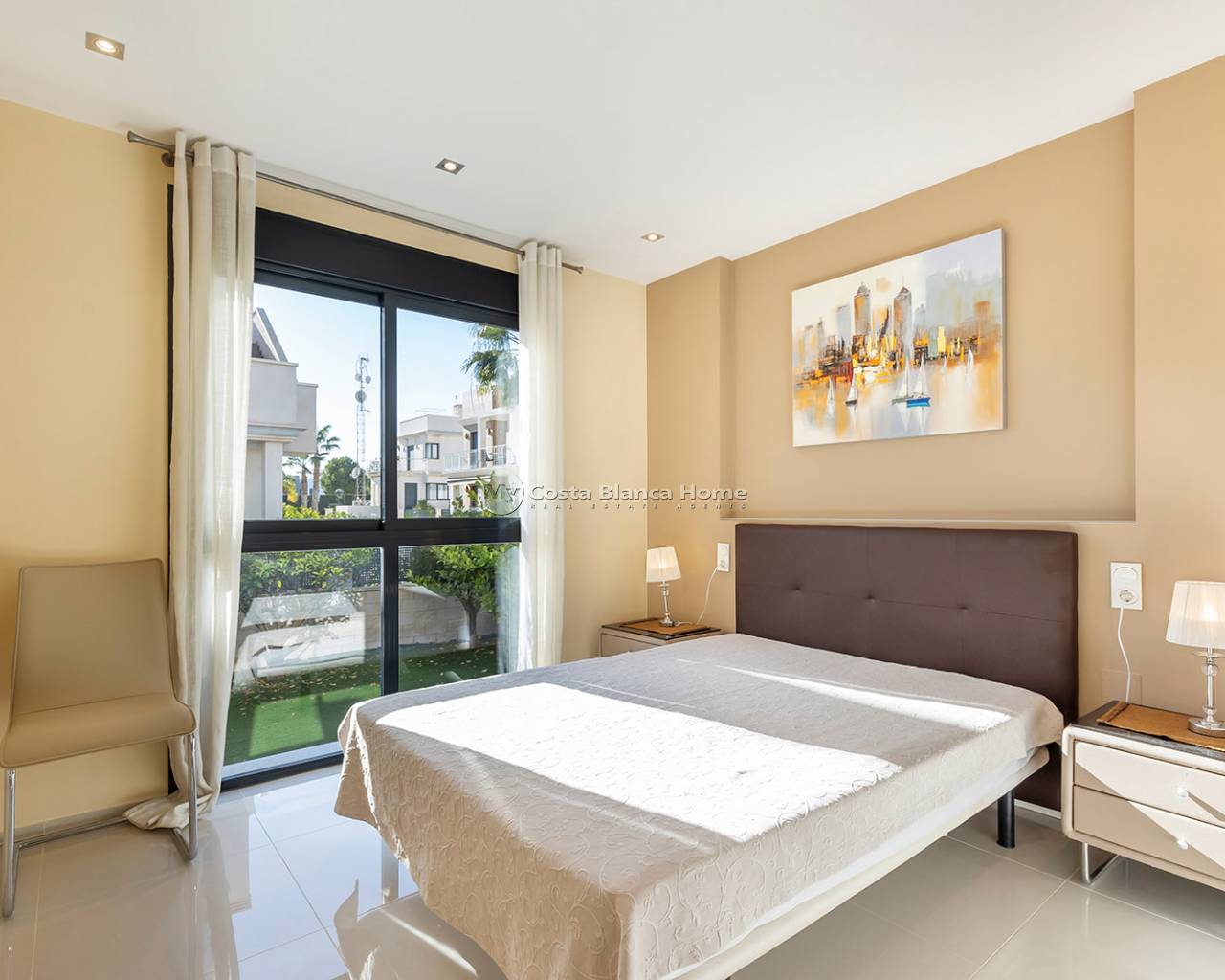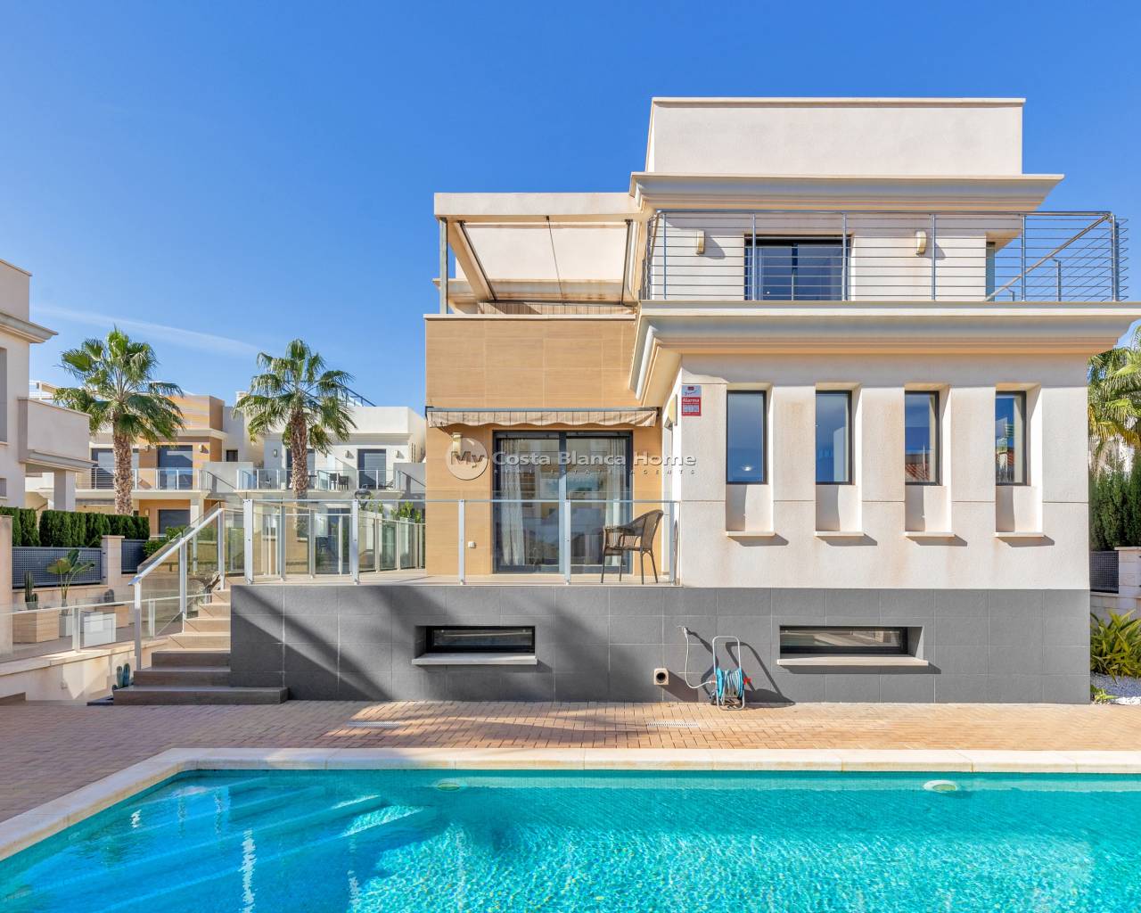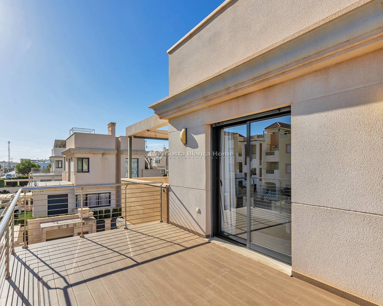 Luxury villa in La Zenia, Orihuela Costa. This villa is situated in an exclusive residential area and has its own private pool and a plot of 410m2. The property has 250m2 built area divided into 4 floors. On the ground floor there is a spacious living room with open plan kitchen, 1 bedroom, 1 bathroom and terrace with access to the pool. On the semi-basement floor there is a living room with open plan kitchen, 2 bedrooms and 1 bathroom. This floor also has a sauna and shower. On the first floor there are 2 bedrooms, each with en-suite bathroom and a large terrace. On the top floor there is a large solarium of 46m2. La Zenia is close to Cabo Roig, Campoamor and Playa Flamenca. It is a tourist area located close to all amenities of the famous La Zenia Boulevard shopping centre. A few minutes from the N-332 and the Mediterranean motorway AP-7 towards Alicante and Cartagena. There are also around the golf courses of Villamartin, Las Ramblas, Campoamor and Las Colinas.