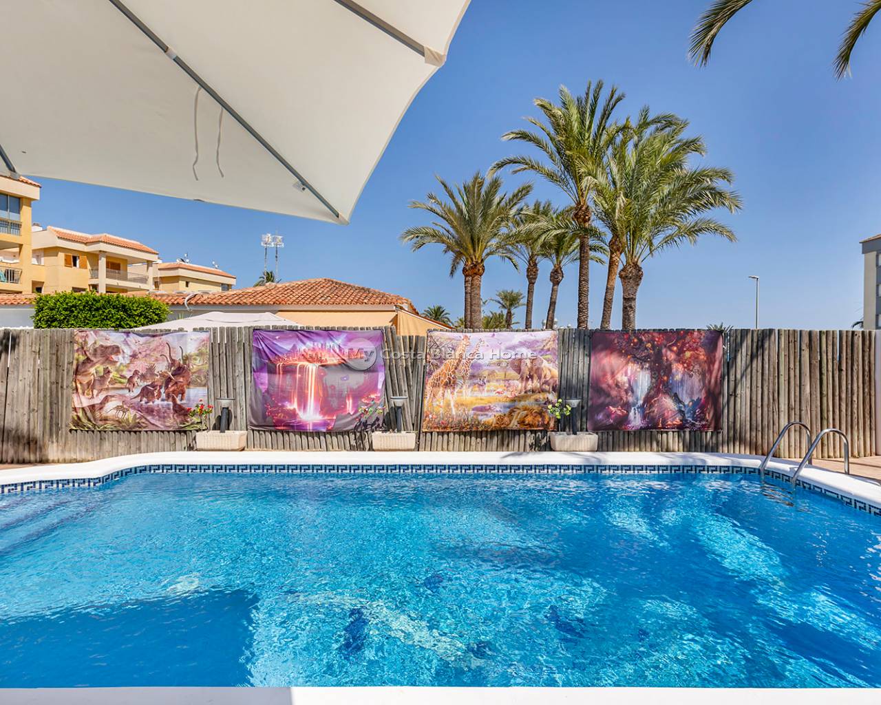 We present this magnificent detached house located in one of the most sought-after areas of the coast: Rocío del Mar, just 200 metres from the beach. This semi-detached villa is distributed over two floors, with a built area of 141 m² on a private plot of 442 m². The property offers four spacious bedrooms and two full bathrooms, with a comfortable and functional layout that ensures excellent natural light and ventilation in every room. From the upper floor you can enjoy pleasant sea views, adding special value to this home. Outside, the highlight is its beautiful private pool, perfect for relaxing and enjoying the Mediterranean climate all year round, along with large terrace areas and a well-kept garden ideal for unforgettable moments with family and friends. The villa is sold fully furnished and equipped with all appliances, air conditioning, an alarm system, and all the necessary comforts to move in and enjoy immediately. An ideal option both as a permanent residence and as a holiday home, located in a quiet residential area yet very close to all essential services.