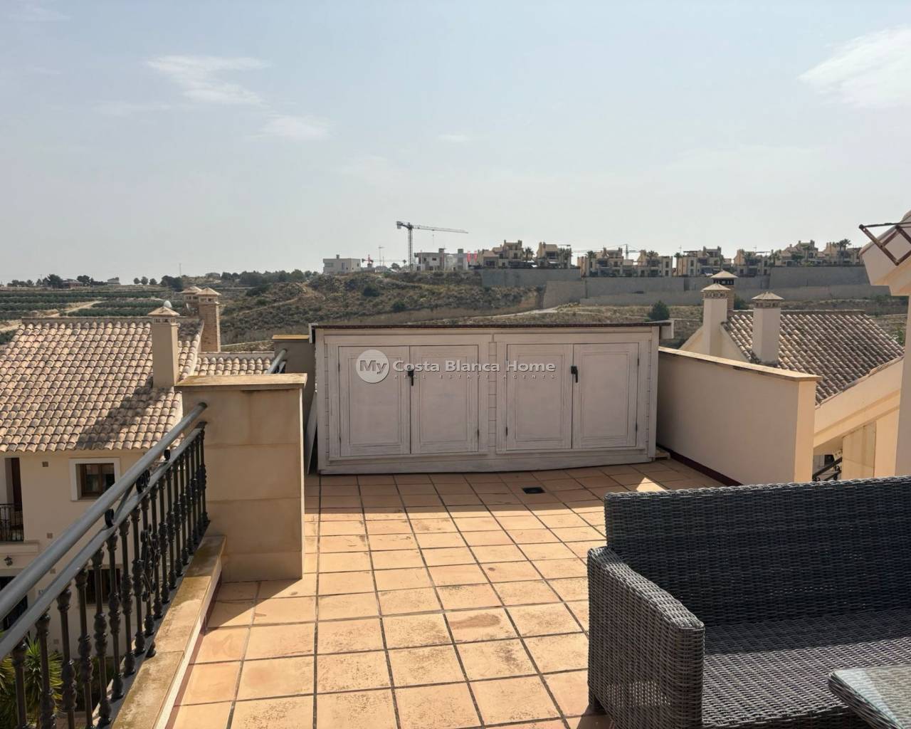 REDUCED IN PRICE !! We are pleased to present this top floor apartment on the La Finca Golf Resort, Algorfa. The property is on the top floor and has an open plan layout with a lounge diner, and American style, fully equipped kitchen. The lounge has a feature fireplace and patio doors that give access to a terrace, perfect for enjoying your morning coffee. Stairs from the terrace lead up to a large private solarium with incredible views of the countryside and mountains. There are two double bedrooms with fitted wardrobes, a family bathroom and en-suite shower room. The apartment is sold fully furnished and ready to move in, making it a ideal full time residence or holiday home that you can enjoy from the day you receive the keys! There are many bars and restaurants, as well as convenience stores, hair dressers, spa hotel and much more. Contact us today to register your interest.