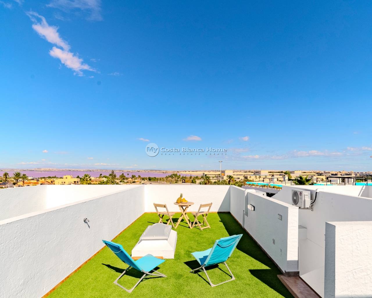 This townhouse is located in the Los Balcones area of Torrevieja, within the residential complex called Los Altos de la Laguna. The property offers views of the Pink Lake and provides a functional living space. The home is a duplex with two floors connected by an internal staircase. It has a total built area of approximately 74.69 m², with a usable interior space of about 69.69 m². The layout includes multiple rooms and a porch. The kitchen is separate and fully equipped with modern appliances. There are three bedrooms with built-in wardrobes, one of which has access to a balcony overlooking the community swimming pool. The property also has two bathrooms. Outside, the property features a private rooftop solarium of around 22.77 m², access to a community swimming pool, and a front garden of about 15 m². These spaces provide options for outdoor use. A private parking space is included. The house is constructed with materials such as porcelain flooring and custom carpentry. It is situated in a quiet area close to supermarkets, restaurants, schools, and other services. Los Balcones is a residential area in Torrevieja known for its natural surroundings and views of the Pink Lake. The climate is mild year-round, suitable for both permanent residence and vacation use.
