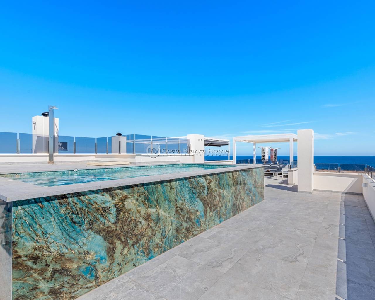 Located in the exclusive Amanecer Deluxe residential complex, this two-storey apartment offers an excellent combination of location, comfort and sea views. Situated in Orihuela Costa, just steps from the Mediterranean and close to all essential services, it is ideal as a permanent residence or holiday investment. The property features three bedrooms, two bathrooms (one en suite), an independent kitchen, and a spacious living-dining area. All rooms, including the kitchen, have direct access to a continuous balcony with sea views and space to sit and enjoy the outdoors. It is sold fully furnished and equipped with high-quality materials: PVC windows with electric shutters, underfloor heating in bathrooms, and modern finishes. On the upper floor, you'll find a private solarium with a swimming pool, perfect for relaxing in complete privacy. The apartment also includes a large, enclosed parking space within the complex. The residential offers communal green areas, a swimming pool and a children's playground, all in a quiet and well-maintained setting.