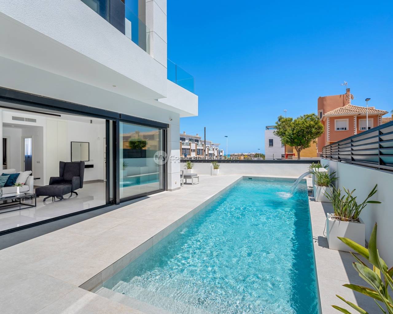 Situated on a 347m² plot, this contemporary villa—built in 2019—offers a refined blend of modern architecture and comfortable living. Spanning 194m² across three levels, the home features four generously sized bedrooms and three bathrooms, with a layout designed for both privacy and functionality. The open-plan kitchen flows into the dining and living areas, creating a bright, spacious environment with direct access to the garden and terrace through large sliding glass doors, inviting natural light throughout the day. The main entrance is positioned on the north side of the property, while the garden and pool area enjoy a sunny south-facing orientation. Outside, the 36m² private swimming pool serves as a focal point, surrounded by clean, modern landscaping and a selection of lounging and dining areas. A pergola provides a shaded retreat for outdoor meals, and a covered terrace extends the living space outdoors. The rooftop solarium offers open views and a relaxing spot to enjoy the surrounding environment, including partial sea views. Upstairs, the primary suite includes a walk-in closet and access to a private balcony, while two additional bedrooms with built-in wardrobes complete the upper level. A fourth bedroom is located on the ground floor, ideal for guests or flexible use. Additional conveniences include a separate laundry room, a storage area, and private parking on the plot. With its thoughtful layout, quality finishes, and excellent orientation, this home presents a modern lifestyle just minutes from the sea.
