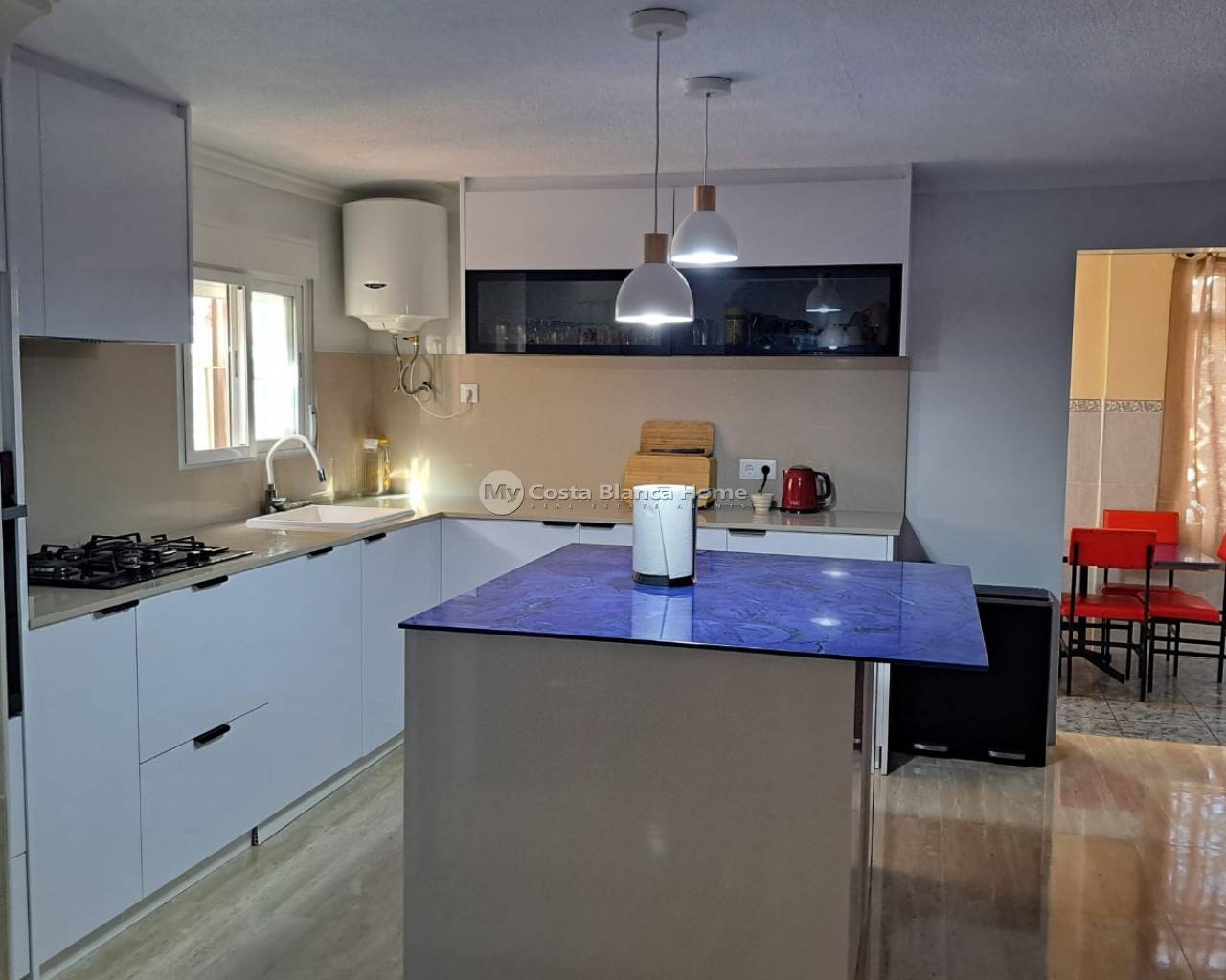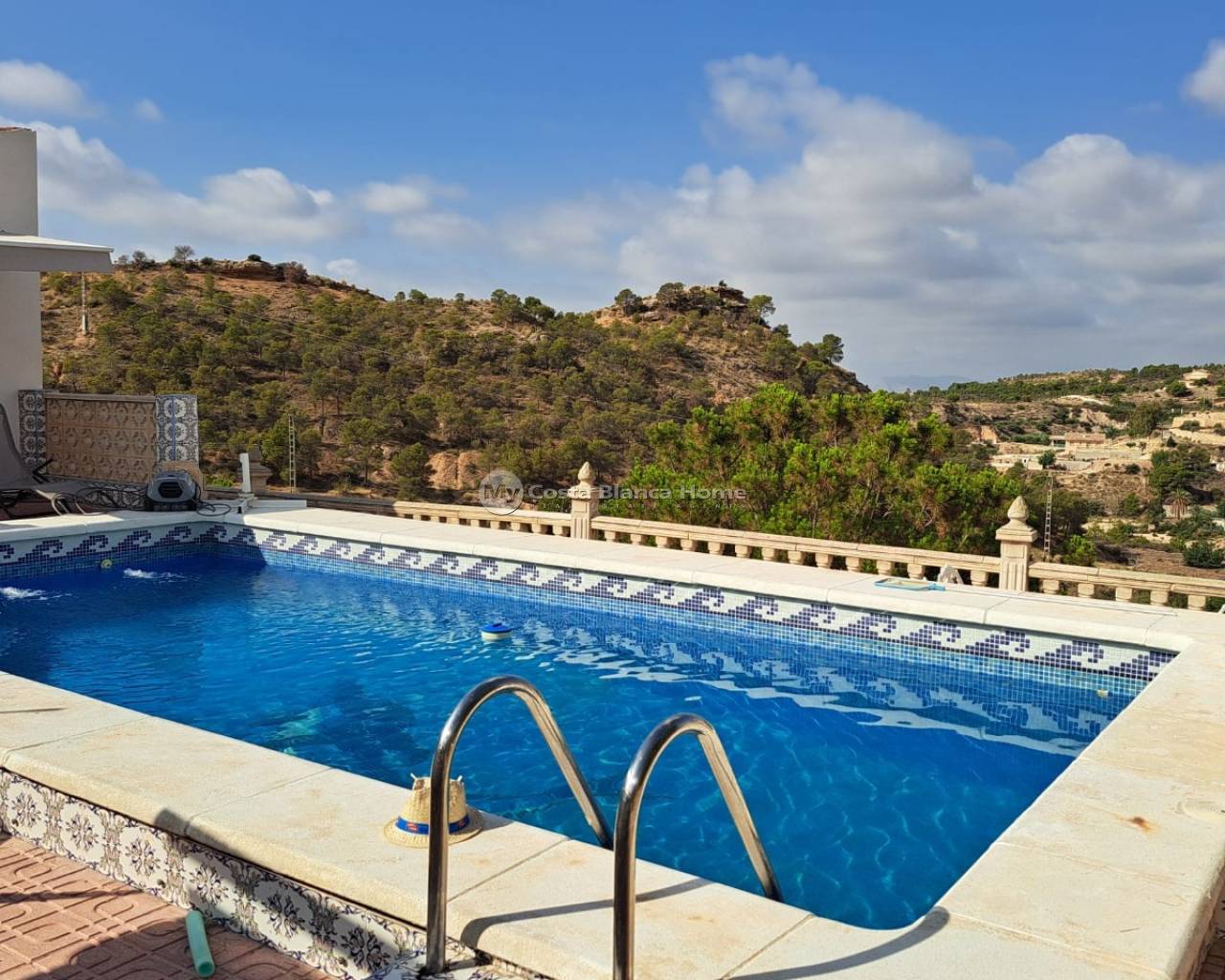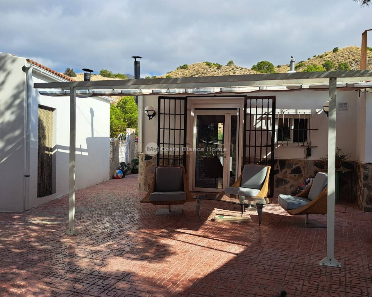 Rustic country house on the outskirts of Crevillente (Alicante), just 25 minutes from the beach, with stunning mountain views which can be admired from the property. The house has been largely renovated and consists of 4 bedrooms, one of which is a cave bedroom, 1 new bathroom, a large living room with a chimney, a dinning / lounge area with chimney, a completely new kitchen, a covered terrace and a renovated roof terrace area. It has a living area of 140m² and a plot of 9871m², although only the house and garden area is fully fenced. The house has multiple air conditioning units. The garden features a private pool, a large terrace, a summer kitchen with Pizza oven, that could be converted into a guest apartment, an external bathroom, a covered barbecue area and a huge storage room built into the mountain. There is also a carport in the entrance area. Most of the property is mountainous with some olive and pomegranate trees on individule layered plateau area. The house has electricity, mains water, irrigation water and a newly installed septic tank with a pump that pumps the water up the hill so the land can be irrigated.