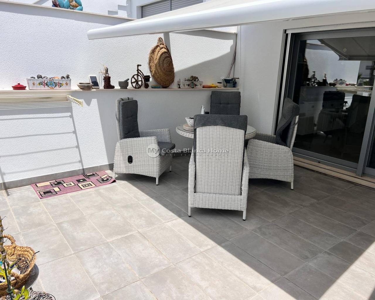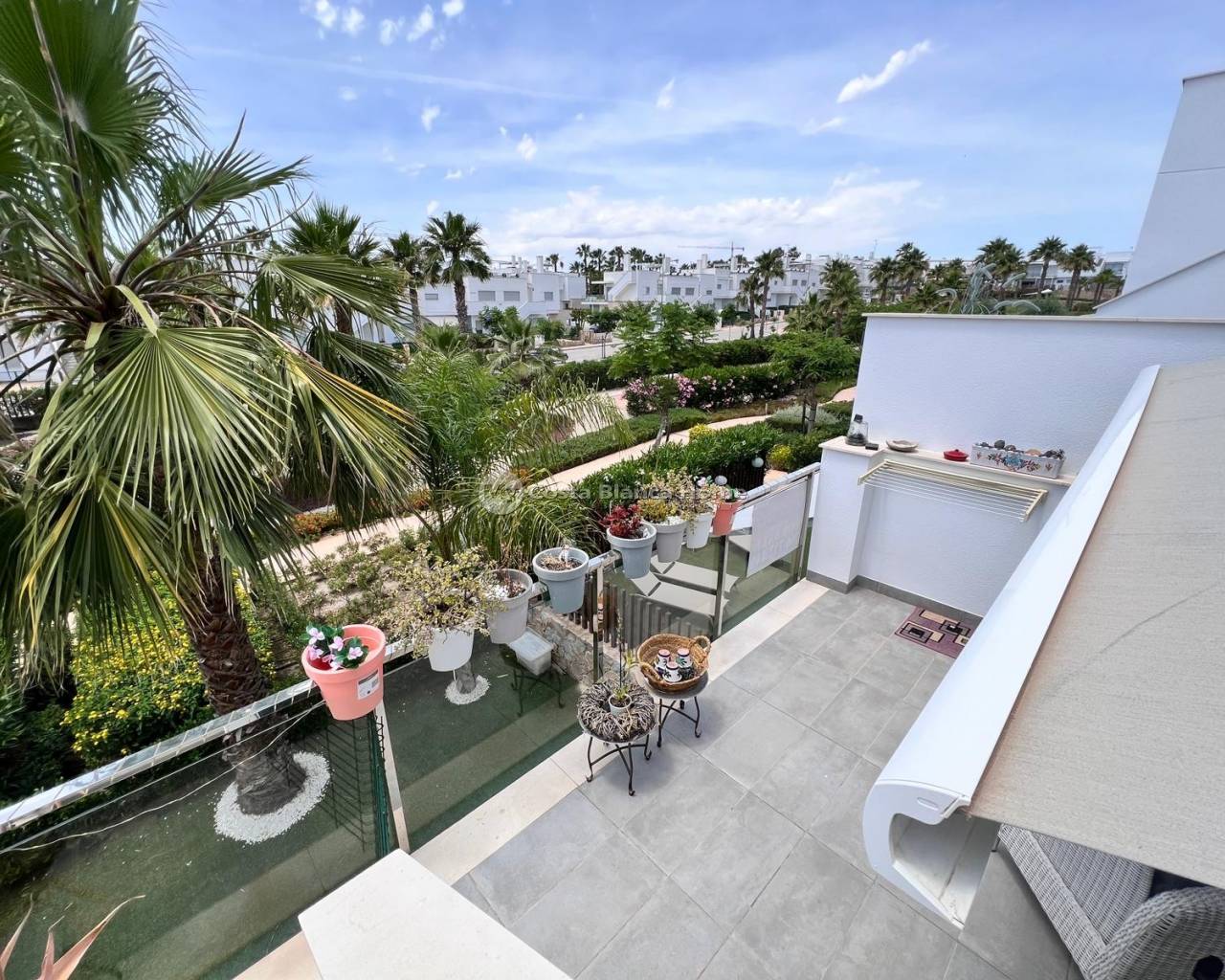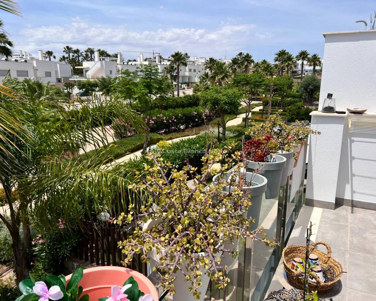 Located in one of the most sought after areas of the Costa Blanca, this bright first floor apartment offers comfort, style and a great location in the Vistabella Golf - Entre Naranjos residential complex. The property consists of two bedrooms with fitted wardrobes, two bathrooms and a modern, fully equipped open kitchen. The living/dining room opens onto a pleasant and spacious private terrace where you can enjoy the Mediterranean climate and the beautiful views of the communal gardens and swimming pool. The property also has a large private solarium, ideal for sunbathing, dining and relaxing. There is a solar-powered Jacuzzi on the solarium to relax at the end of the day. The house has air conditioning, anti-burglary door, intercom and is sold partly furnished. The property is located in a well maintained complex with access to a communal pool and green areas. Private parking included in the price. Just a 5 minute walk to bars, restaurants and supermarkets 5 minutes from Vistabella Golf Course 20 minutes drive from the beaches 40 minutes from Alicante airport Ideal as a holiday home, investment or permanent residence.