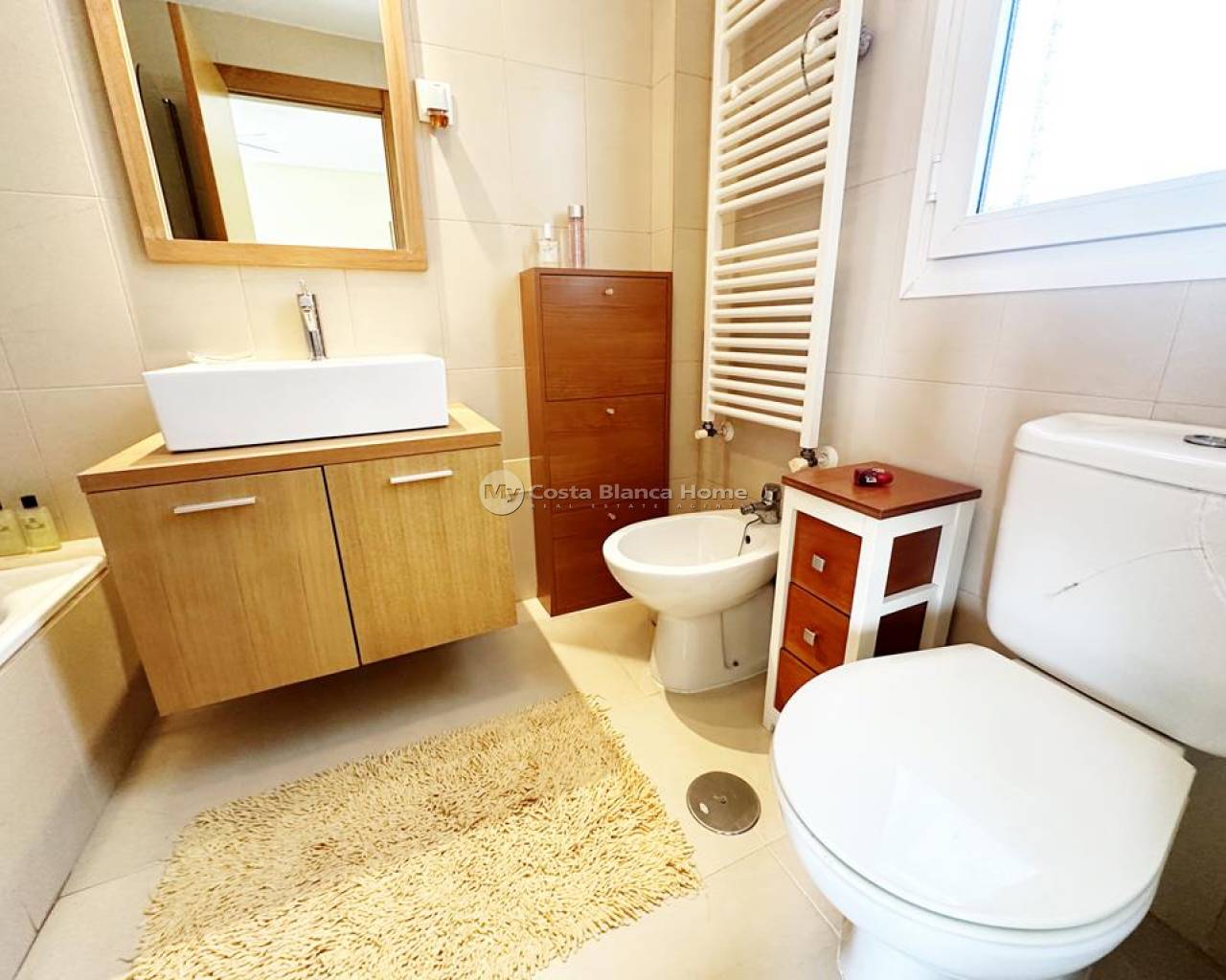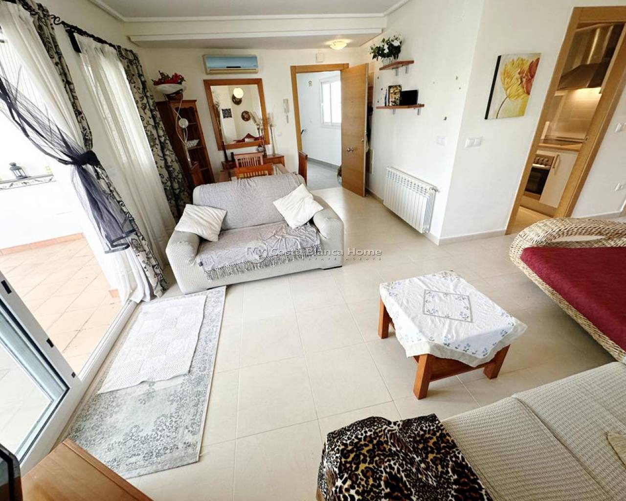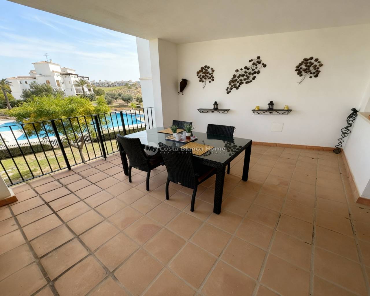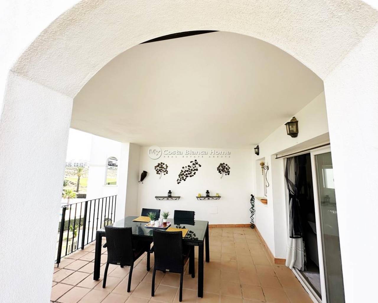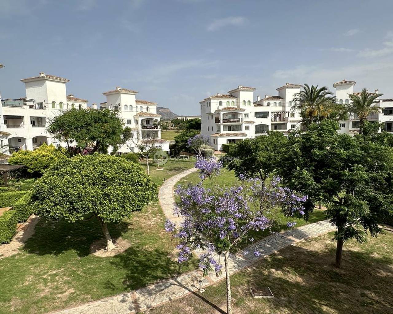 We take great pleasure to offer this rare two bedroom TWO BATHROOM end apartment on the stunning Hacienda Riquelme Golf Resort. The property is in a prime location, close to the El Cason clubhouse and supermarket. It is being sold furnished, with aircon in the lounge, gas central heating throughout, lift and stair access and allocated underground parking. The village of Sucina is a 5 minutes drive which offers an array of bars, restaurants and amenities. There is a bike path which would take 15 minutes to get to Sucina. This second floor apartment is like a top floor as it does not have another property above only the terrace of the penthouse. On entering the apartment there is an L shaped lounge diner with lots of light due to having three windows and large patio doors to the covered terrace which has views over the pool and golf. There is a galley kitchen with cupboards on both sides, this could easily be open planned to the lounge. The utility room has had a window installed to keep everything clean and ideal for storage. Opposite the kitchen is a family shower room which benefits from a window giving great ventilation. Both double bedroom have fitted wardrobe and doors leading to their own private juliet balconies. The master bedroom has an ensuite which also has a window. True two bathroom properties on Riquelme are very rare as they only built a few blocks with these types of apartments in them. Contact us to arrange to view this superb property.