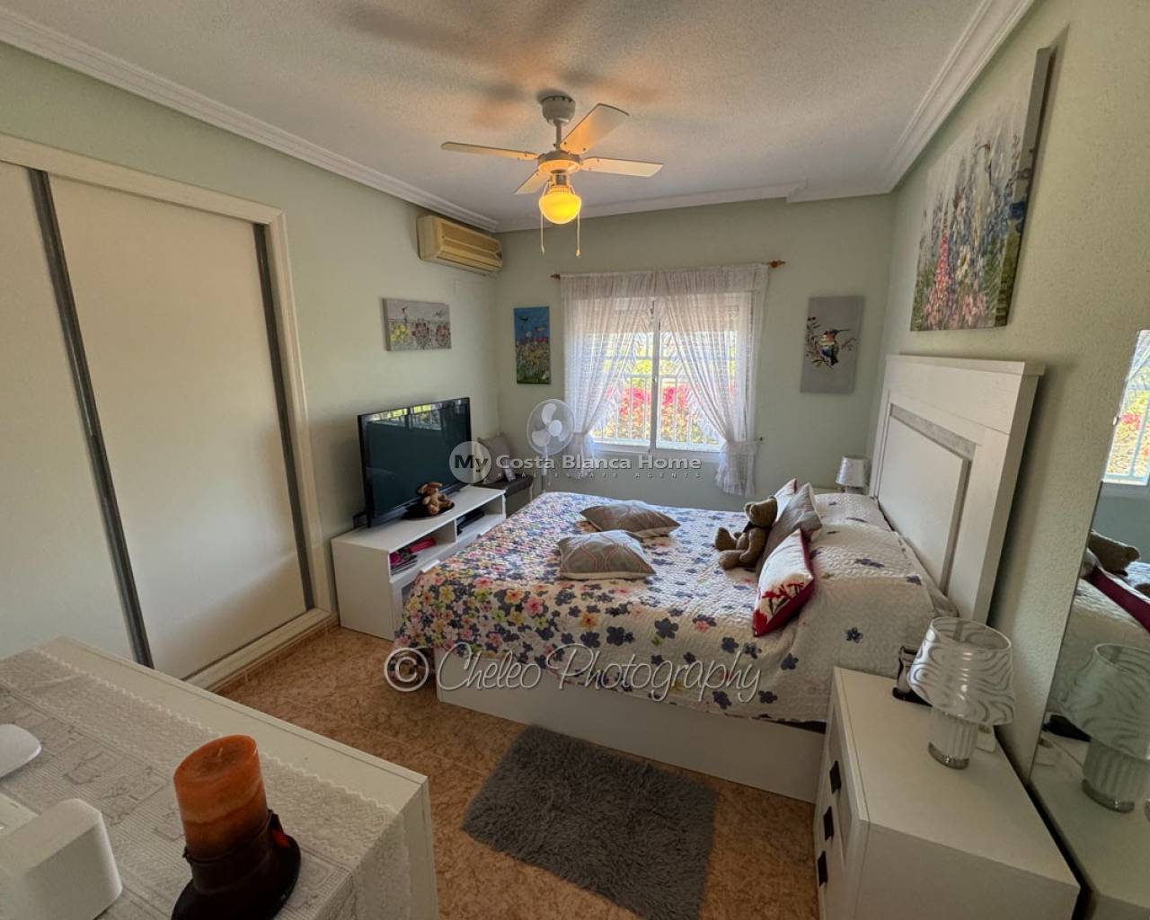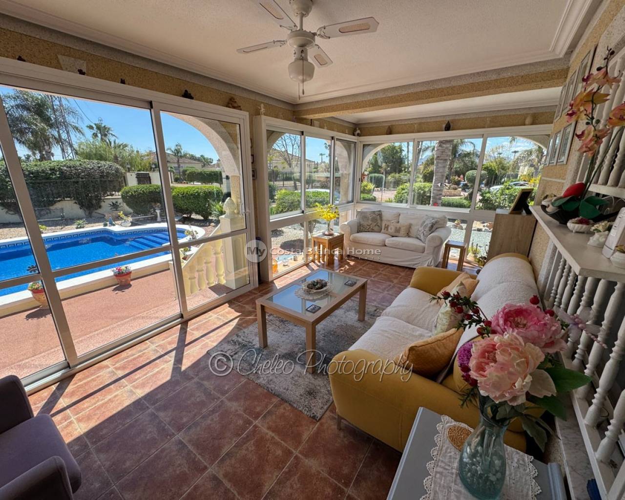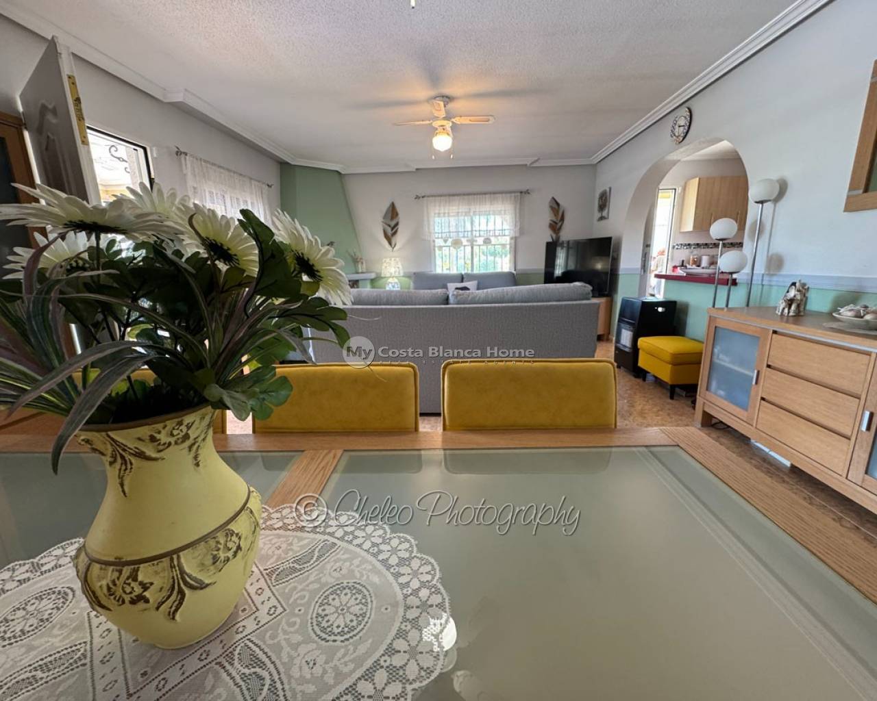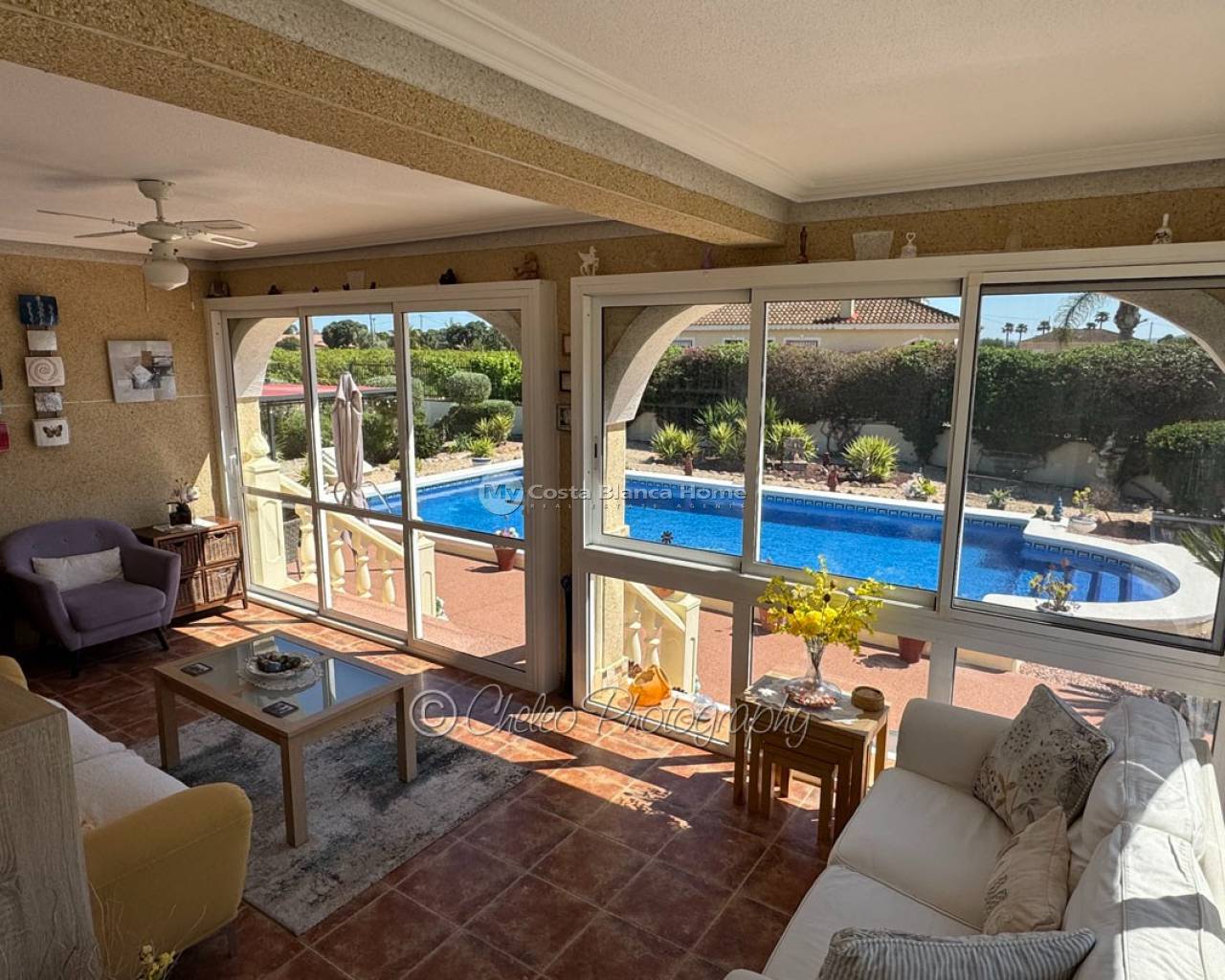 The beautiful 140sq meters home consists of a very large living room with wood burning fireplace, 3 double bedrooms with fitted wardrobes, 2 bathrooms ( master bedroom en-suite), modernised fully fitted kitchen with separate utility room, large fully glazed porch with nice views to the swimming pool.