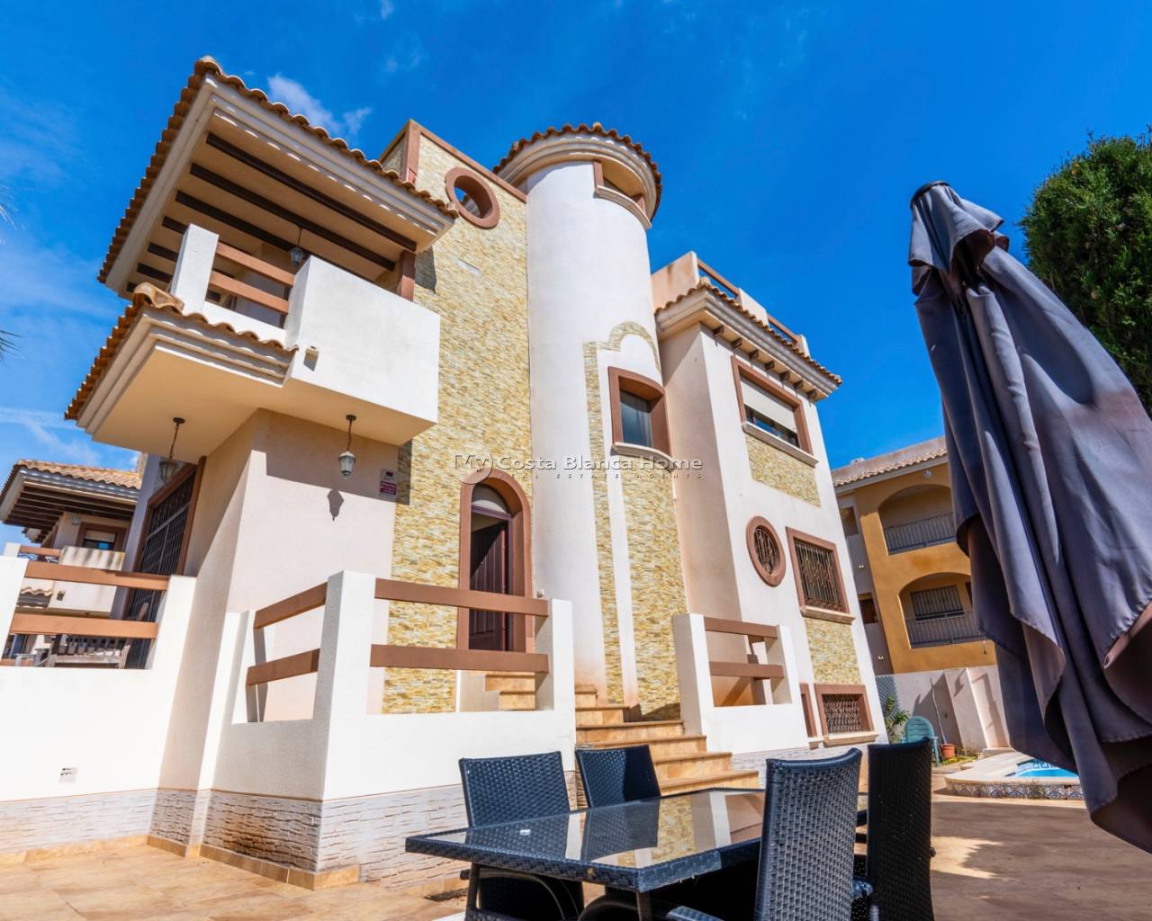 Nous vous présentons cette spacieuse villa individuelle située à Villamartín, Orihuela. La propriété offre 180 m² construits sur un terrain de 250 m², répartis sur deux étages, ainsi qu’un sous-sol habitable et un solarium privé. Sa distribution fonctionnelle propose des espaces larges et polyvalents. Au rez-de-chaussée se trouvent une chambre, une salle de bain complète et une cuisine indépendante à côté du salon-salle à manger. L’étage supérieur comprend trois chambres supplémentaires. Le sous-sol ajoute deux pièces supplémentaires, idéales comme chambres d’amis, bureau ou espace de loisirs. Au total, la maison dispose de six chambres et trois salles de bains. À l’extérieur, la propriété offre un jardin, une piscine privée et des terrasses. Le solarium permet de profiter du soleil et de vues dégagées. La maison dispose également de climatisation, cheminée, placards intégrés et stationnement sur la parcelle. Son orientation sud-ouest garantit une excellente luminosité. Située dans un quartier très recherché de Villamartín, proche des services, des terrains de golf et à quelques minutes des plages de la Costa Blanca.