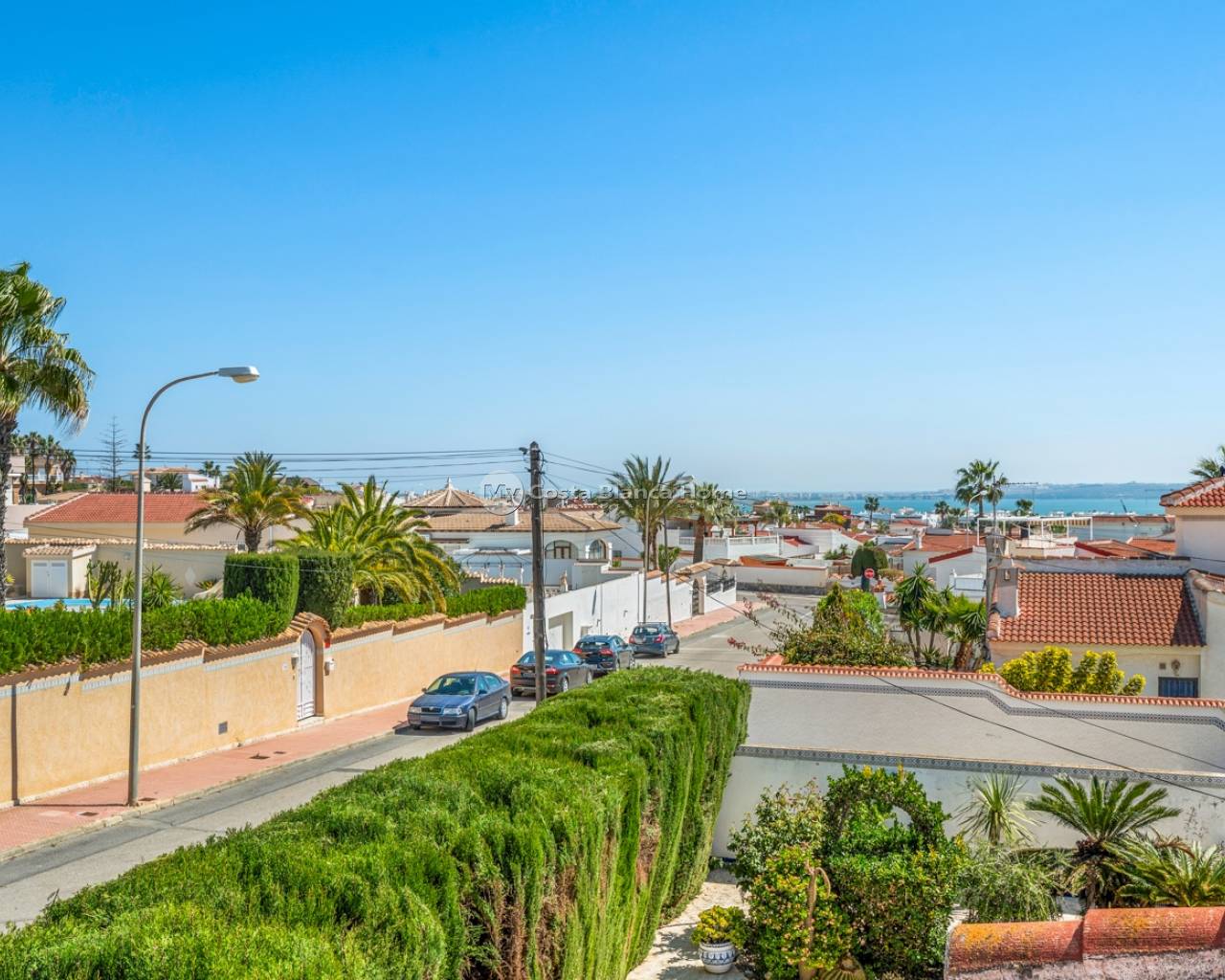 Charmante villa de 2 chambres et 2 salles de bains avec piscine privée à Ciudad Quesada. La villa est de plain-pied et offre une surface habitable de 100 m². Elle se compose de deux chambres doubles avec placards intégrés, d’une salle de bains avec baignoire, d’une cuisine ouverte sur le séjour, ainsi que d’une terrasse vitrée servant de salle à manger. La maison est équipée de la climatisation (chaud/froid), d’une cheminée dans le salon et de fenêtres à double vitrage. La propriété dispose également d’un garage avec salle de bains, accessible par un portail automatique. Espace extérieurLa villa est située sur un terrain d’angle orienté au sud de 504 m². Le jardin comprend une piscine, une douche extérieure, un abri et de nombreux espaces pour s’asseoir à l’extérieur. Une petite terrasse sur le toit se trouve au-dessus du garage.