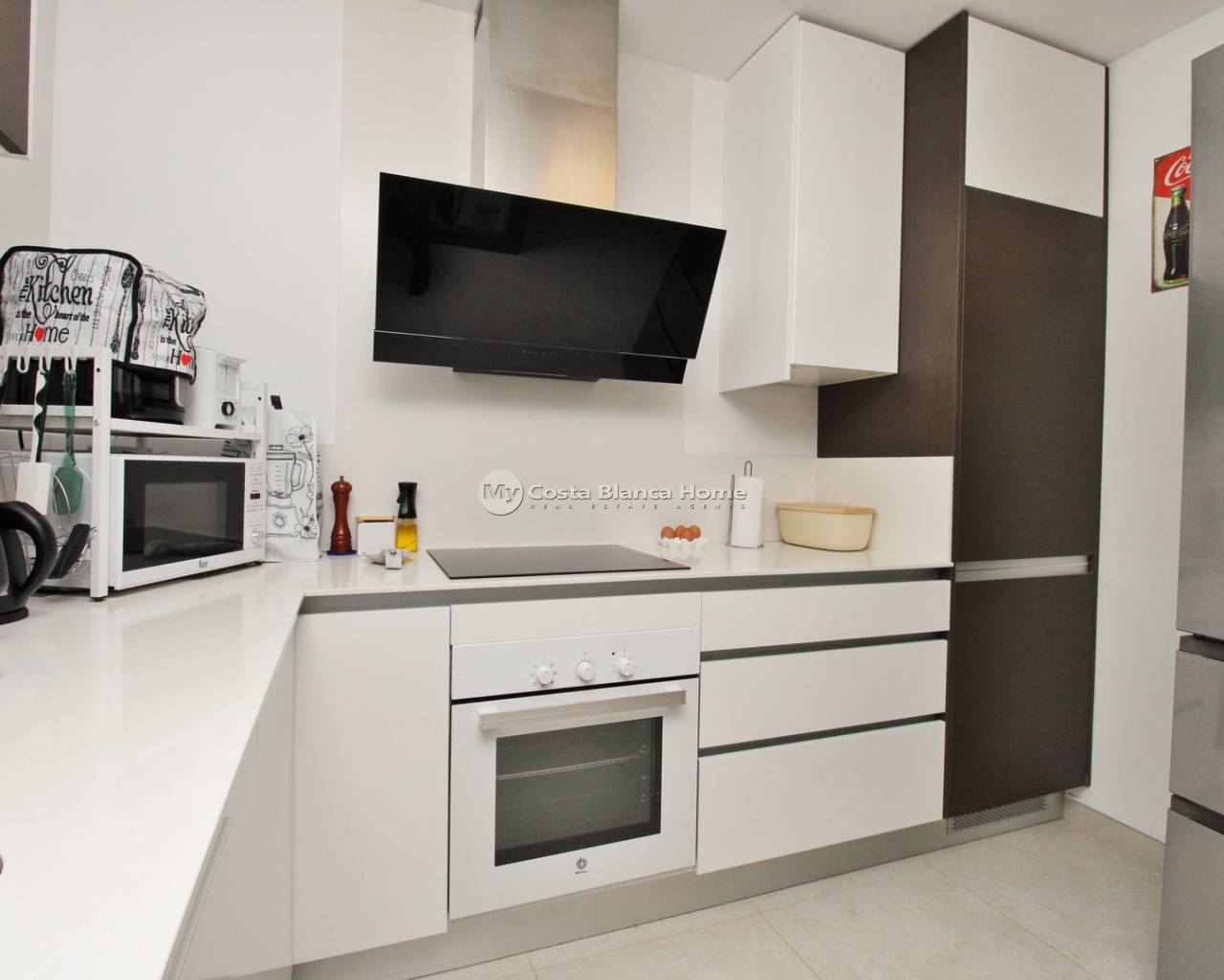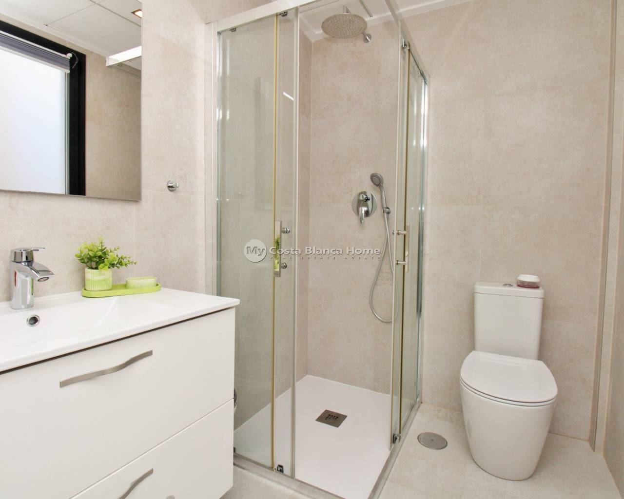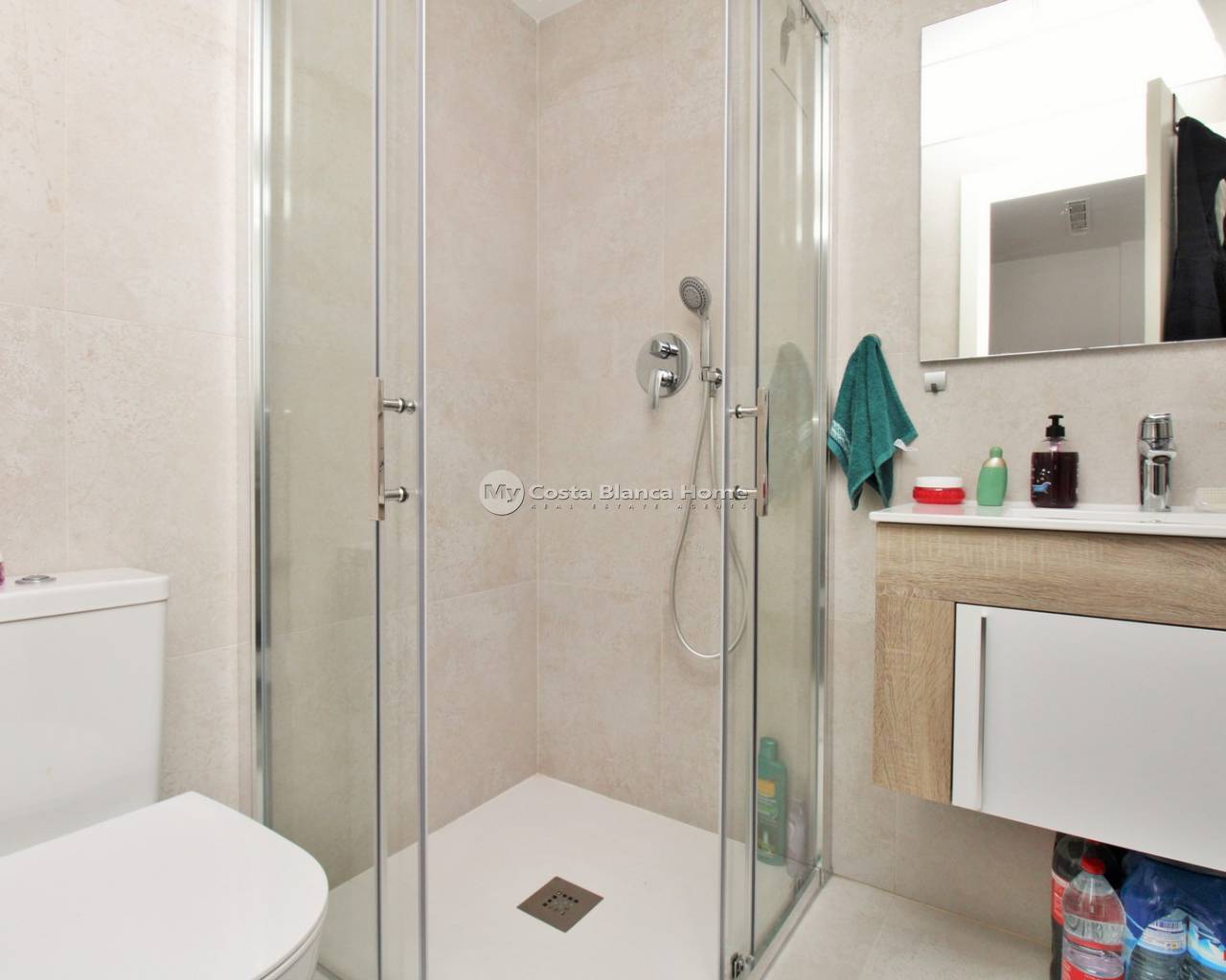 Deze moderne tussenwoning met 2 slaapkamers en 3 badkamers is gelegen in de populaire wijk Pau 26 in Villamartin. Gebouwd in 2019 en in uitstekende staat. De woning beschikt over een privé voorterras met zwembad, ideaal voor buitenleven. Op de begane grond bevindt zich een ruime open woon- en eetkamer met een volledig uitgeruste keuken aan de achterzijde en een aparte bijkeuken. Daarnaast is er een badkamer met inloopdouche. Op de eerste verdieping zijn twee tweepersoonsslaapkamers, beide met inbouwkasten en en-suite badkamers. Eén slaapkamer heeft een privéterras. Via een buitentrap bereikt u het privé dakterras, met voldoende ruimte voor zitgelegenheid en ligbedden. De woning maakt deel uit van een goed onderhouden complex met toegang tot een gemeenschappelijk zwembad. Gelegen nabij Villamartin Plaza, golfbanen, winkels en restaurants, en op korte rijafstand van Zenia Boulevard en de stranden van Orihuela Costa.