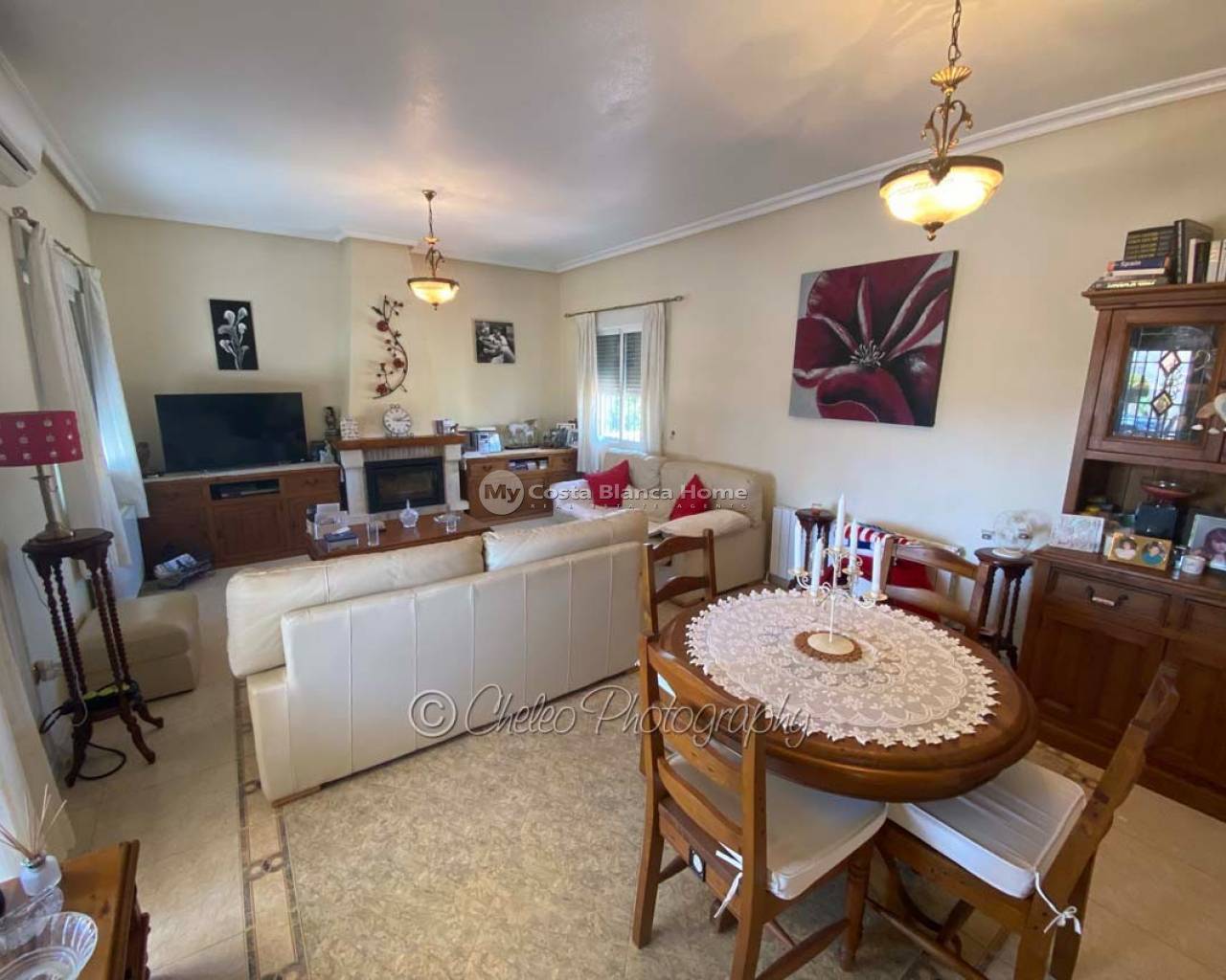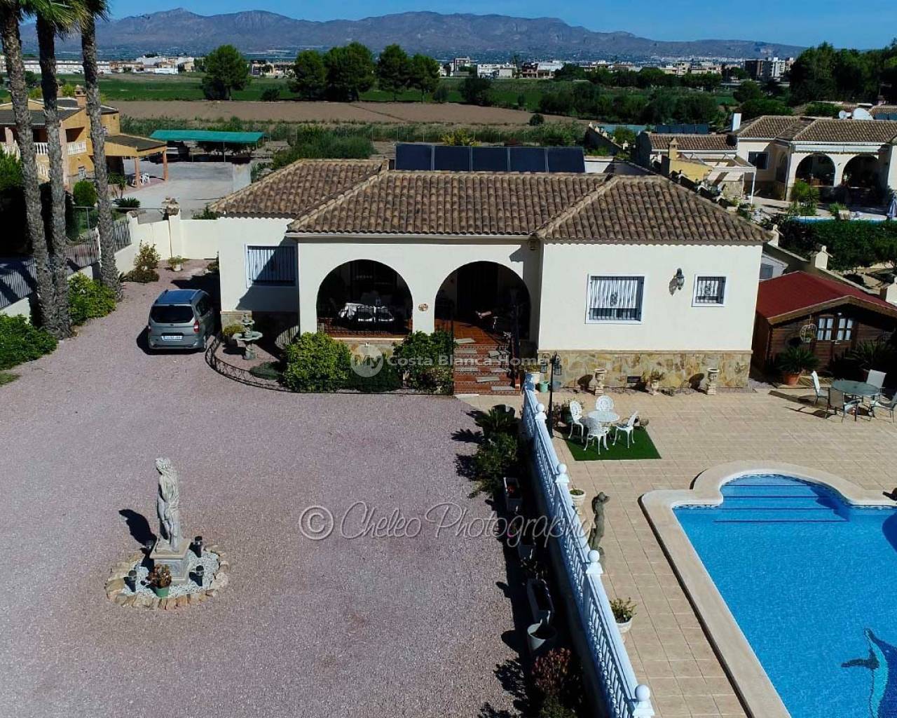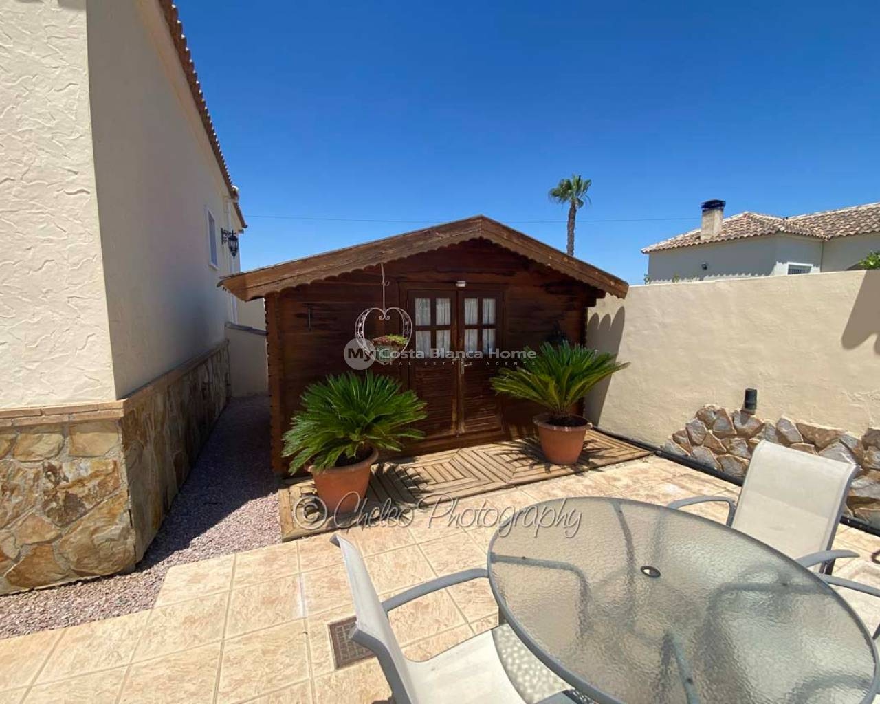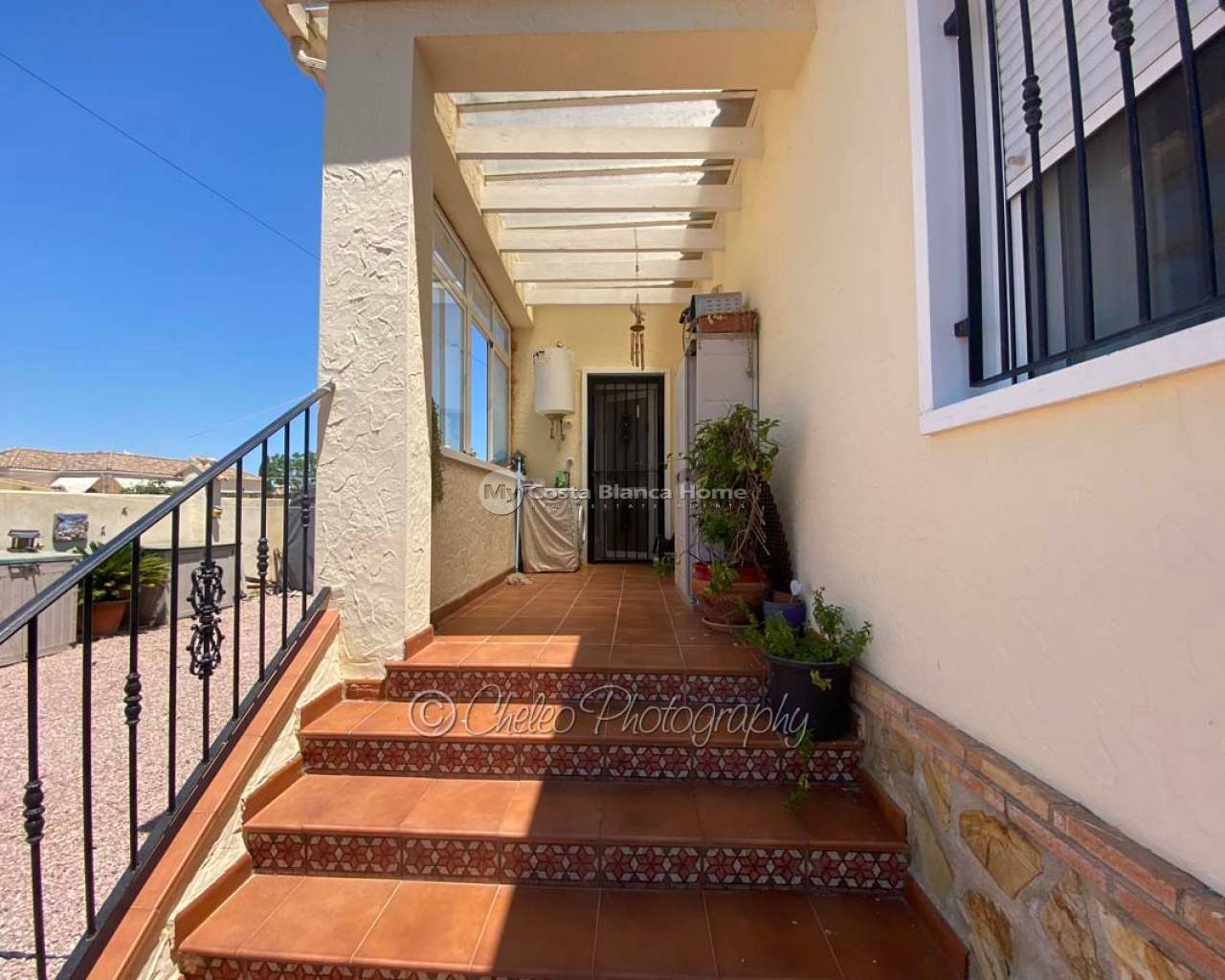 Offered exclusively by My Costa Blanca Home, this gorgeous detached villa of approx. 140m2 build size is set on a fully landscaped and walled plot of 1,170m2 walking distance to the town of Catral. Comprising of a covered porch area, entrance hallway, spacious air conditioned lounge with fireplace, log burner and dining area, fully fitted kitchen with utility room and access to the garden via a UK standard glazed door, master bedroom with fitted wardrobes and ensuite bathroom, 2 further double bedrooms with fitted wardrobes plus a family shower room. All bedrooms have ceiling fans and Panasonic air conditioning installed. The property is fully alarmed and features an outside perimeter alarm, all the windows have locks, gas central heating, mains water and electric plus fibre optic internet.