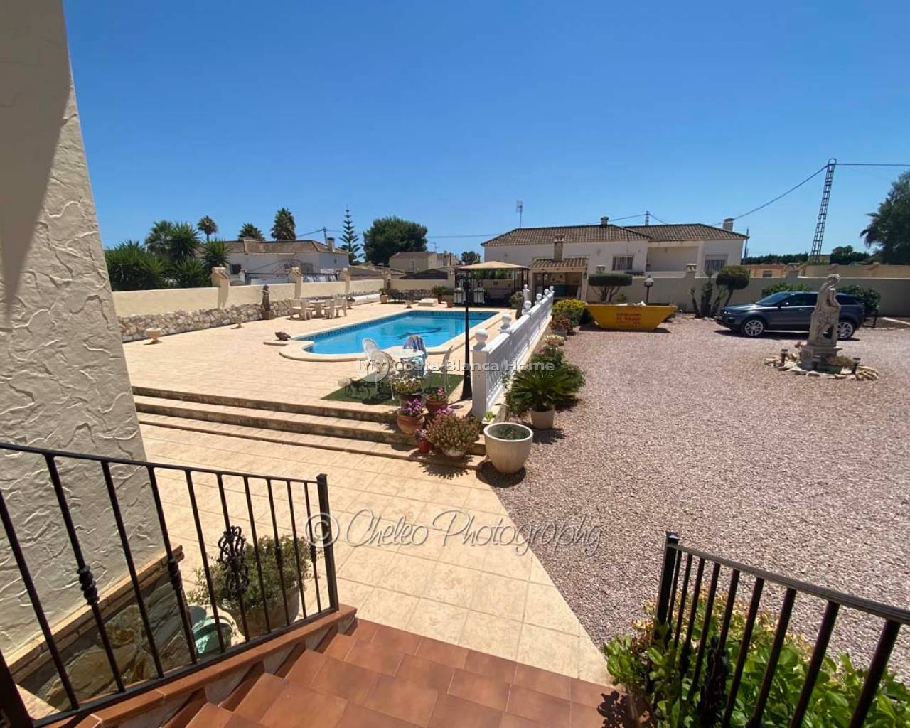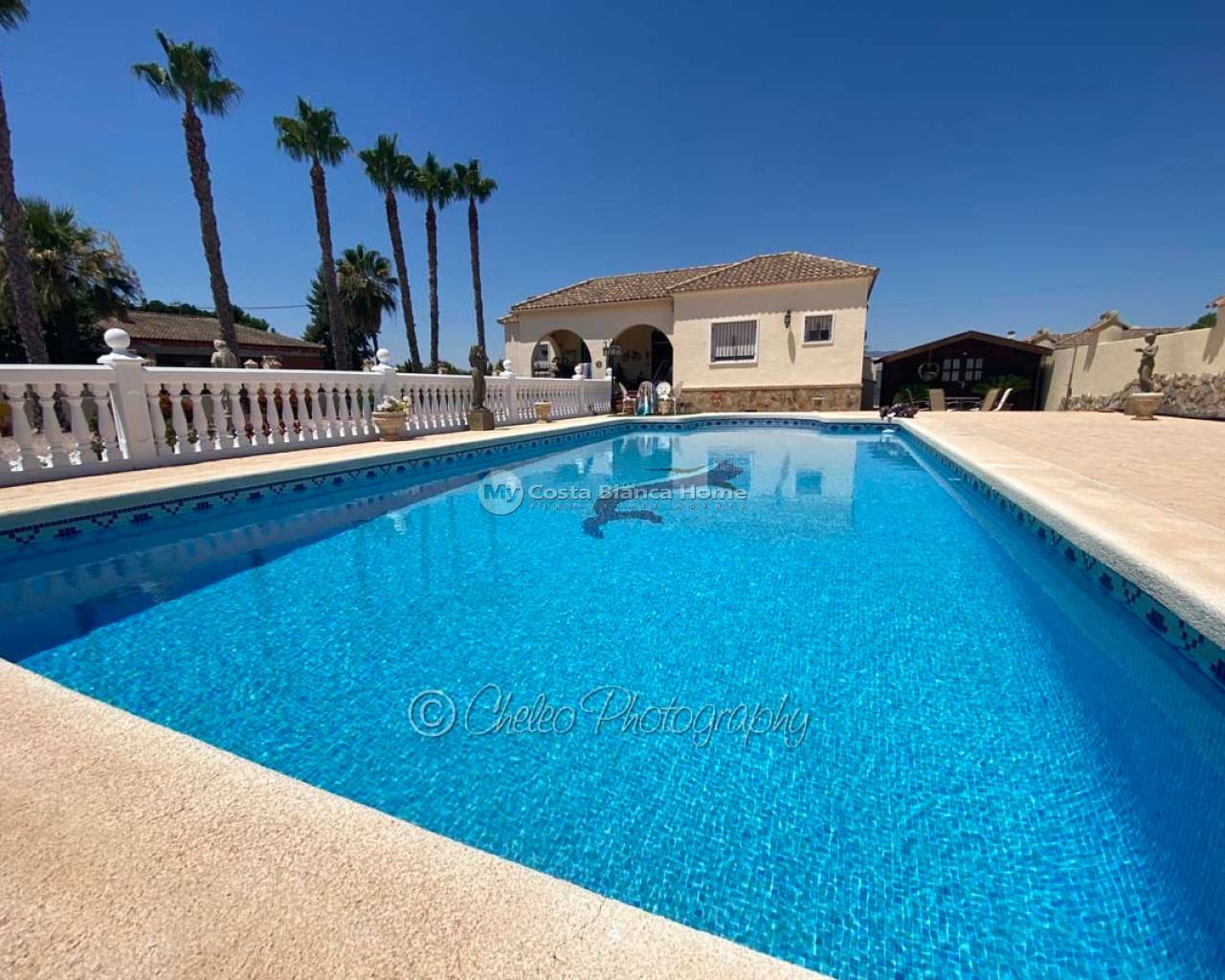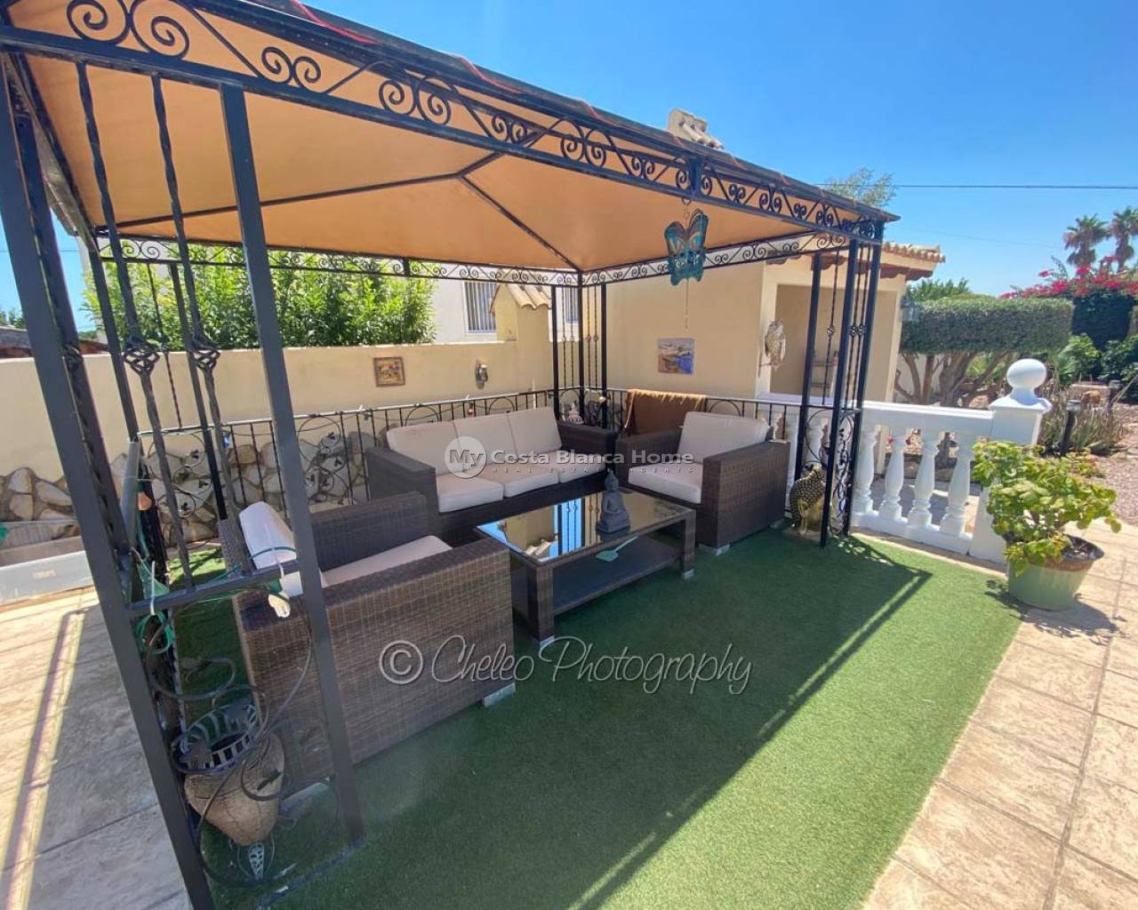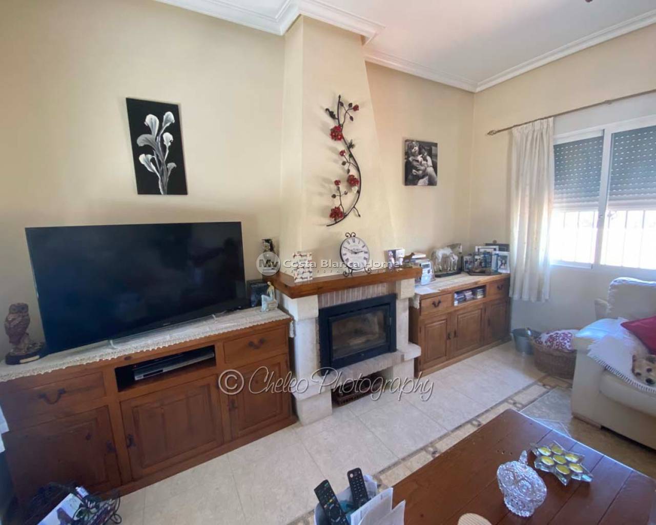 Offered exclusively by My Costa Blanca Home, this gorgeous detached villa of approx. 140m2 build size is set on a fully landscaped and walled plot of 1,170m2 walking distance to the town of Catral. Comprising of a covered porch area, entrance hallway, spacious air conditioned lounge with fireplace, log burner and dining area, fully fitted kitchen with utility room and access to the garden via a UK standard glazed door, master bedroom with fitted wardrobes and ensuite bathroom, 2 further double bedrooms with fitted wardrobes plus a family shower room. All bedrooms have ceiling fans and Panasonic air conditioning installed. The property is fully alarmed and features an outside perimeter alarm, all the windows have locks, gas central heating, mains water and electric plus fibre optic internet.