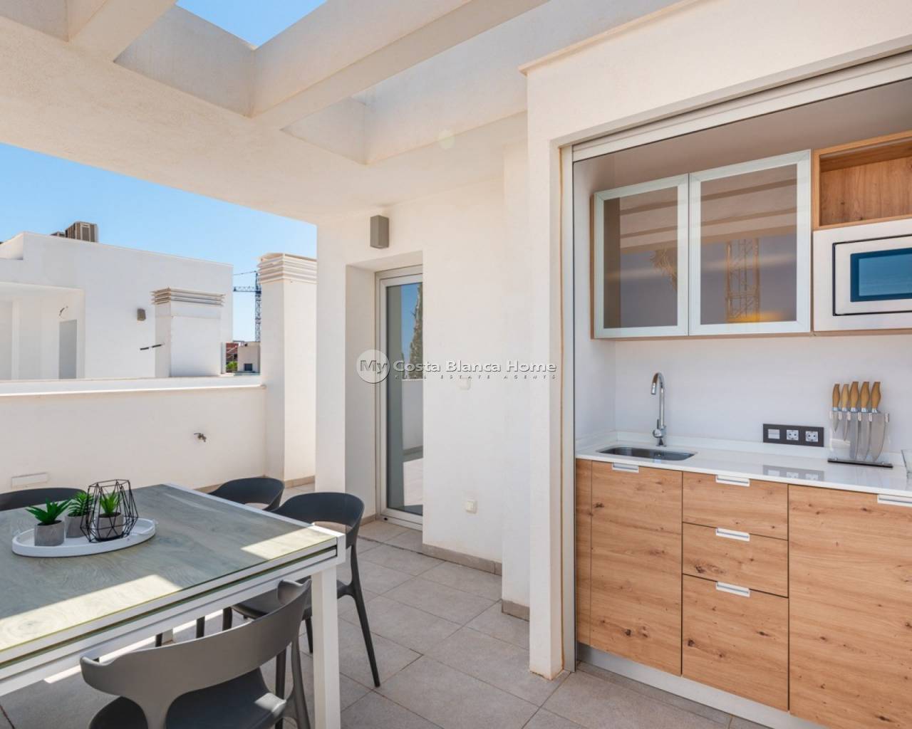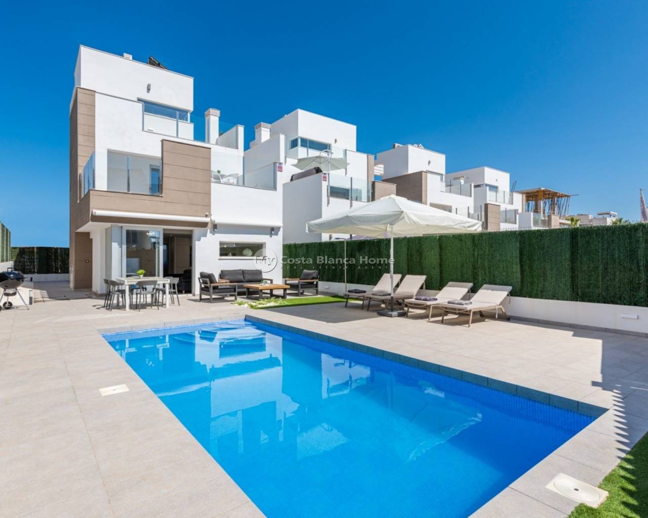 An exceptional contemporary style detached villa built over three floors and just 2 years old is immaculately presented.  You enter the west facing garden onto a large tiled terrace surrounding the private heated pool with Roman steps, with ample space for sun loungers plus off road parking. It is a private space with a dining/seating area complete with sun awnings and patio doors leading into the lounge.  On entering the villa itself you are met with a very spacious and open plan living area with high ceilings and lots of natural sunlight. There is a lounge with patio doors out to the swimming pool, a dining area and fully fitted kitchen. Also on this floor there is a guest cloakroom, and the master bedroom with an en-suite shower and dressing room area with large fitted wardrobes. Stairs lead to the first floor and 2 further double bedrooms, each with fitted wardrobes and a family bathroom. From the landing you can also access a large two level terrace with water and electric supply, perfect for a jacuzzi maybe! A further staircase leads to the fantastic solarium with lovely views of the surrounding area, plenty of dining and relaxing space and a superb summer kitchen with an electric shutter to protect from the sun/rain, with water and electric supply, a sink, fridge, microwave, cupboards, drawers and work surface. This simply stunning property is being sold fully furnished to a high standard and is an absolute gem not to be missed!