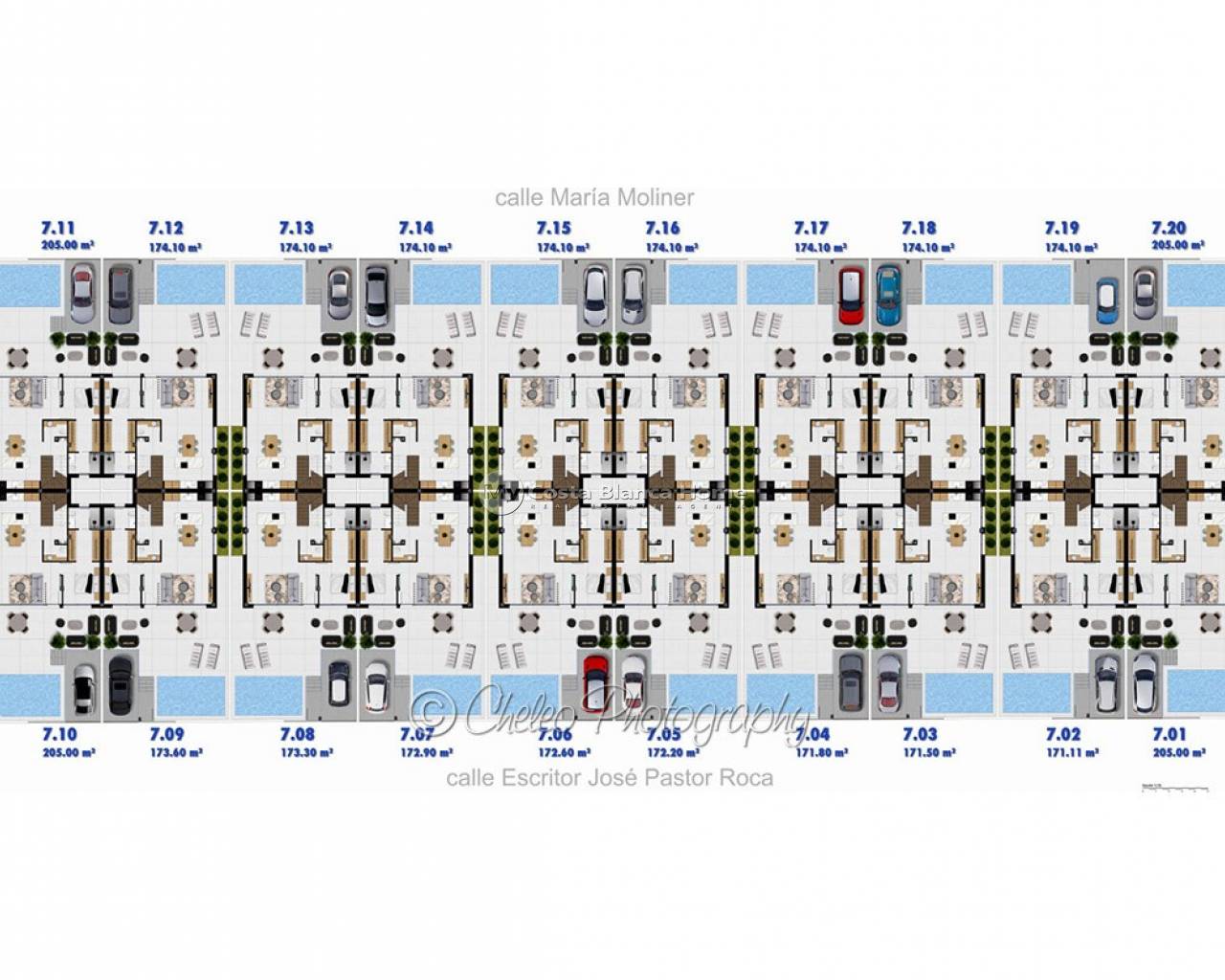 Beautifully designed and presented, each villa has a spacious lounge and open plan kitchen. Ground floor master bedroom features a walk-in wardrobe and ensuite shower room, there is also an independent toilet. The upper floor has two double bedrooms, each with wardrobes and ensuite shower room, each has access to the very private sun terrace, there is also a further terrace to the rear.