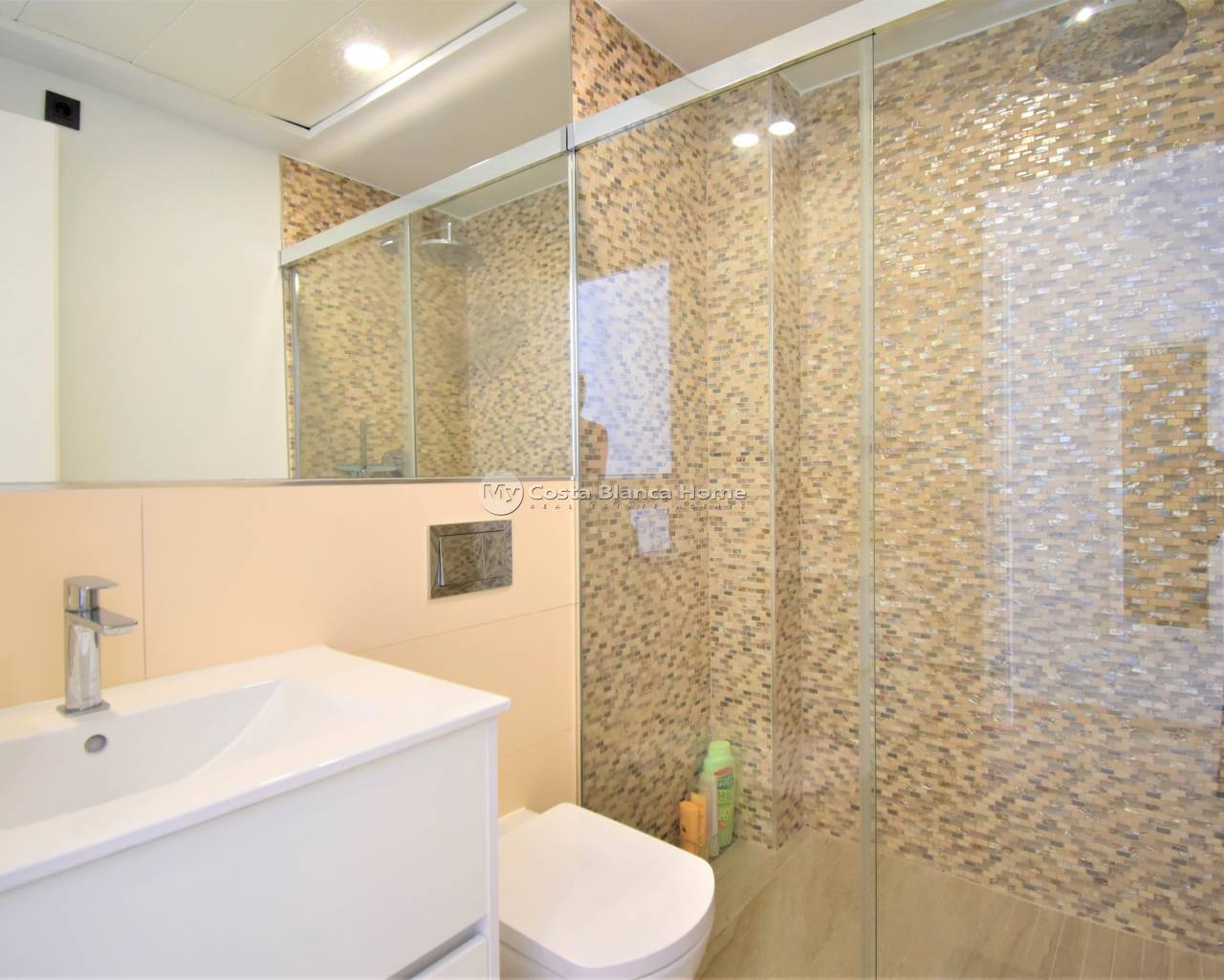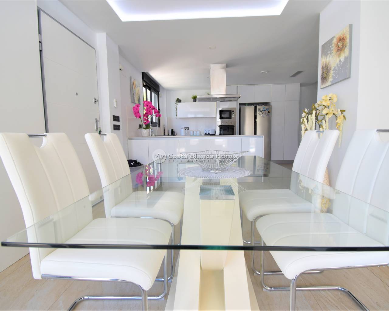 This West Facing, 2018 Built, Three Bedroom, Detached Villa in Las Filipinas, a popular residential area within Villamartin. A variety of bars/restaurants can be found just ten minutes on foot; the nearest main chain supermarket, five minutes by car along with three golf courses, Villamartin Plaza, La Fuente commercial centre. La Zenia Boulevard shopping centre is ten minutes by car and the beaches along the coast fifteen minutes. Having been built by a reputable constructor, the qualities within this property are second to non. The main living area being open plan with two sets of wide sliding doors, one from the lounge and the other the dining area which lead out to the pool area, there are also stairs leading up to the first floor and to the underbuild. The kitchen is fully fitted and there is a shower room plus a double bedroom with en suite shower room along with a terrace. On the first floor there is a further double bedroom with dressing room, en suite and access up to the solarium. The underbuild comprises of a lounge and kitchen area plus a double bedroom with en suite, double sliding doors to the outside and a kitchen area. The garden is tiled with an artificial grassed area, a 7x4 private pool and off road parking Extras include air conditioning, electric gates and built in wardrobes in bedrooms.