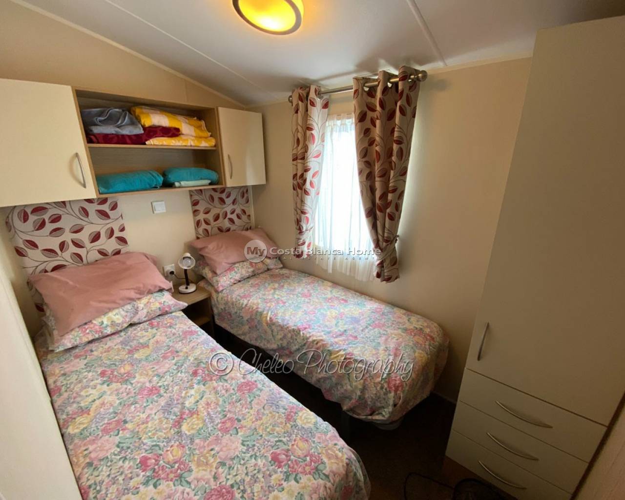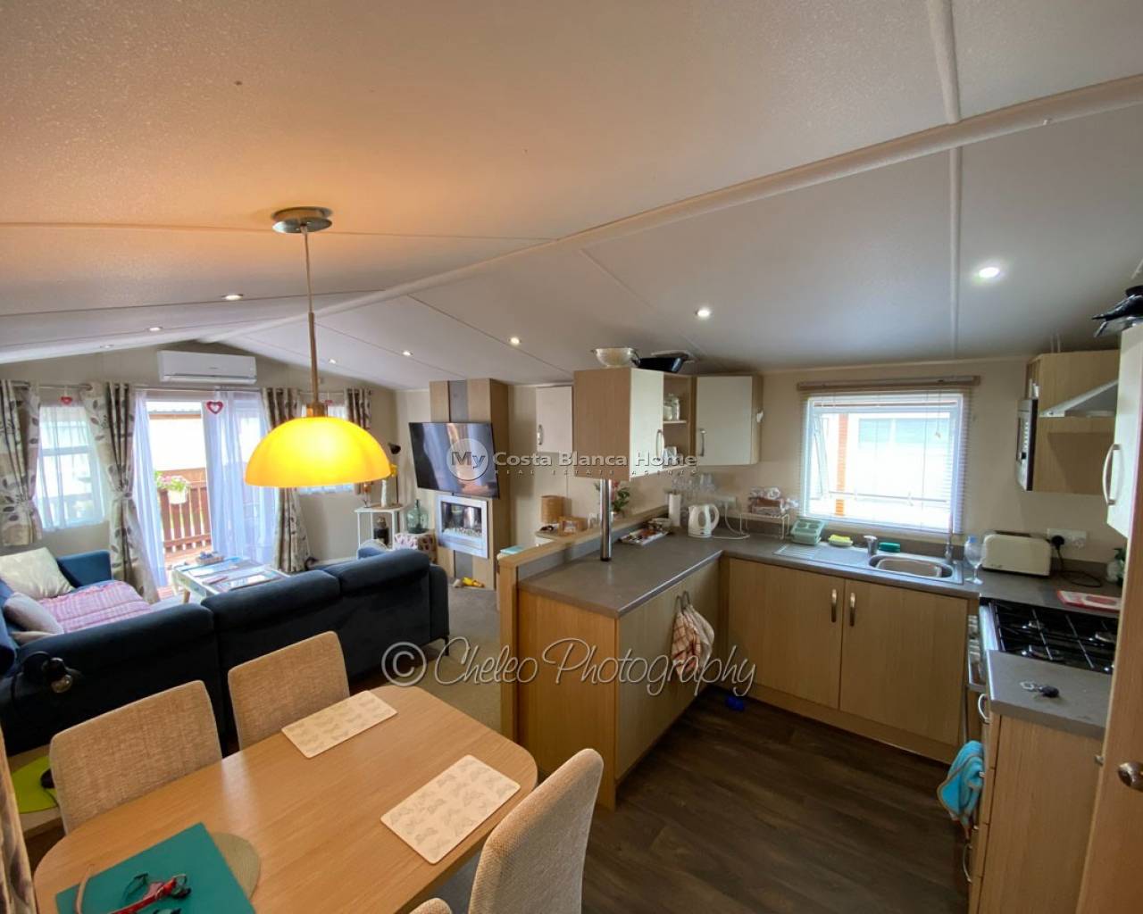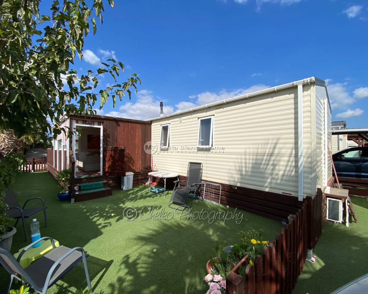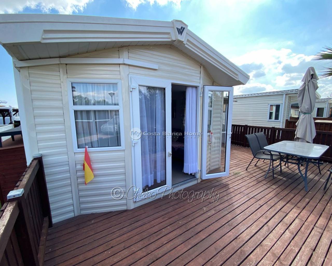 This lovely Willerby Brockenhurst park home of 48m2 is set on a plot of 160m2 situated in Alannia Camping, Crevillente. Comprising of an air conditioned lounge with a gas fire and patio doors accessing the timber decking, open plan fully fitted kitchen and dining area, air conditioned main bedroom with fitted storage units and independant wc, a further twin bedroom with fitted storage units, plus a bathroom with shower. There is a 14m2 covered porch attached to the main entrance plus access to the timber decking which wraps round to the front of the property. Gas central heating is installed throughout.
