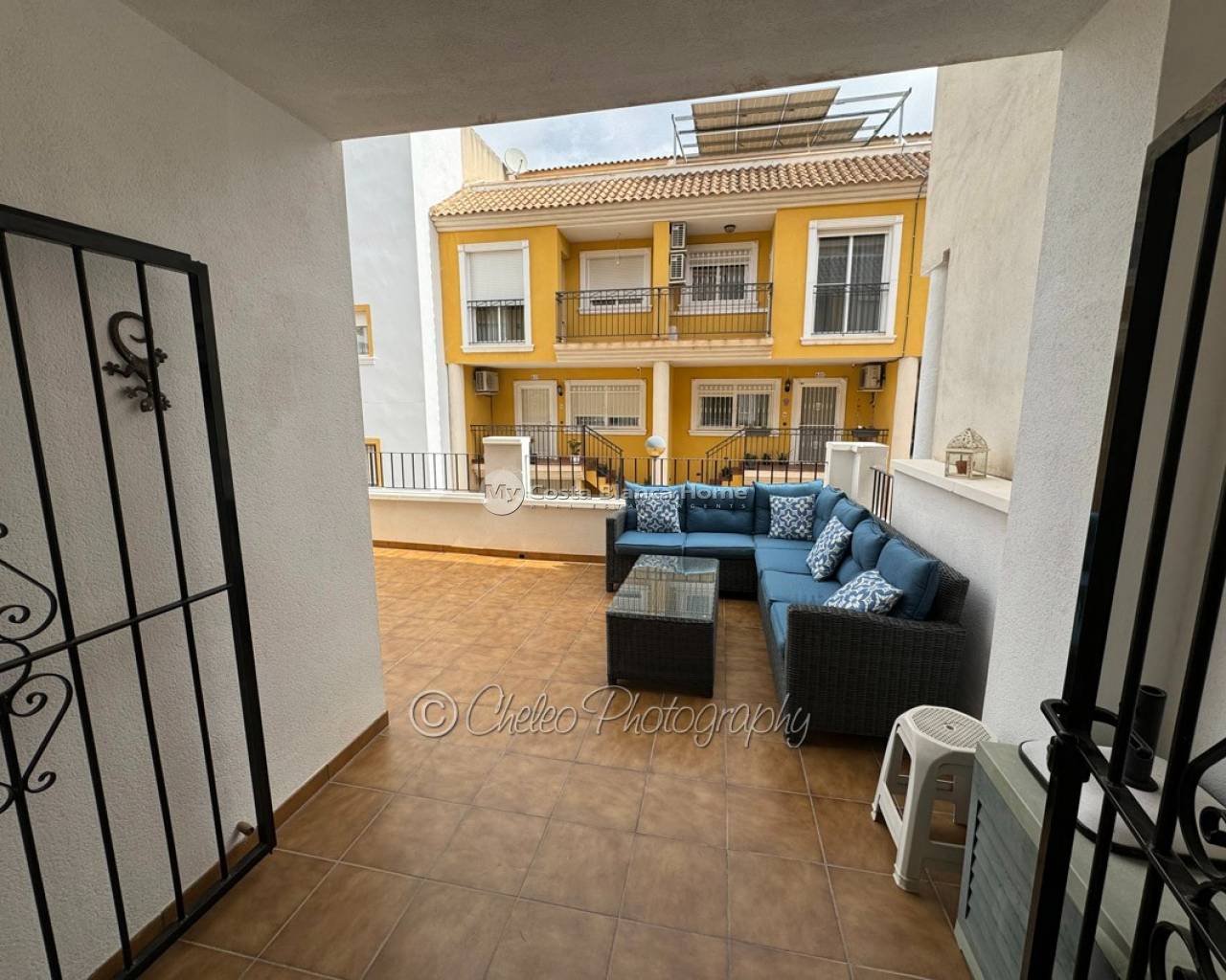 This very attractive raised ground floor apartment is situated in the VillaSol complex close to the centre of Catral, distributed all on one level. Comprising a large lounge with patio doors accessing the fabulous 28m2 terrace, independent kitchen, master bedroom with ensuite shower room, 2 further double/twin bedrooms - one of which has a gallery with the installation for a washing machine, plus a family bathroom . All bedrooms have fitted wardrobes plus there is ducted hot and cold air conditioning installed throughout. There is an intercom entry system to the apartment, communal solarium, the complex has a gorgeous communal pool, gardens and BBQ area. Community fees are set at €550 per year. All furniture is included in the sale.