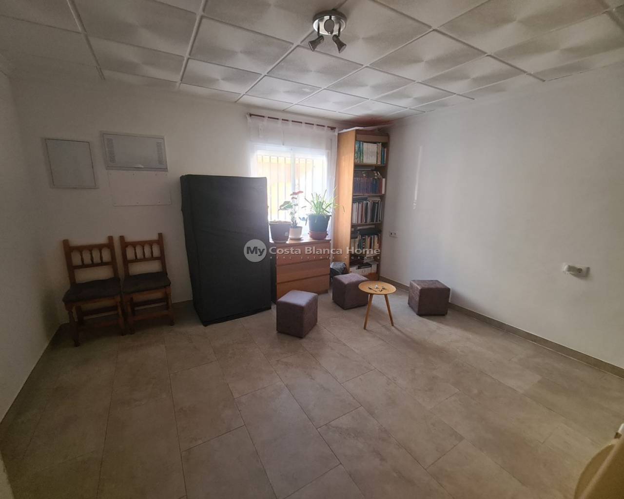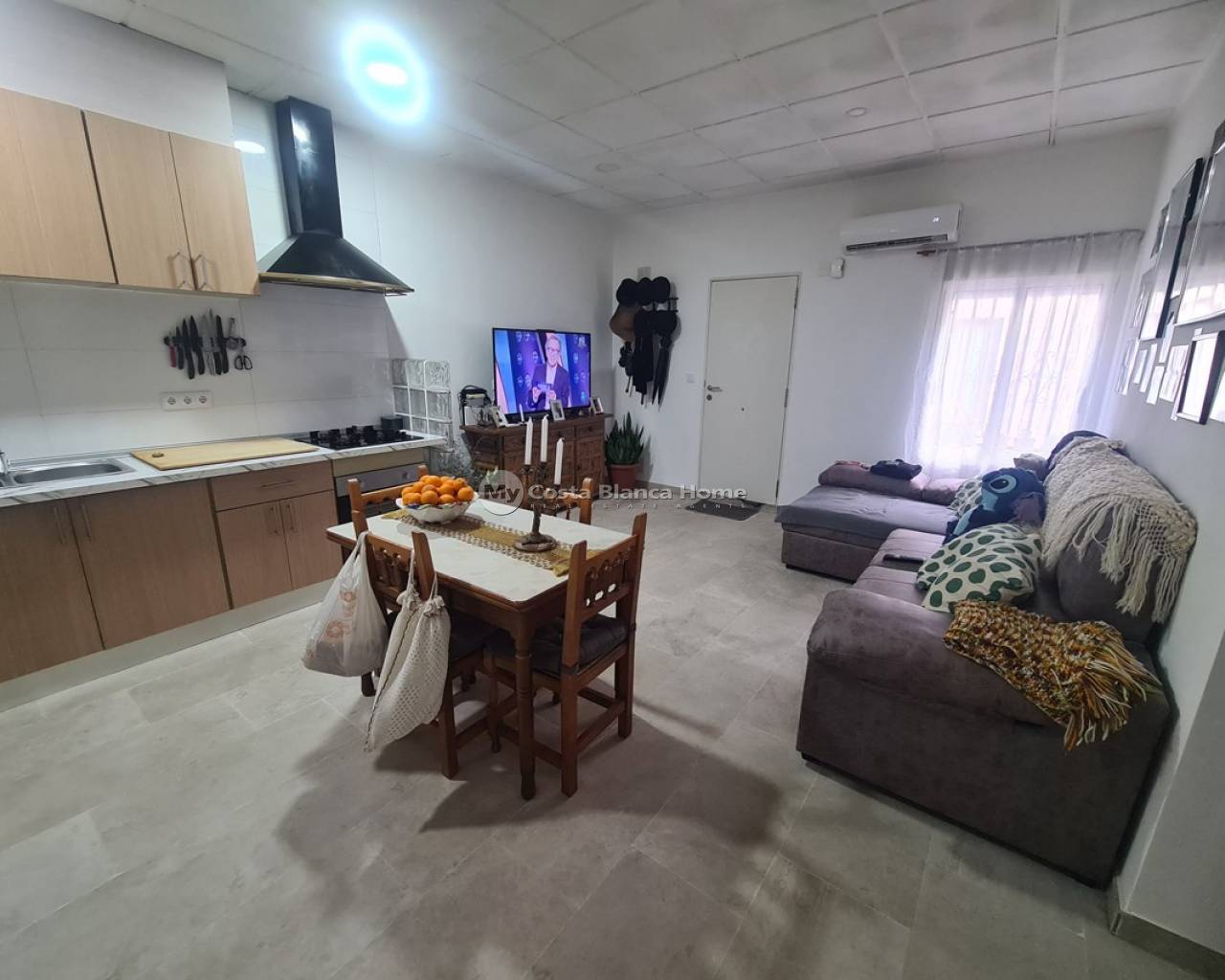 Recently renovated 120m2 terraced townhouse located just 1 minute walk from all amenities in the center of San Isidro, Albatera. The property is set over 2 floors and comprises a 30m2 air conditioned kitchen and dining room, independent living room, large air conditioned bedroom and a family bathroom. On the upper floor there are 2 further bedrooms.