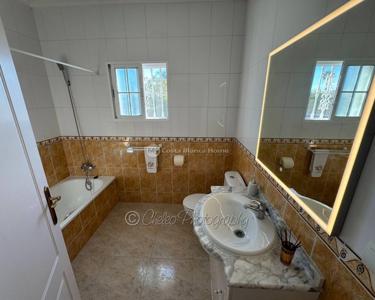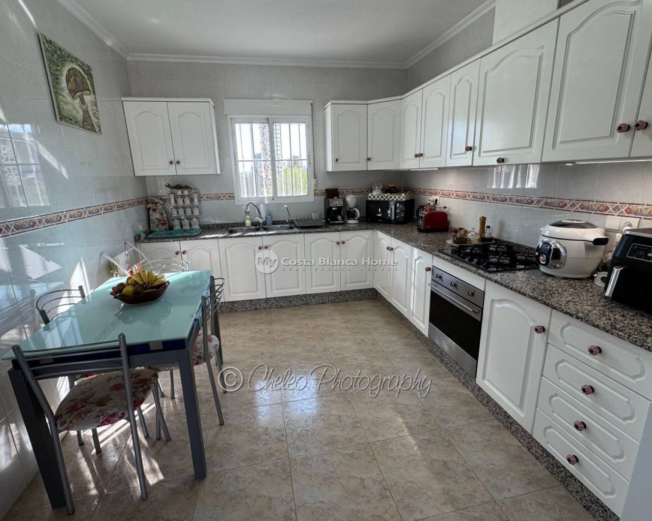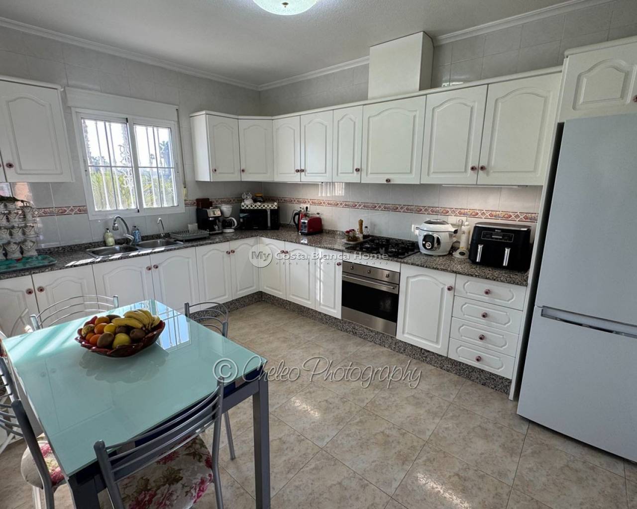 The 145m2 house consists of a very large living room with fireplace and dining area and high ceilings, 3 double bedrooms with fitted wardrobes, 2 bathrooms (one of the bedrooms en suite), 1 large and new fully equipped kitchen with utility room with outside access , large terrace and solarium.