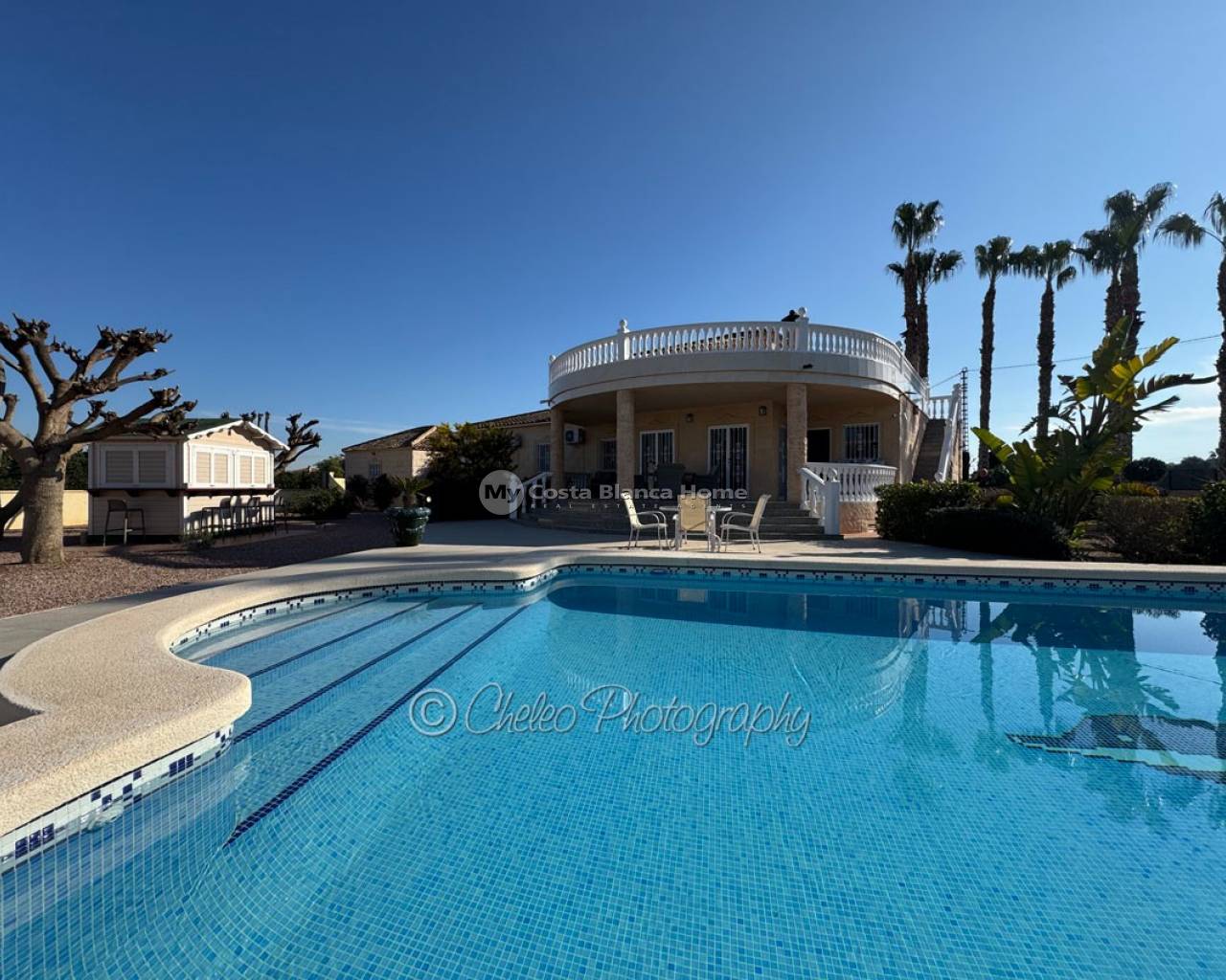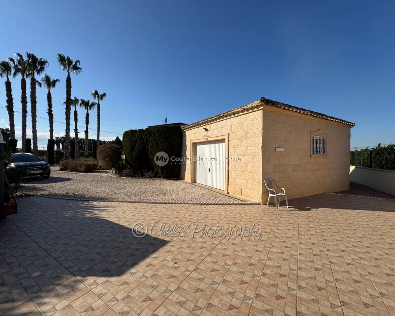 The 3000m2 plot is flat and very private. There is a wonderful garden with gravel, forming a low maintenance plot and with many plants, palm trees and fruit trees. The size of the private pool is 10m x 5m with a beautiful solar heating system and a large sun terrace. There is also a huge 46m2 garage with enough space for two cars.