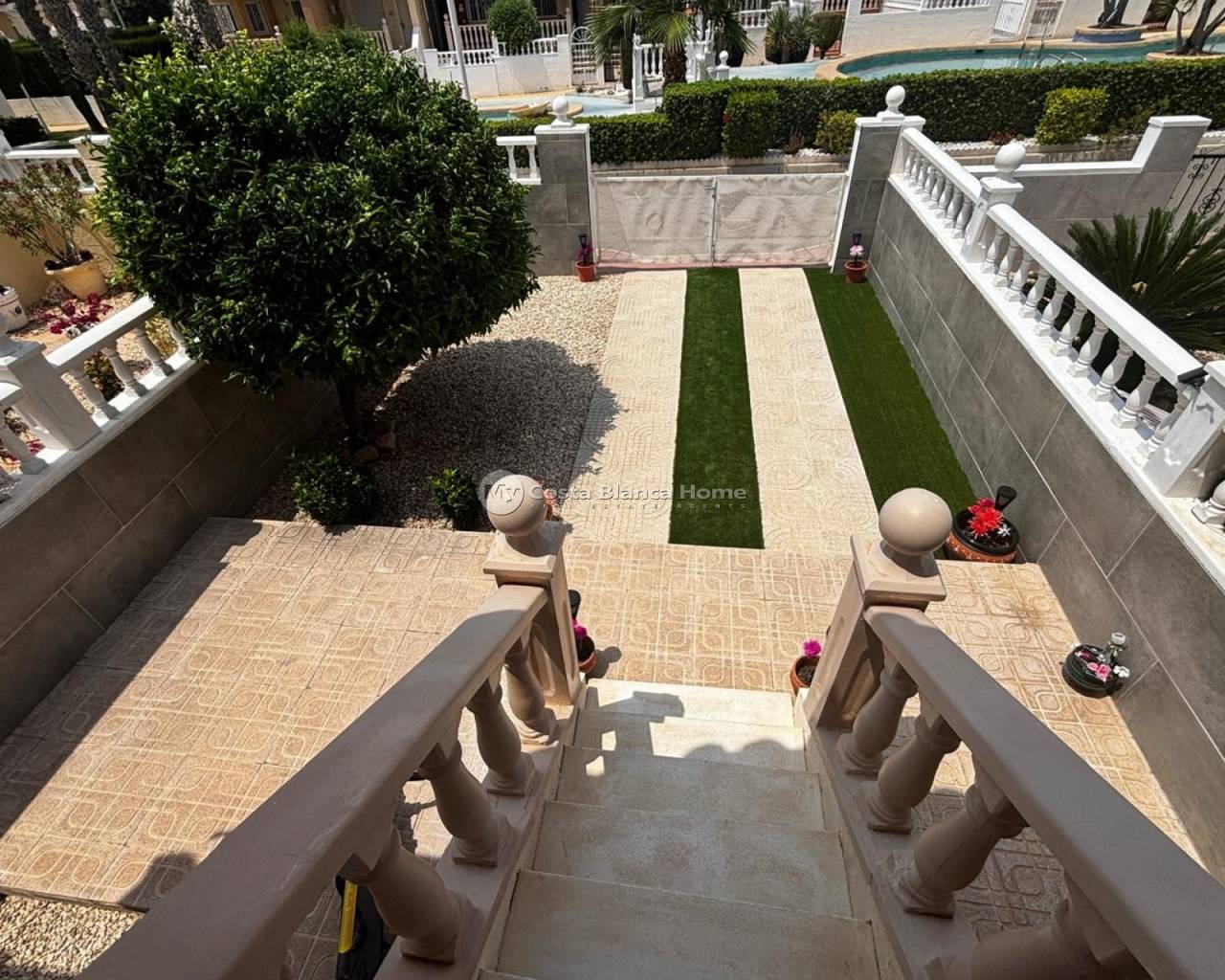 We have a beautiful 3 bedroom 2 bathroom west facing Lola style house for sale in the very popular area of Dona Pepa, part of Ciudad Quesada on the Costa Blanca. It is located close to many amenities including bars, restaurants, supermarkets and the long sandy beaches at Guardamar del Segura are just a 7 minute drive. The property is found inside a well established gated community and overlooks the beautiful swimming pool. The current owner has kept the home maintained to a high standard.The front of the property has a covered terrace with plenty of garden space and drive for car.