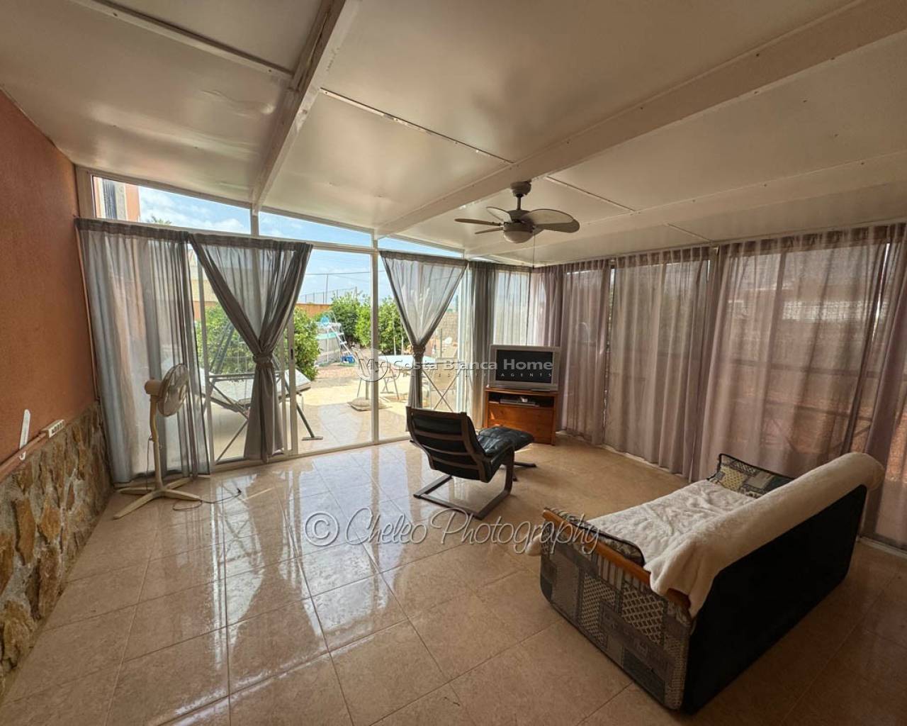 The main house comprises of a large covered porch, spacious lounge with fireplace, fitted kitchen, master bedroom with fitted wardrobes and ensuite, 2 further double bedrooms plus a family bathroom. Ducted hot and cold air conditioning is installed throughout. There is an above ground pool, a rooftop solarium, attached single garage and a conservatory. The entire plot of 1,150m2 is laid to gravel.
