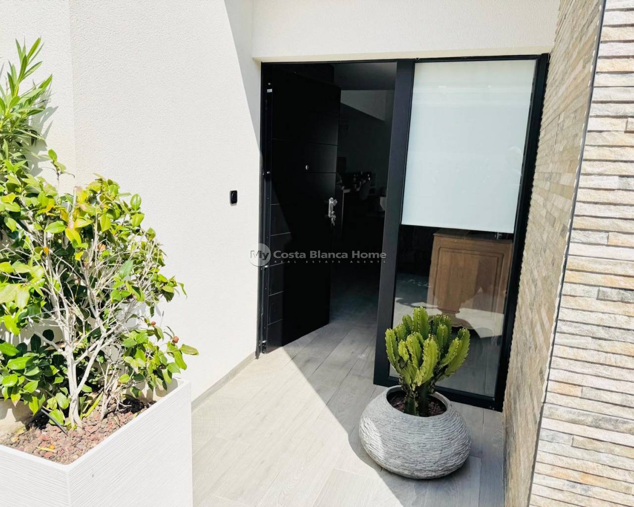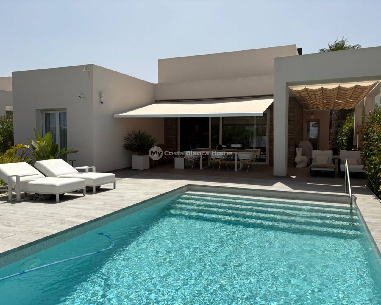 The villa offers 2 spacious bedrooms, 2 sleek bathrooms with underfloor heating, a guest toilet, and an open-plan living area filled with natural light. A third room is currently used as a dressing room or office but can easily be converted into an extra bedroom.