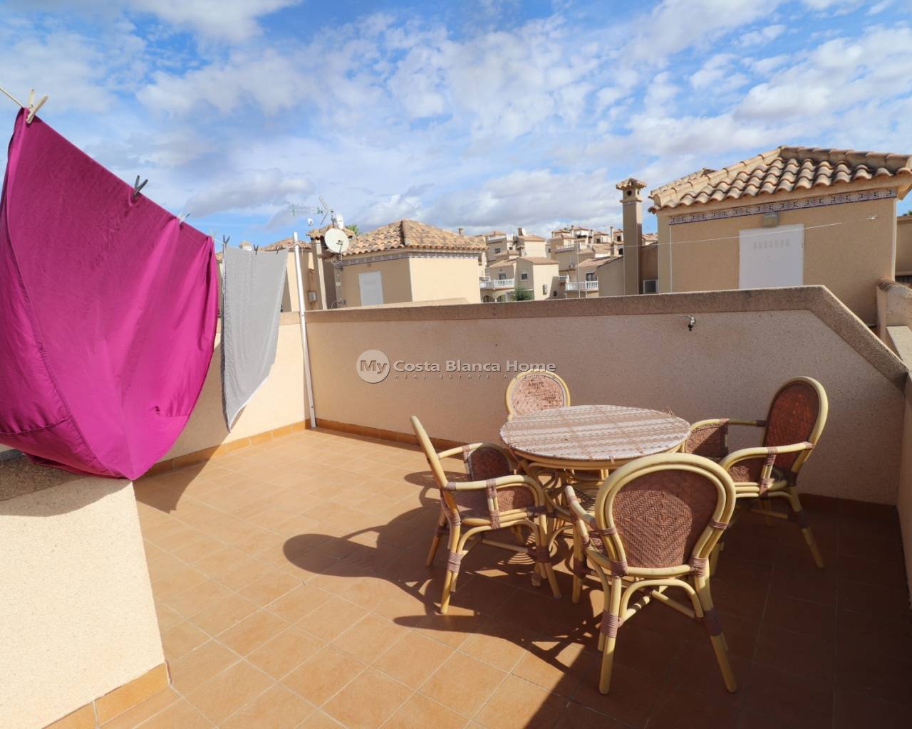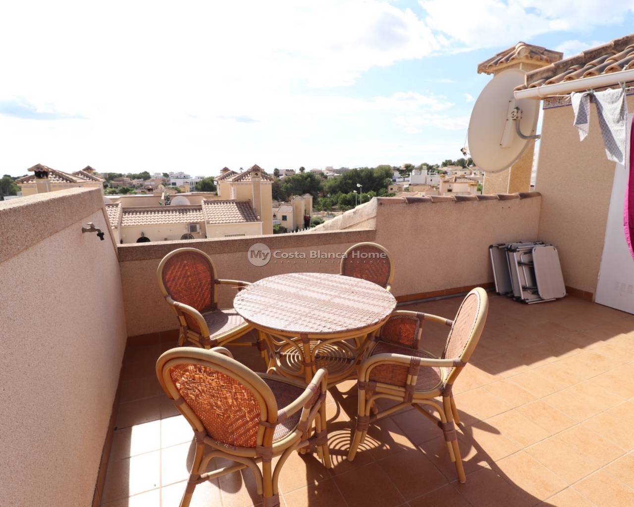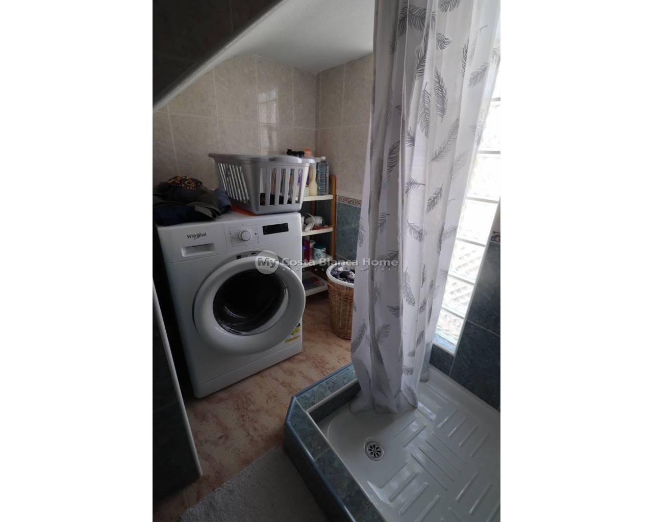 Beautiful house located in a quiet area of Las Filipinas (Orihuela Costa). The house is built on two levels. On the ground floor, there is a kitchen that opens onto the living room, a bedroom and a bathroom. Upstairs, there is a bathroom and two bedrooms, one of which has a balcony. There is also a terrace leading to the solarium, where there is a storage room. The outdoor area is pleasant with several terraces, one of which is covered, a jacuzzi, a parking space and a storage room. The house has air conditioning in the living room and in all bedrooms. Each bedroom has a built-in wardrobe. It is sold fully furnished and has a tourist licence. The complex offers a beautiful communal swimming pool. It is within walking distance of amenities, close to several golf courses, 6 km from the beautiful beaches of the Costa Blanca and 55 km from Alicante airport.