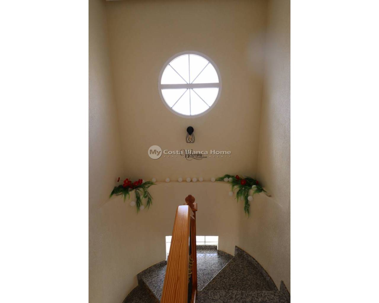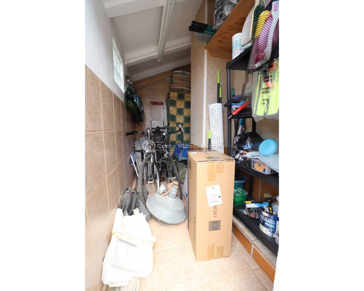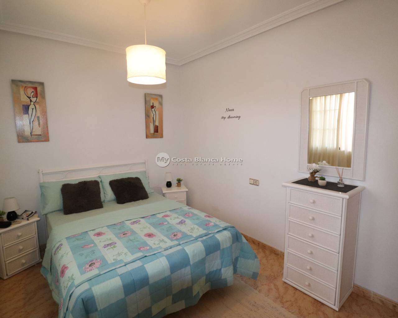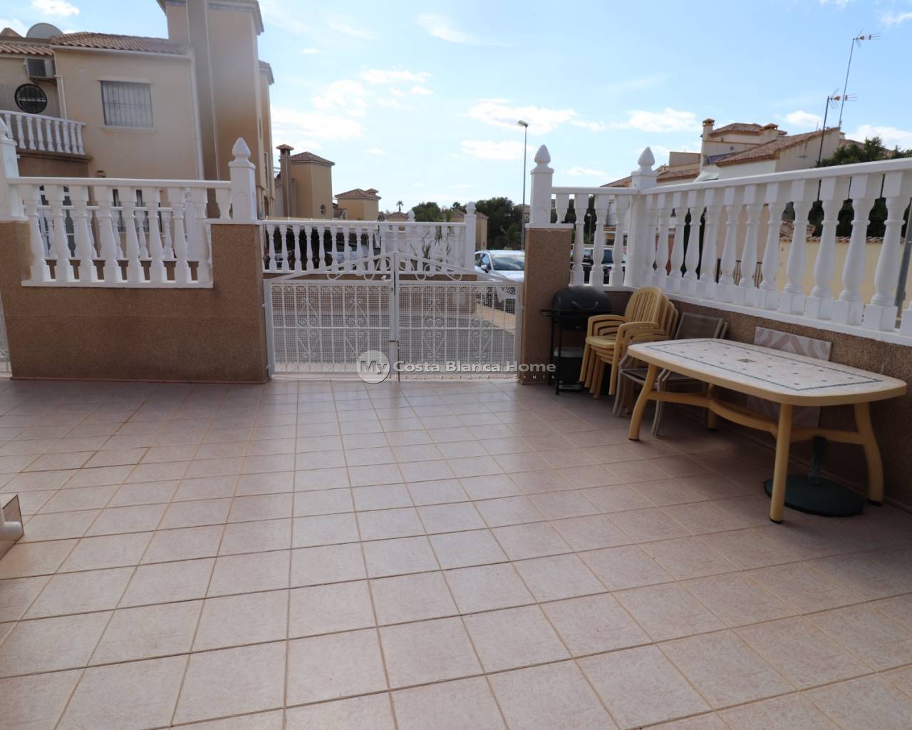 Beautiful house located in a quiet area of Las Filipinas (Orihuela Costa). The house is built on two levels. On the ground floor, there is a kitchen that opens onto the living room, a bedroom and a bathroom. Upstairs, there is a bathroom and two bedrooms, one of which has a balcony. There is also a terrace leading to the solarium, where there is a storage room. The outdoor area is pleasant with several terraces, one of which is covered, a jacuzzi, a parking space and a storage room. The house has air conditioning in the living room and in all bedrooms. Each bedroom has a built-in wardrobe. It is sold fully furnished and has a tourist licence. The complex offers a beautiful communal swimming pool. It is within walking distance of amenities, close to several golf courses, 6 km from the beautiful beaches of the Costa Blanca and 55 km from Alicante airport.