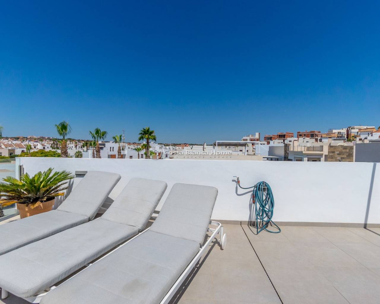 This beautiful villa, built in 2018 and in good condition, is an ideal home for those seeking comfort and a sunny lifestyle on the Costa Blanca. With a southwest orientation, you can enjoy sunny days and evenings. The property is fully furnished, making it ready for immediate occupancy. The property offers: 3 spacious bedrooms 3 modern bathrooms, each equipped with underfloor heating. Living area: 199 m² Plot: 204 m² Terraces: The villa boasts several private outdoor spaces: The master bedroom has a private terrace of 6.58 m². Additionally, there is a spacious roof terrace of 47.06 m² offering extra outdoor space and opportunities for sunbathing and enjoying the views. This also features an outdoor kitchen with running water. Heated private pool for year-round enjoyment Private parking with space for 2 cars Interior and layout: On the ground floor, you will find an open-plan living room and kitchen, perfect for socializing. From this floor, you also have direct access to the pool and the outdoor area below, making it easy to enjoy sunny days. This floor also features one bathroom. Further up on the first floor , you will find three bedrooms and two bathrooms. The master bedroom has its own en-suite bathroom, providing additional privacy and comfort. From the first floor, there is also access to the fantastic roof terrace. Facilities and features include: Sea view and pool view Alarm system and reinforced door for increased security Outdoor and indoor lighting Electric shutters Central air conditioning and central heating Intercom Storage room Built-in wardrobes Access to common green areas and a communal pool (in addition to the private one) The Villamartín Area Villamartín is a well-developed and cosmopolitan urbanization on the Southern Costa Blanca, known for its vibrant community and excellent facilities. The area boasts around 320 sunny days a year and an average annual temperature of approximately 20°C, contributing to a pleasant Mediterranean climate year-round. Villamartín is a paradise for golf enthusiasts. Here you will find the historic Villamartín Golf Course, opened in 1972 and designed by Robert Dean Puttman. This 18-hole course (par 72) is recognized as one of the best in the region and has even hosted qualifying rounds for the European Tour. The course is characterized by mature vegetation and offers fantastic sea views. The clubhouse restaurant also has a rooftop terrace with excellent views of the 18th hole. In addition to Villamartín Golf, there are several other renowned golf courses in the immediate vicinity, including Las Ramblas Golf, Las Colinas Golf & Country Club, La Finca Golf, and Lo Romero Golf. The area is also known for its lively atmosphere with a variety of restaurants, bars, and shops. The famous Villamartín Plaza is a popular meeting point with a wide selection of dining and entertainment options. Large shopping centers like Zenia Boulevard are also nearby. The beautiful beaches along Orihuela Costa, including "Blue Flag" beaches such as La Zenia, Playa Flamenca, and Cabo Roig, are just a short drive away. This villa is perfect for those seeking a combination of privacy, golf, and easy access to all that Villamartín and the Costa Blanca have to offer.