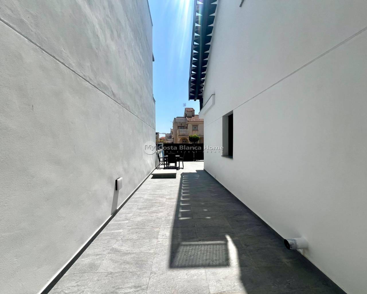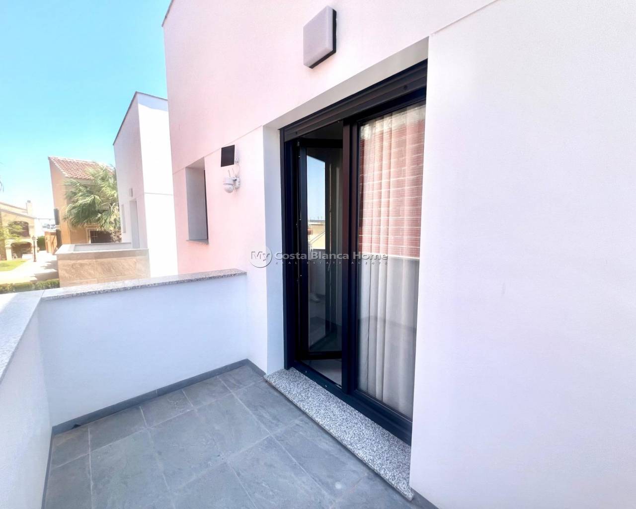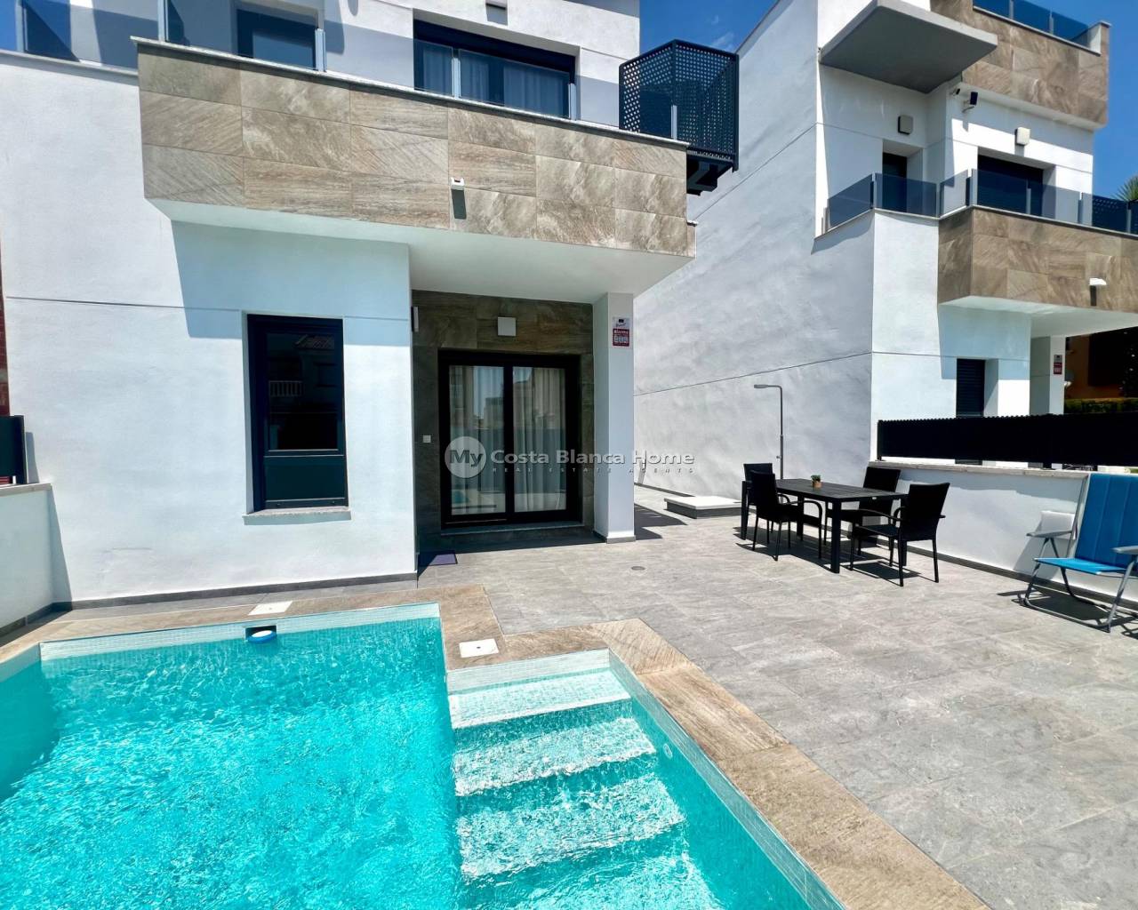 Detached villa with private pool and solarium overlooking the pink lake~~Discover this fantastic detached villa with a private pool, located in a quiet area surrounded by nature—perfect for those seeking comfort, privacy, and a Mediterranean lifestyle.~~Built on a 116 m² plot, the property is distributed over two floors with a total of 106 m² built.~~The ground floor features a bright living-dining area with an open-plan kitchen, one double bedroom, and a full bathroom—everything you need to live comfortably on one level.~~Upstairs, you’ll find two spacious bedrooms, each with its own en-suite bathroom, and direct access to a spectacular solarium with open views of Torrevieja’s famous pink salt lake—one of the area’s most iconic natural landmarks.~~The outdoor space is fully tiled for low maintenance and maximum enjoyment. The private pool is the perfect place to relax, sunbathe, or enjoy time with friends and family.~~Furniture is not included in the price, but can be purchased separately.~~A unique property, full of style and character, ideal for those looking for a modern and functional home close to everything, yet surrounded by peace and nature.