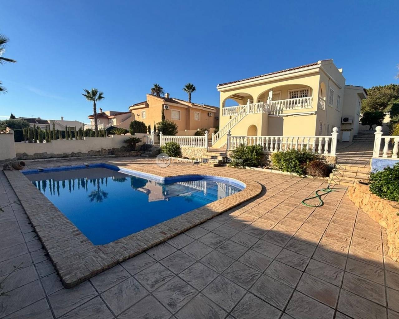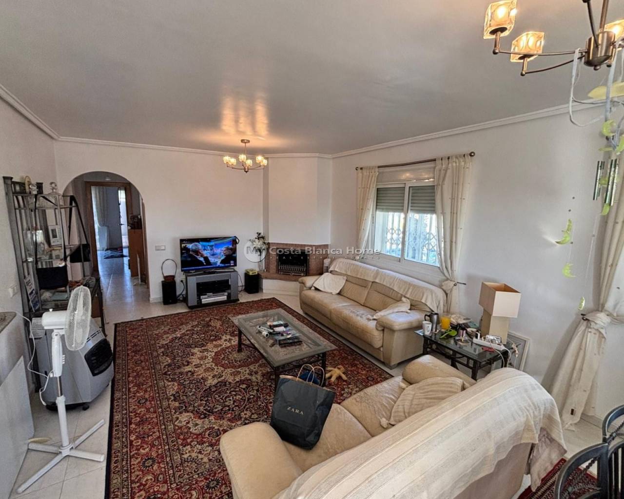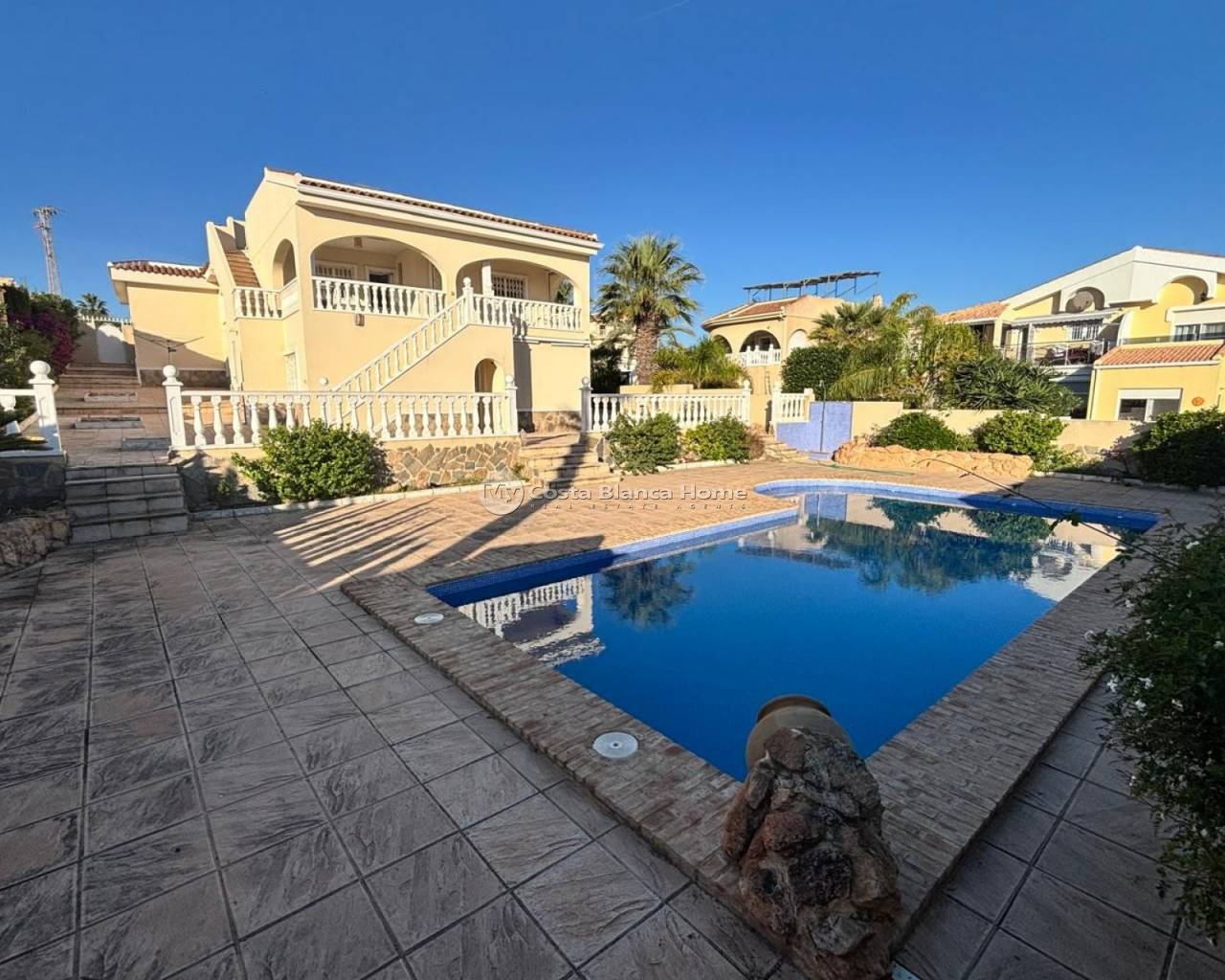 Here we have this amazing villa on the sought after area of La Fiesta. The property is set over 2 levels. Top level has 3 double bedrooms 2 bathrooms one being an en-suite, lounge and kitchen. There is a large covered terrace with views to the stunning swimming pool. Down stairs via a separate entrance is a self contained apartment with 2 double bedrooms bathroom separate lounge and kitchen. The property is set on a large plot with plenty of terraces and a large private pool. Complete with garage solarium with views to the lakes. Being offered mainly furnished.